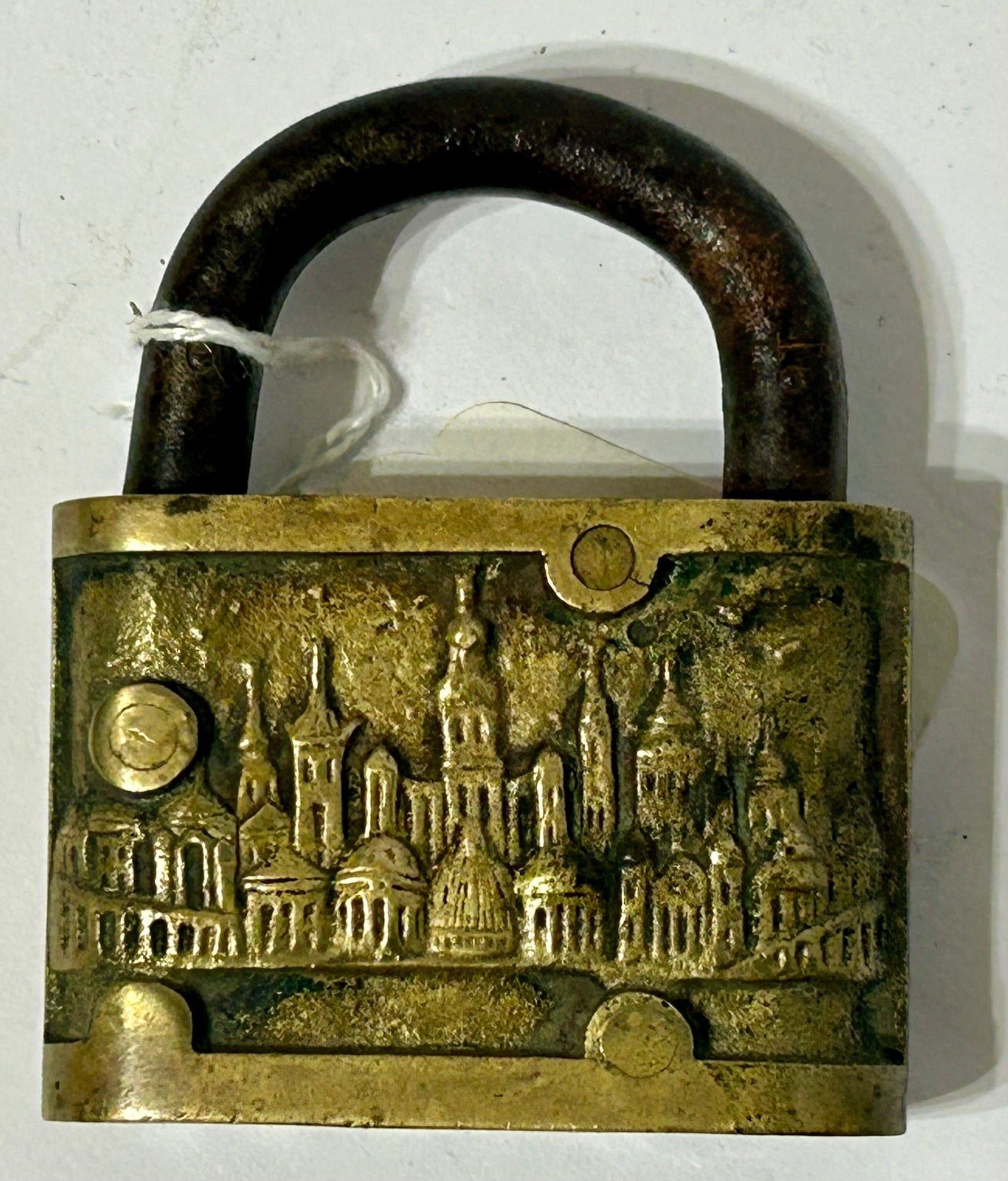 1904 MISSOURI WORLDS FAIR FANCY BRASS PADLOCK IN GOOD CONDITION 2" X 2 1/2" TALL. CALL OR TEXT FOR MORE INFORMATION
