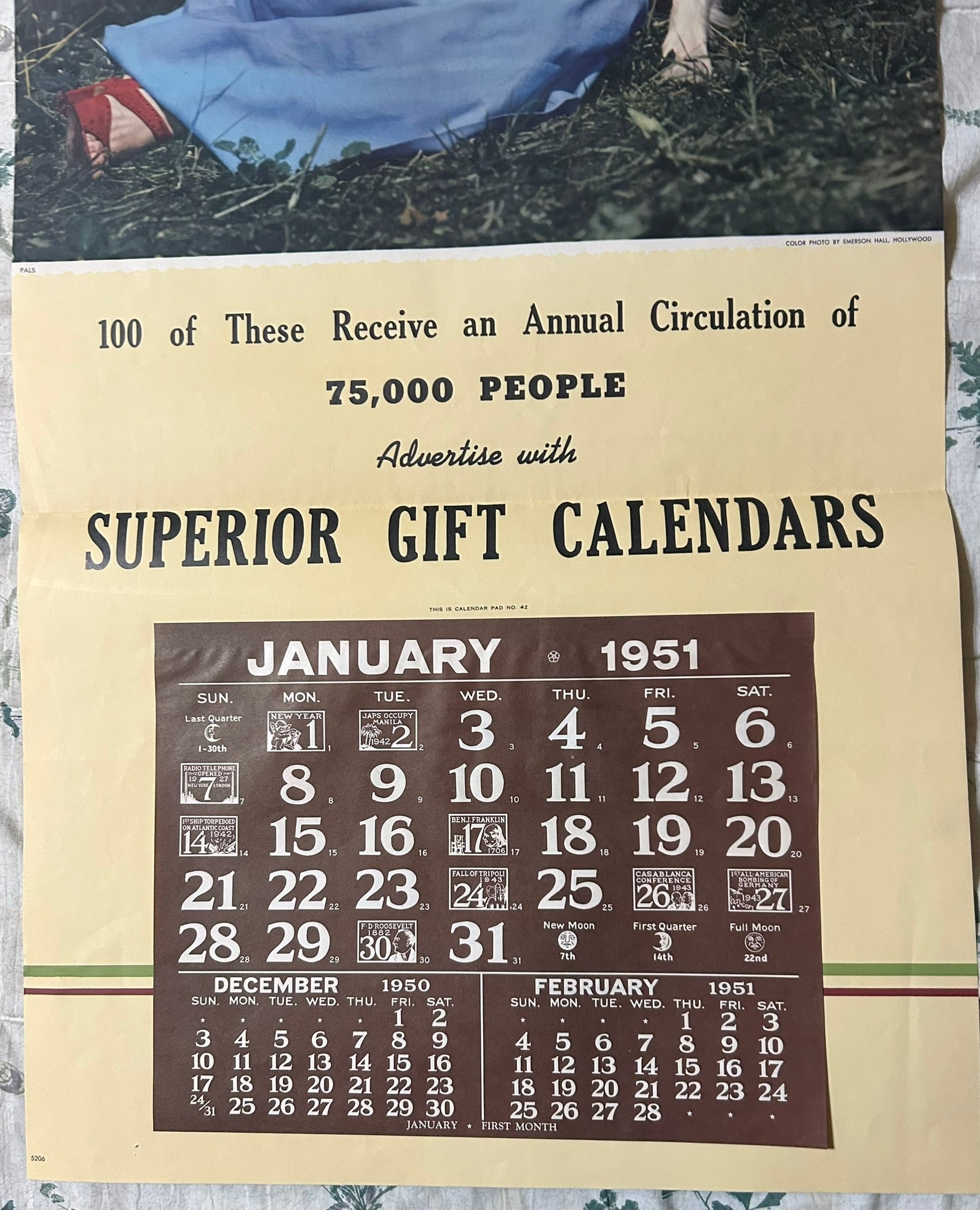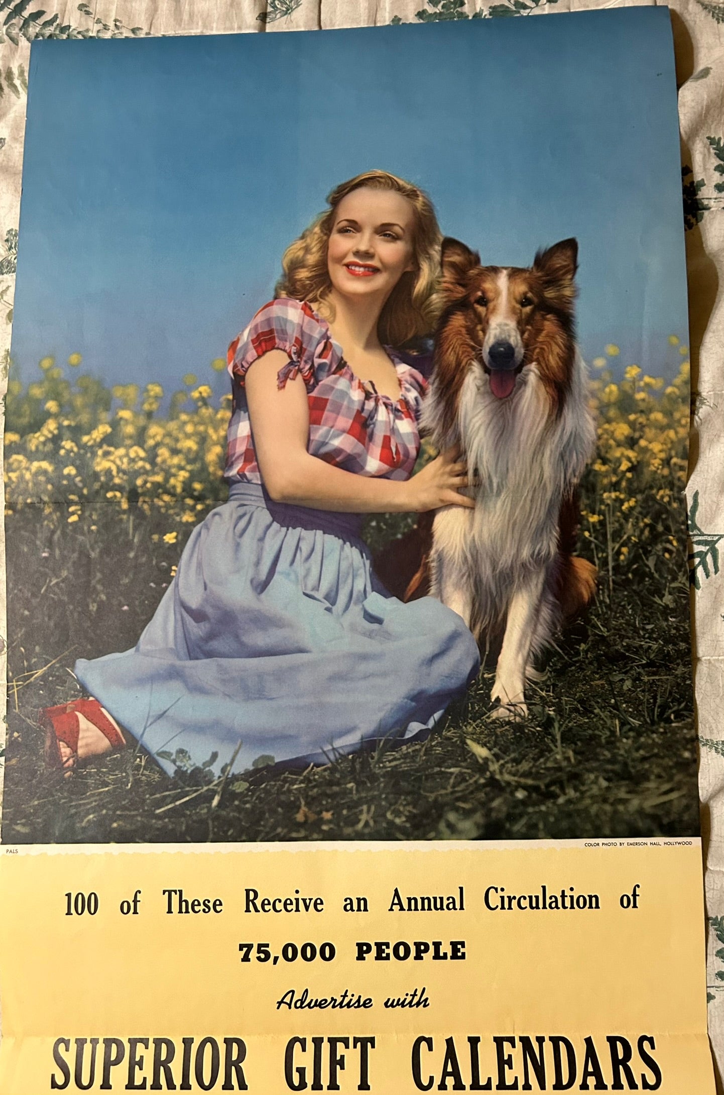 1951 ADVERTISING CALENDAR WITH PRETTY WOMAN AND COLLIE DOG 45" X 20". CALL OR TEXT FOR MORE INFORMATION
