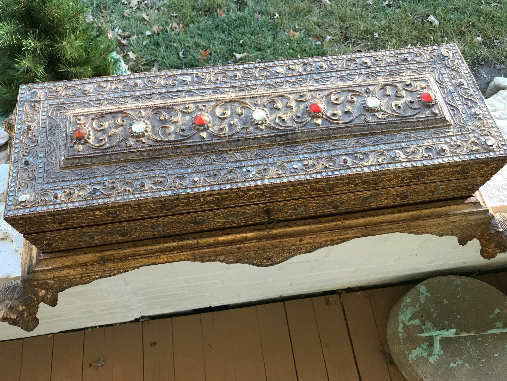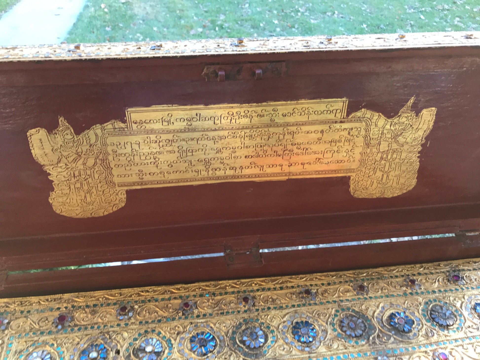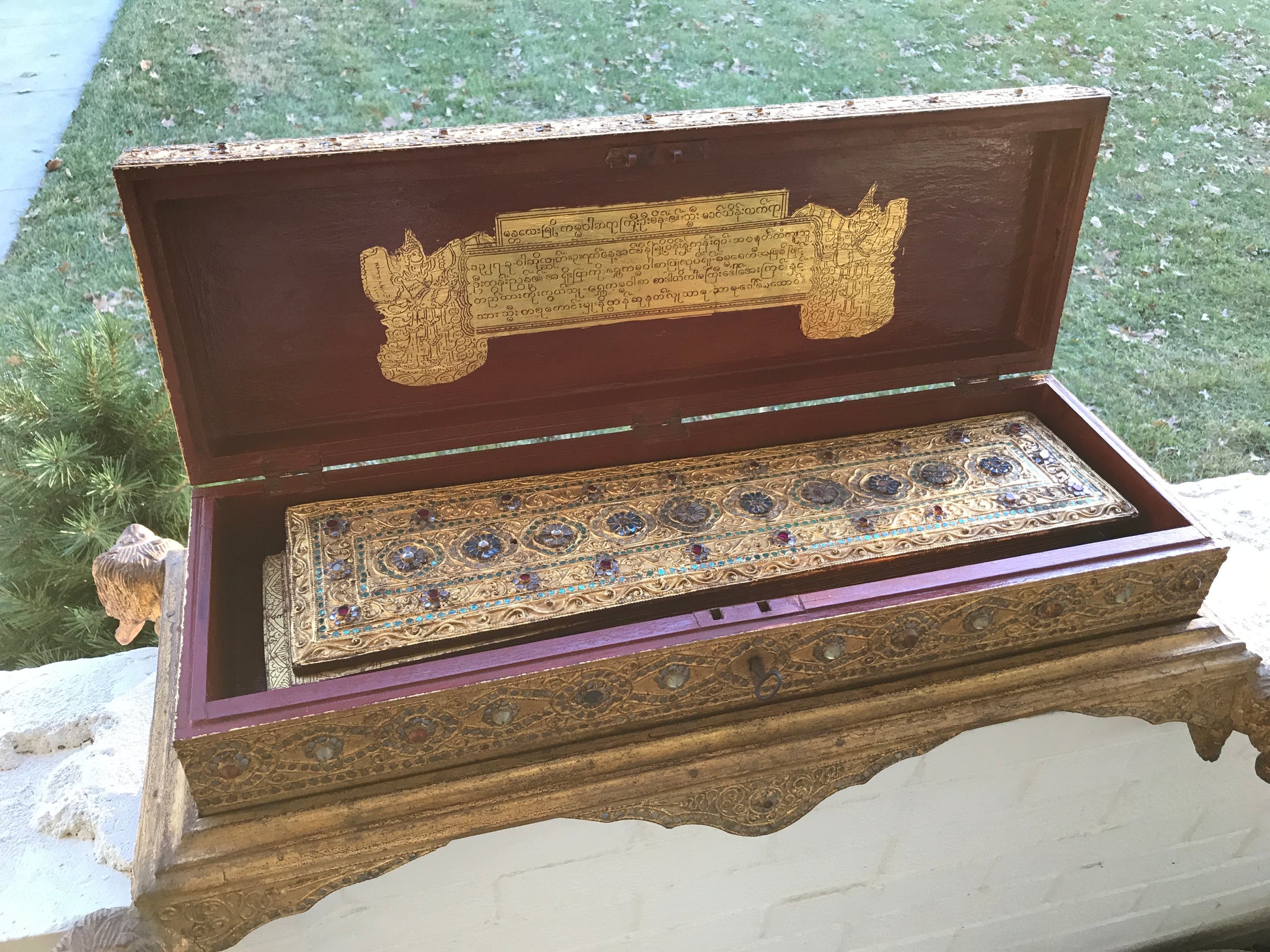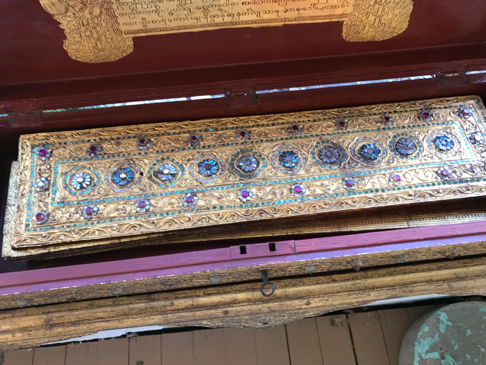 19TH CENTURY KAMMAVACA MANUSCRIPT IN JEWELED AND MOSAIC GILT BOX 33" LONG X 10" TALL. CALL, TEXT, OR E-MAIL FOR MORE INFORMATION