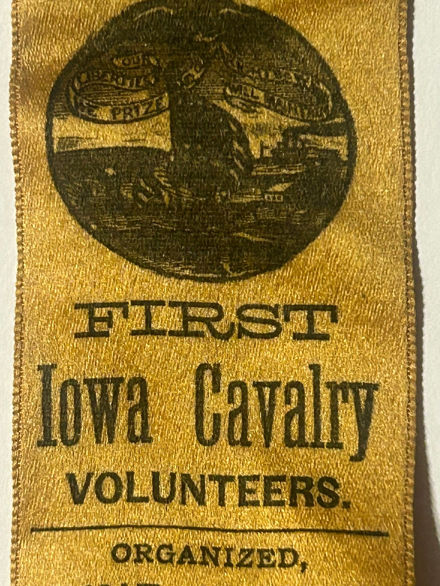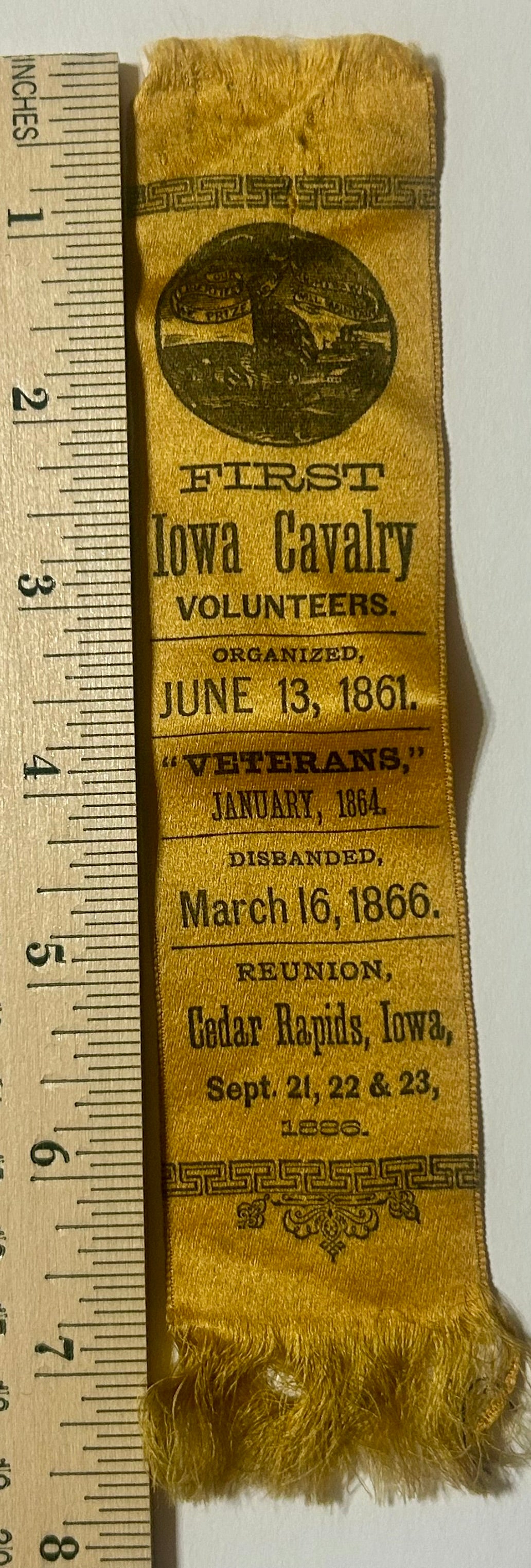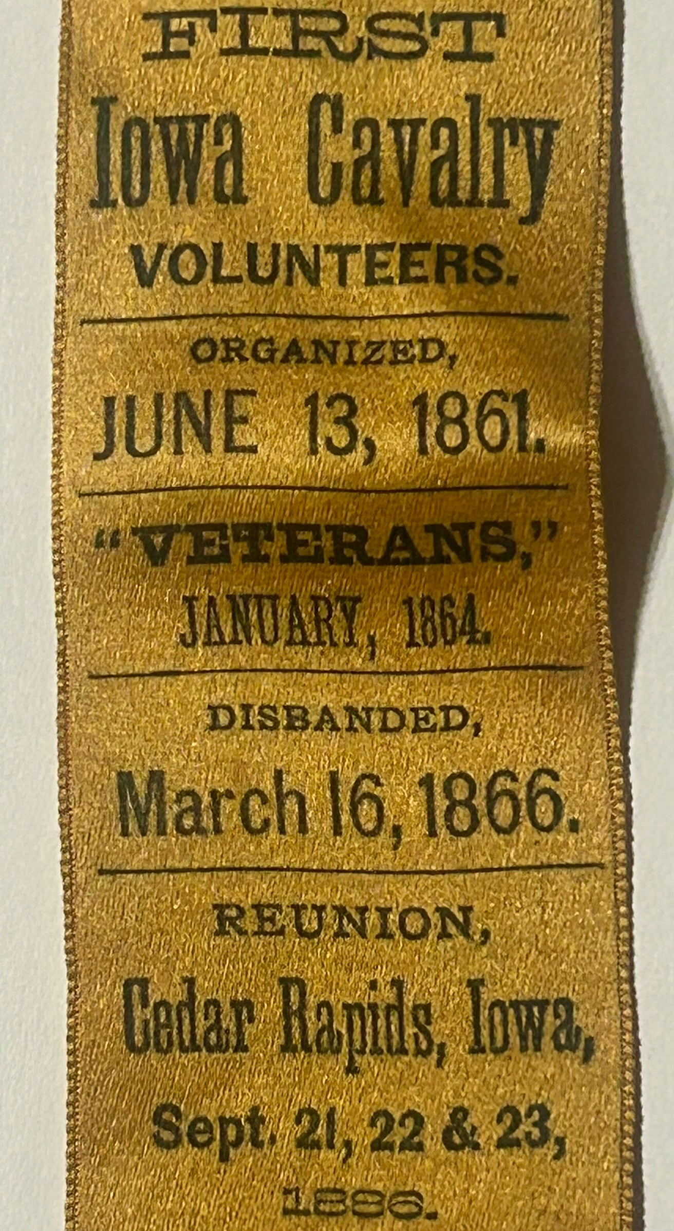 1ST IOWA CAVALRY VOLUNTEERS 1886 REUNION RIBBON 7 1/2" LONG. CALL OR TEXT FOR MORE INFORMATION