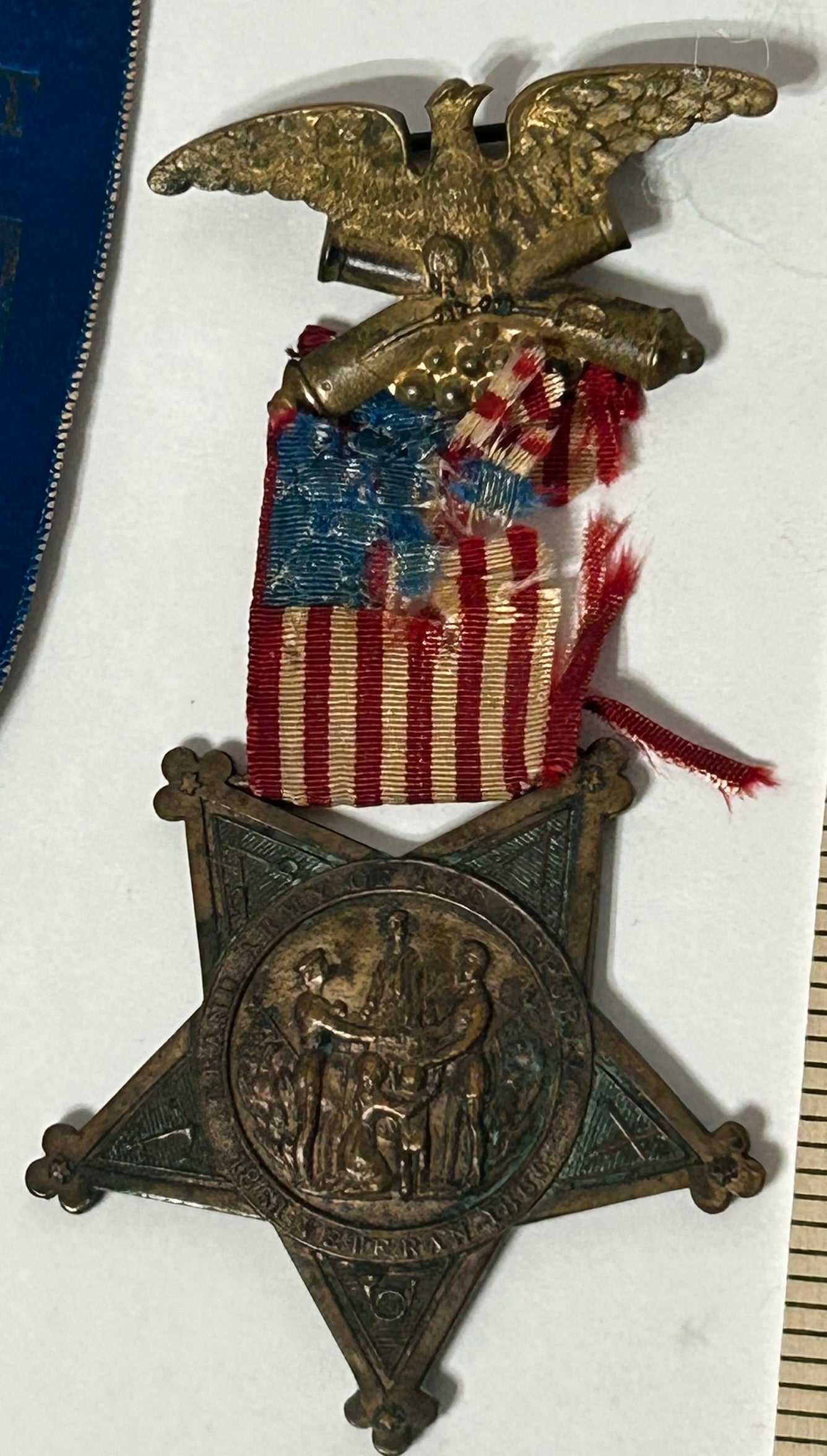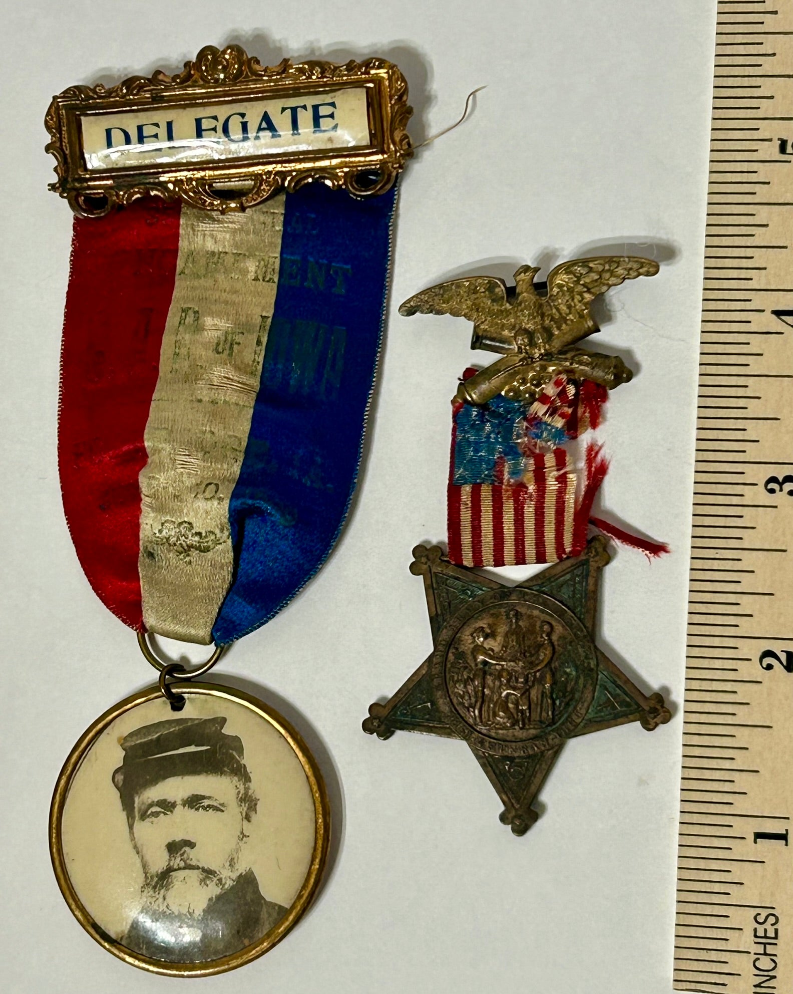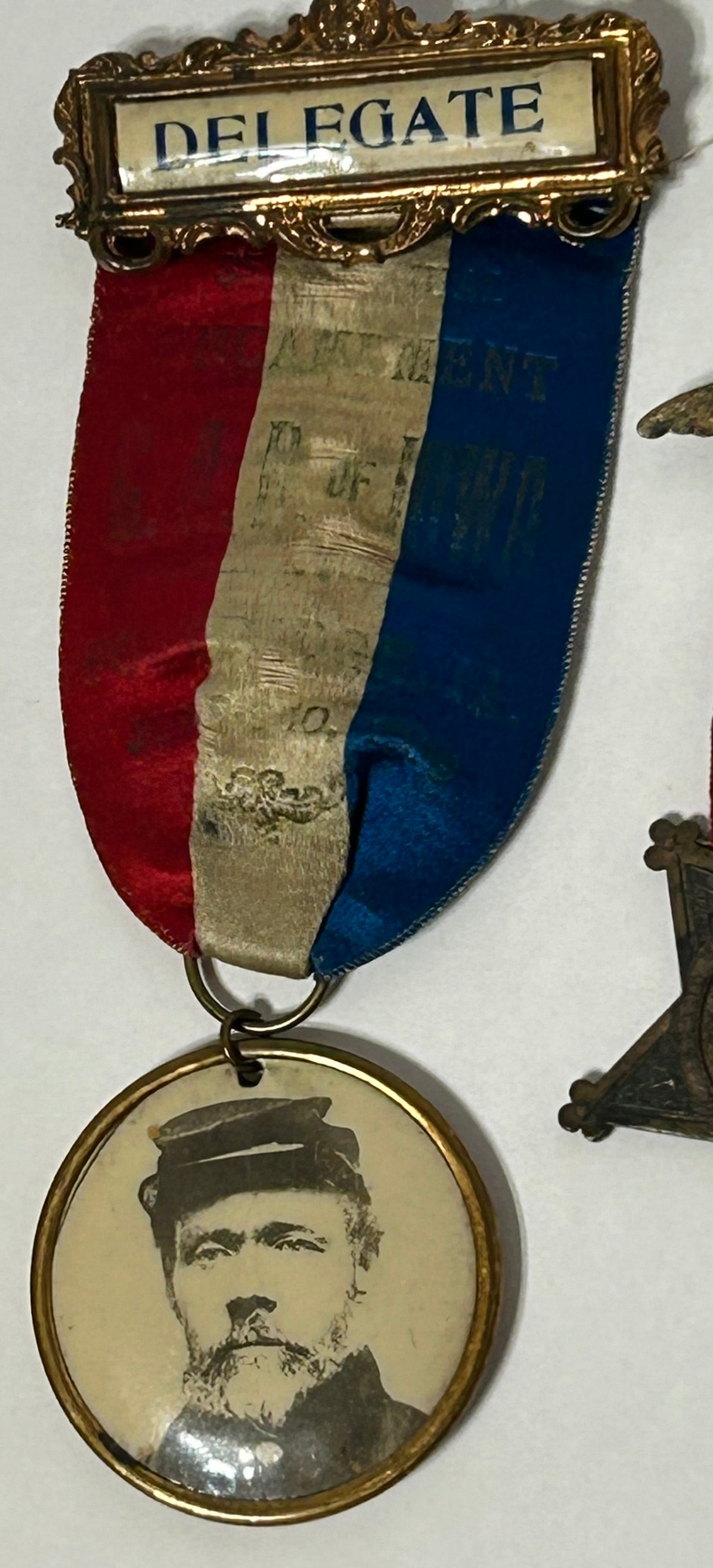 32ND IOWA MAJOR JONATHAN HUTCHISON ENCAMPMENT BADGE AND NUMBERED G.A.R. BADGE. CALL OR TEXT FOR MORE INFORMATION