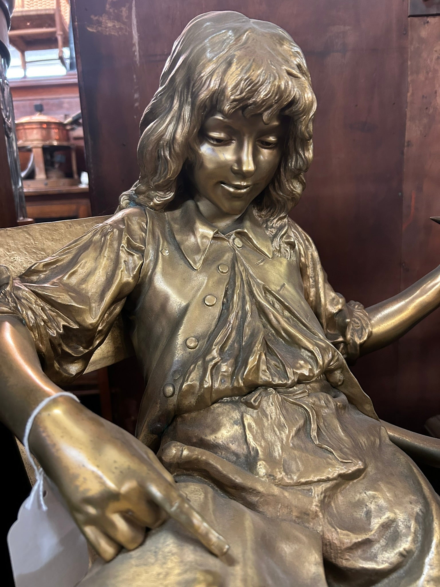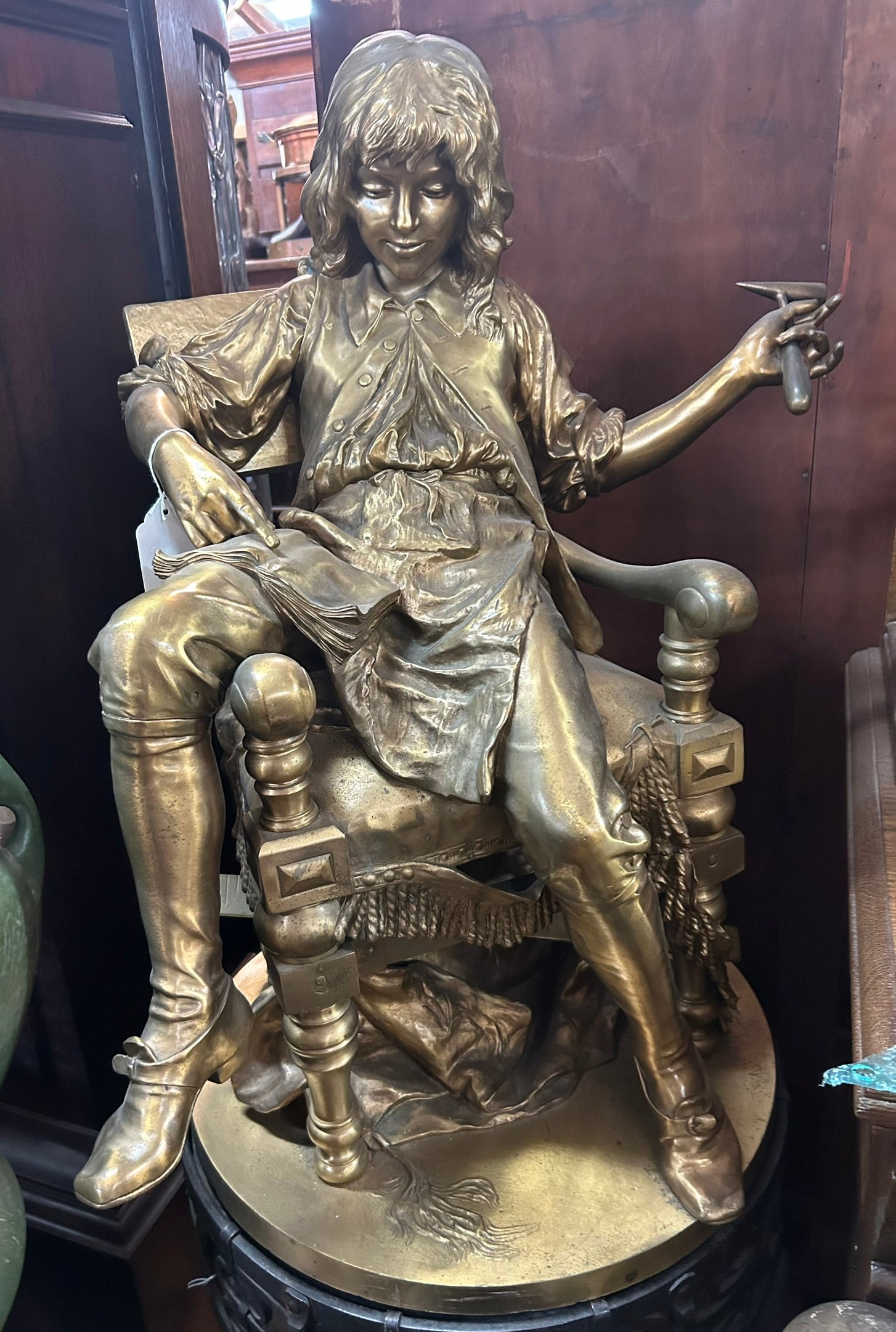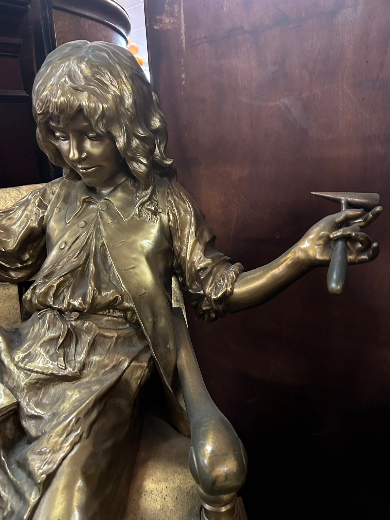 ADRIEN ETIENNE GAUDEZ 1845-1902 30" BRONZE SCULPTURE OF "THE UPHOLSTER'S APPRENTICE" FRENCH. CALL, TEXT, OR E-MAIL FOR MORE INFORMATION.