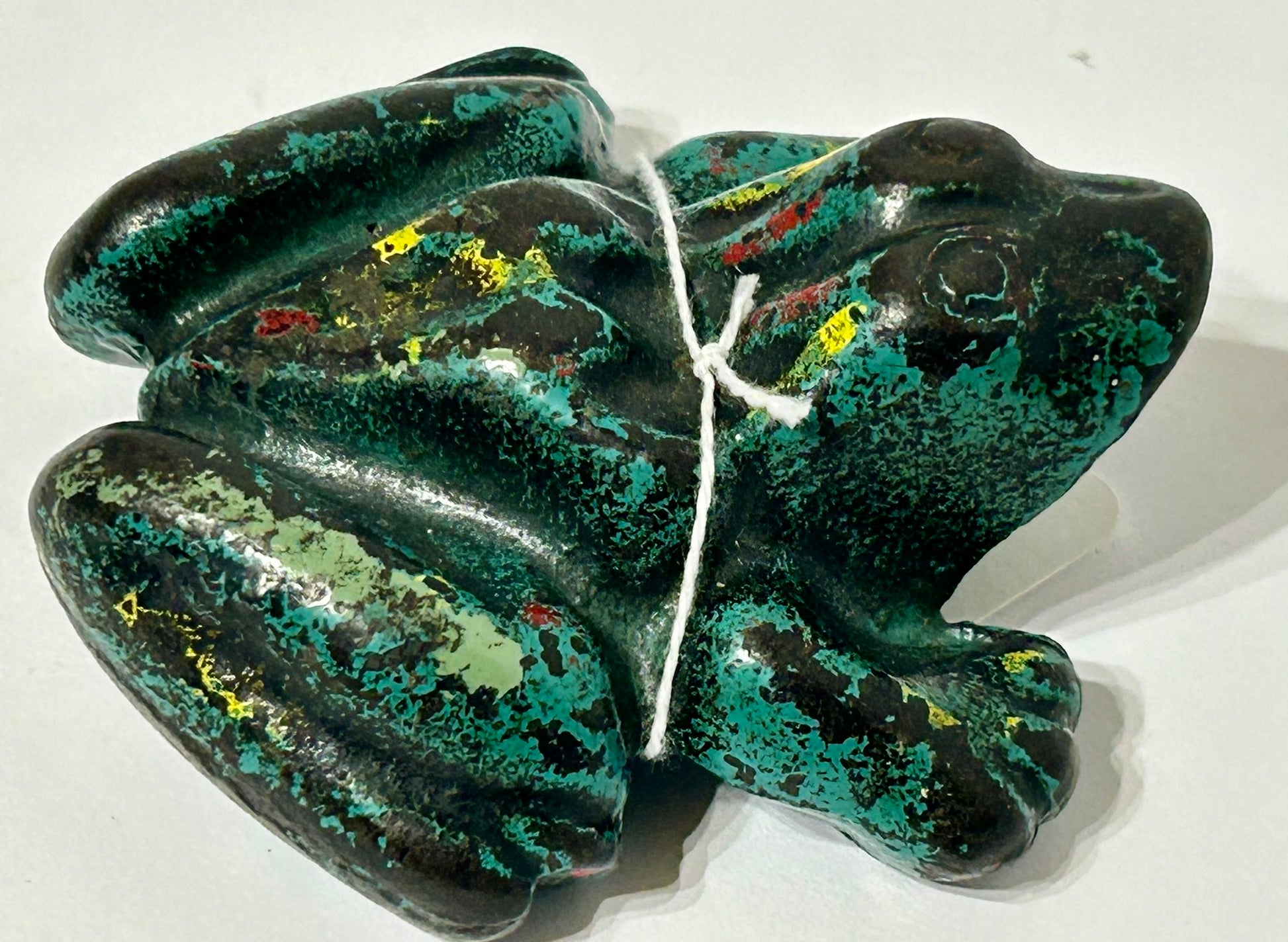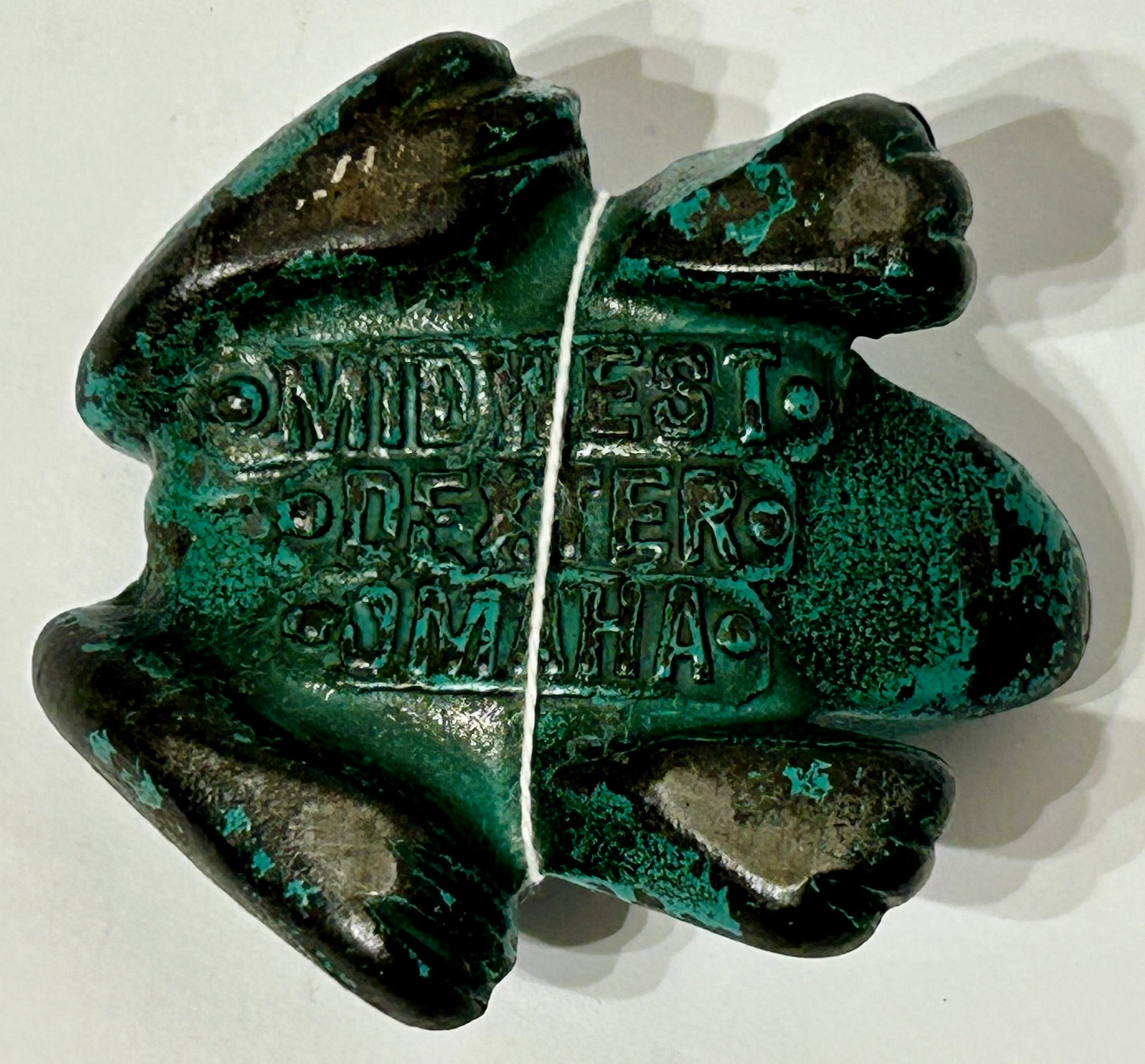 ADVERTISING CAST IRON FIGURAL FROG ADVERTISING DEXTER MIDWEST OMAHA 3" LONG X 2" TALL. CALL OR TEXT FOR MORE INFORMATION