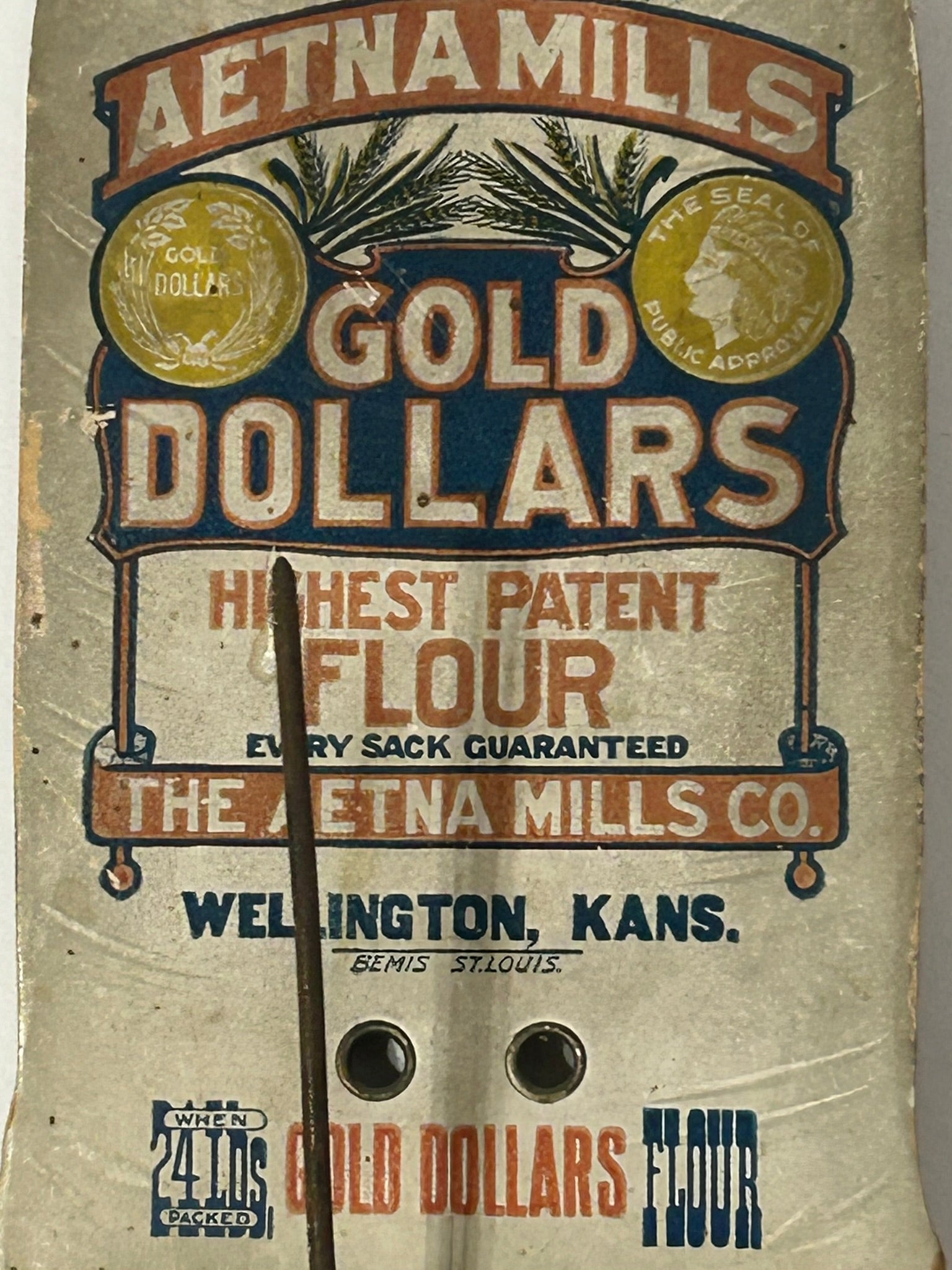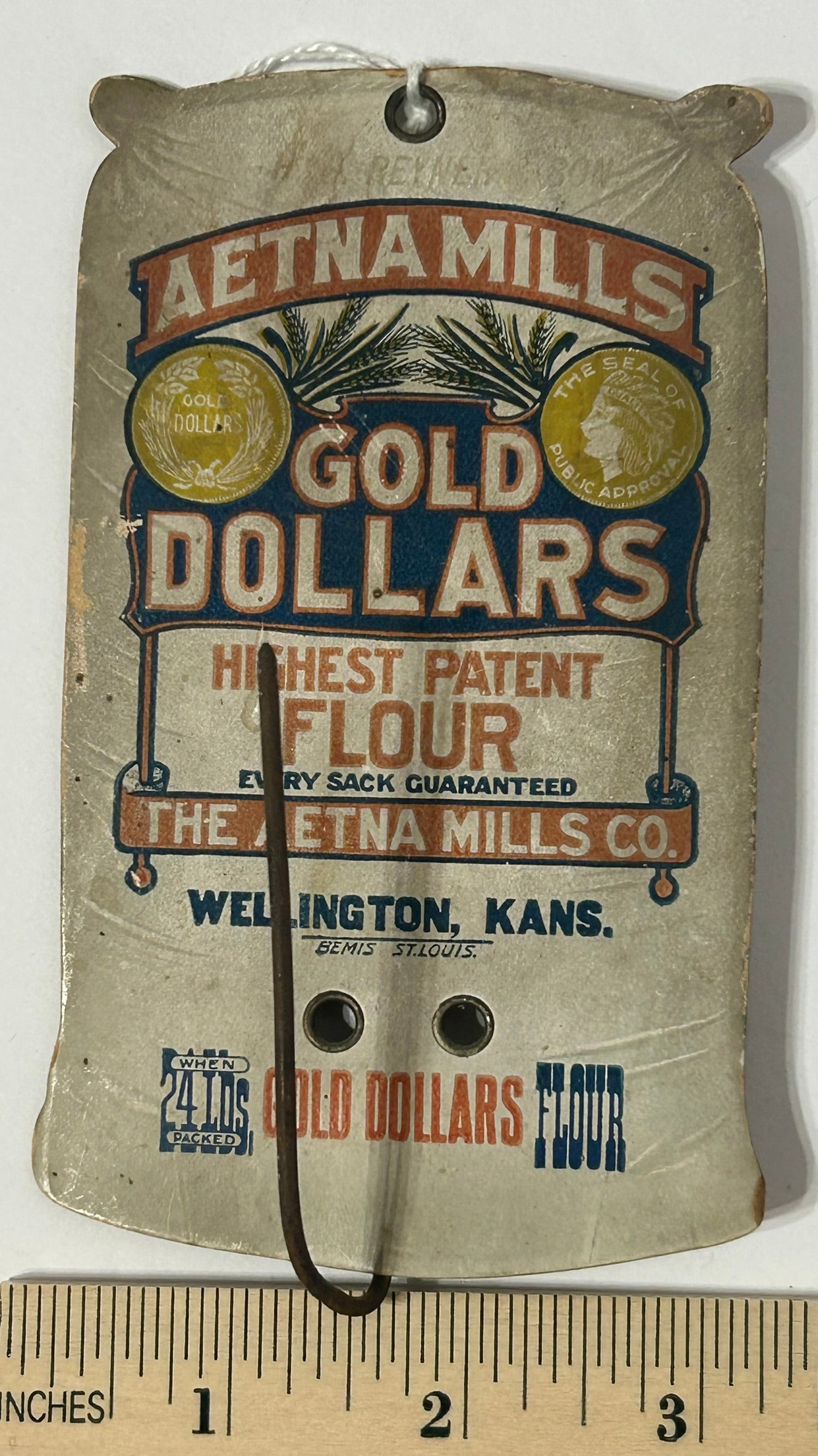 ADVERTISING FOLDING ADVERTISING CARDBOARD BILL HOOK FOR AETNA MILLS GOLD DOLLARS FLOUR WELLINGTON, KANSAS 5 1/4" TALL. CALL OR TEXT FOR MORE INFORMATION