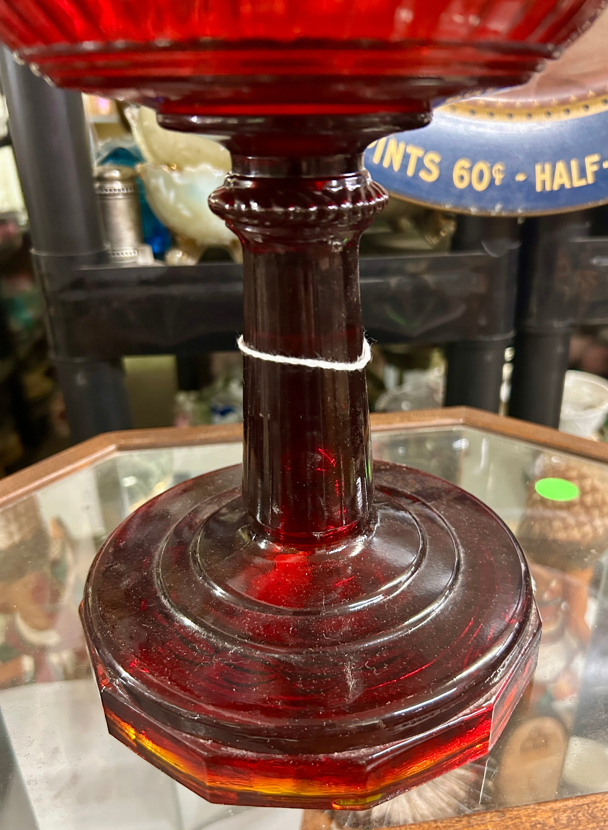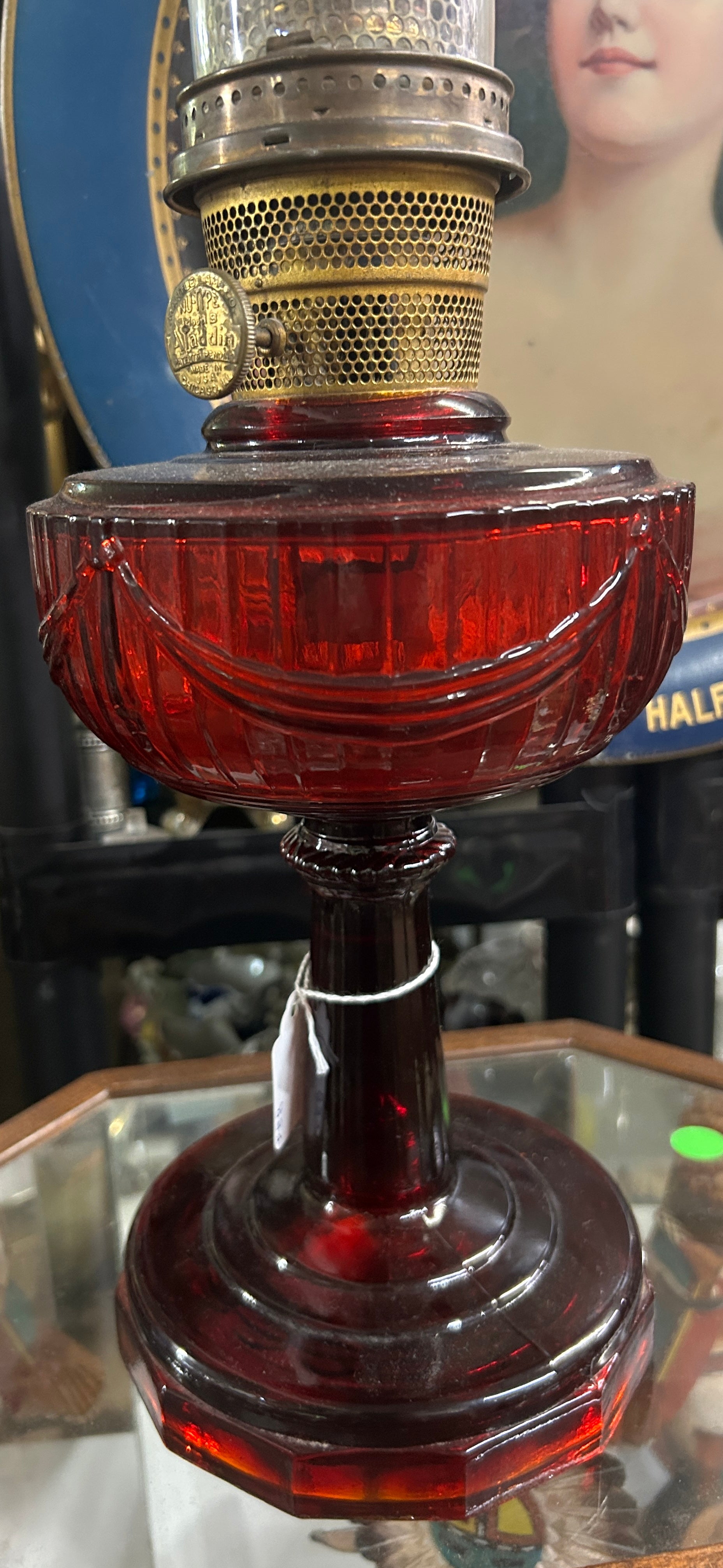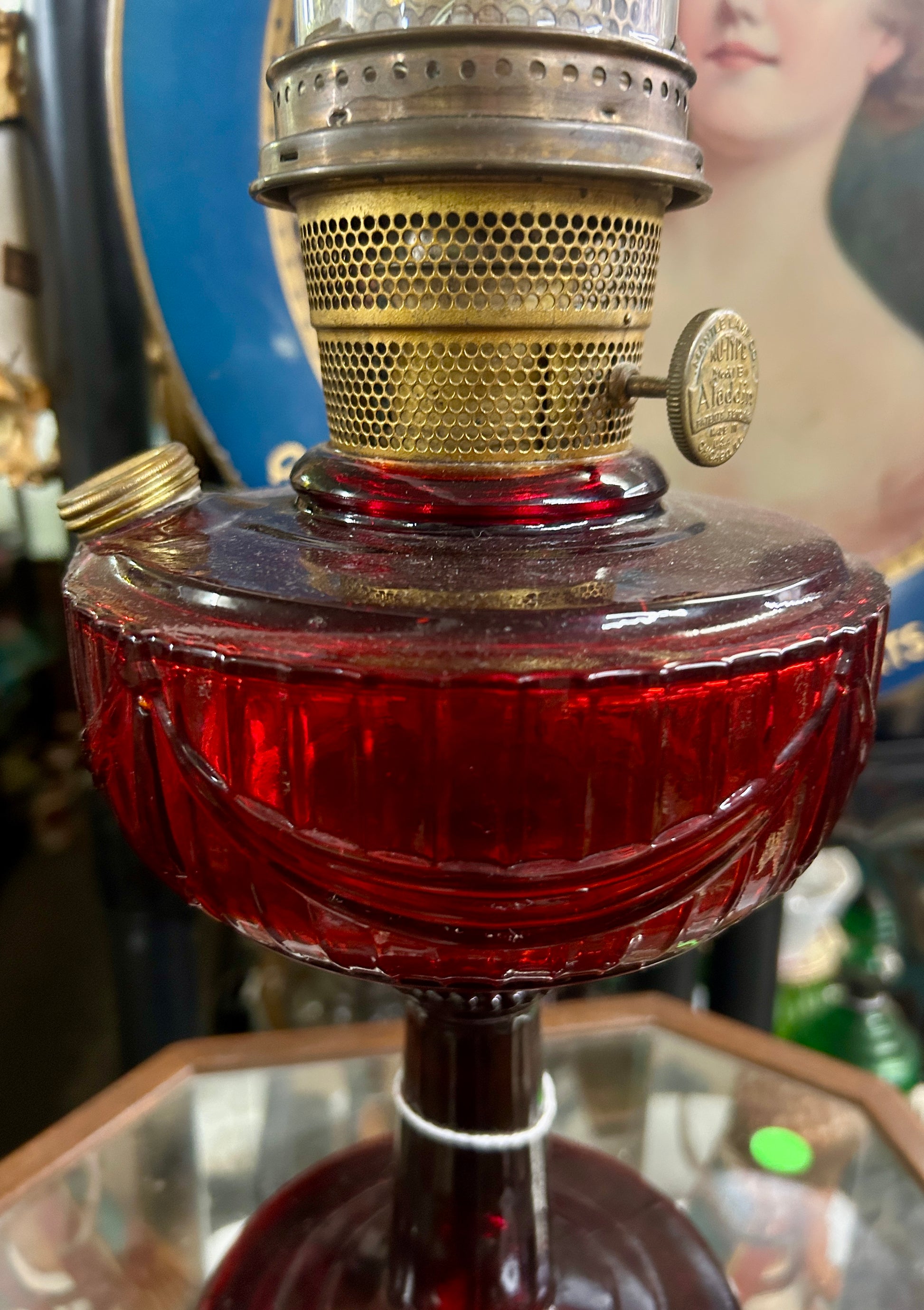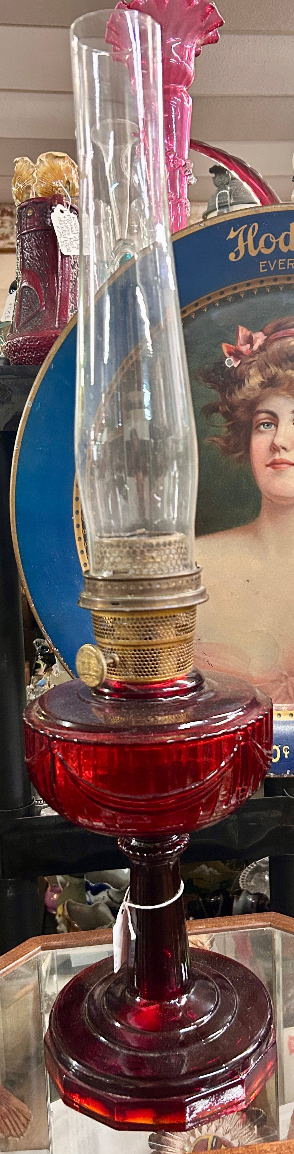 ALADDIN LAMP RUBY RED TALL LINCOLN DRAPE LAMP WITH AMBERINA BOTTOM EDGE 25" TALL TO TOP OF CHIMNEY AND 13 1/2" TALL WITHOUT. CALL OR TEXT FOR MORE INFORMATION