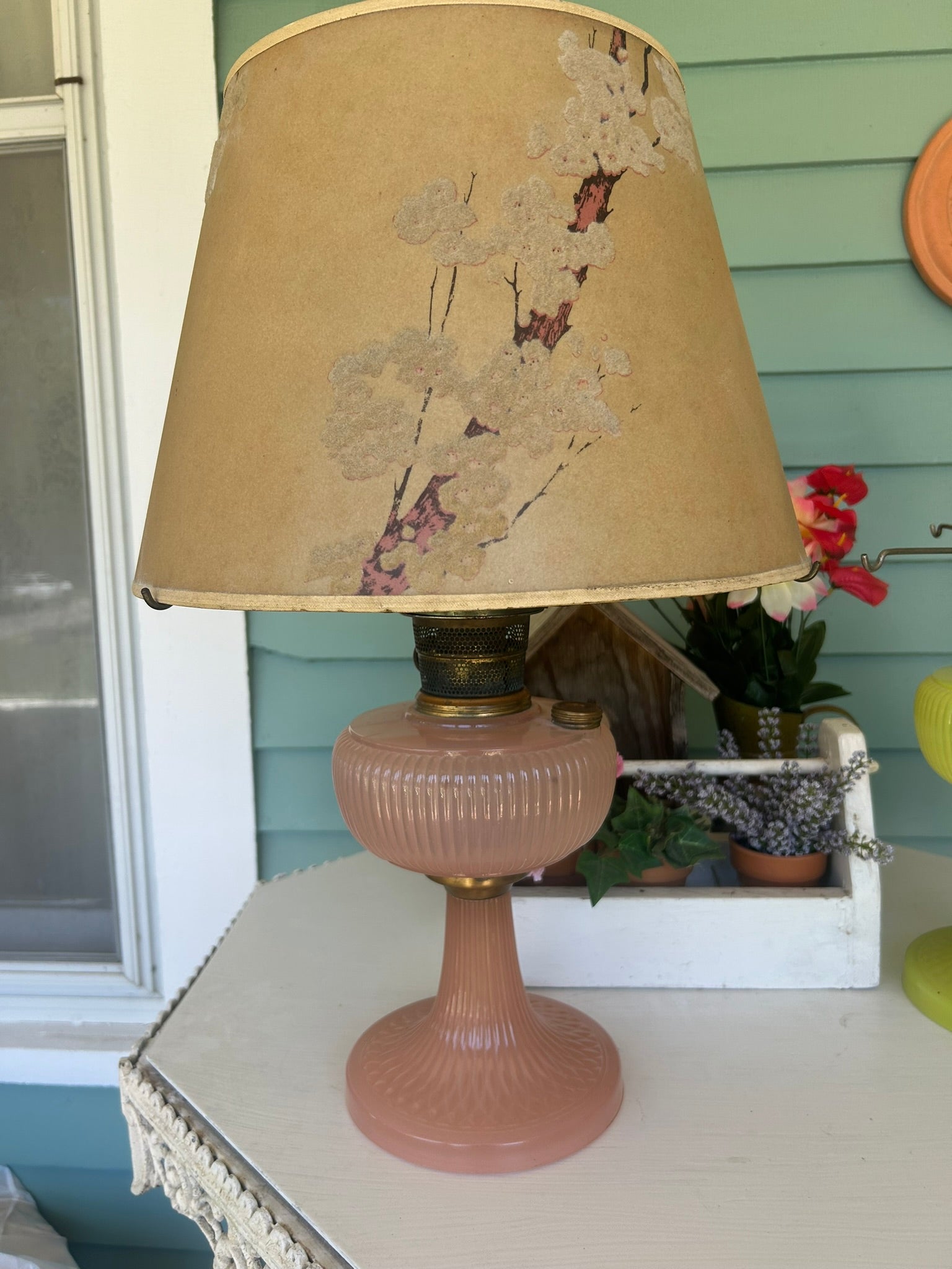 ALADDIN VERTIQUE ROSE MOONSTONE LAMP AND SHADE. CALL, TEXT, OR E-MAIL FOR MORE INFORMATION