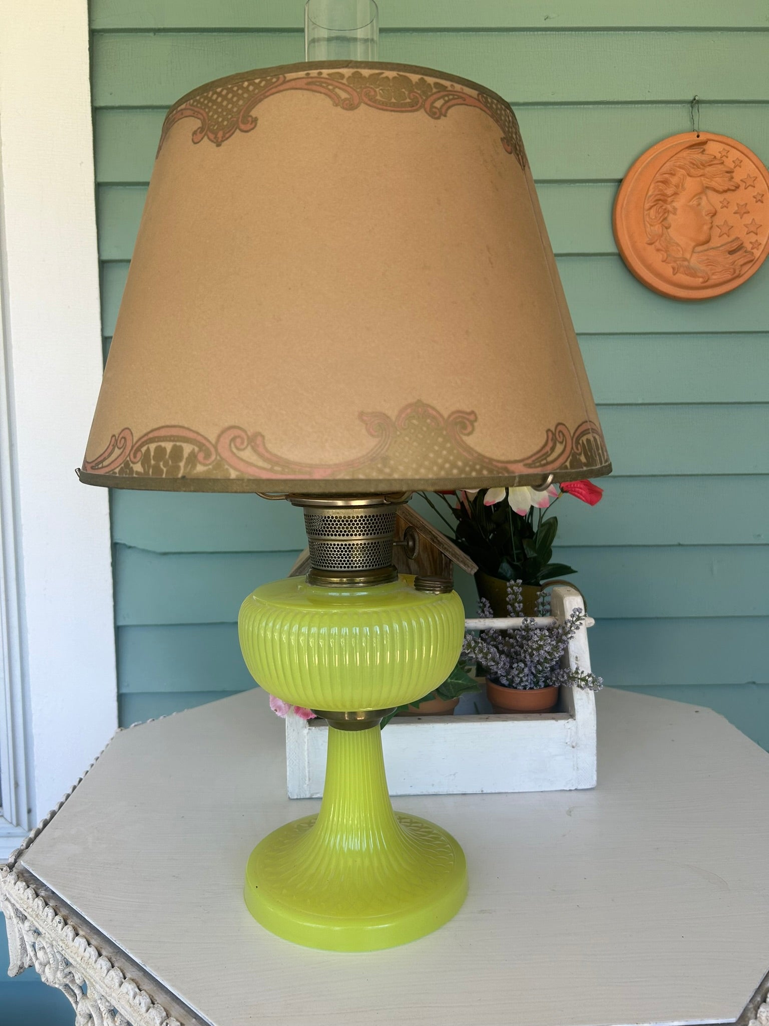 ALADDIN YELLOW VERTIQUE MOONSTONE LAMP AND SHADE. CALL, TEXT, OR E-MAIL FOR MORE INFORMATION