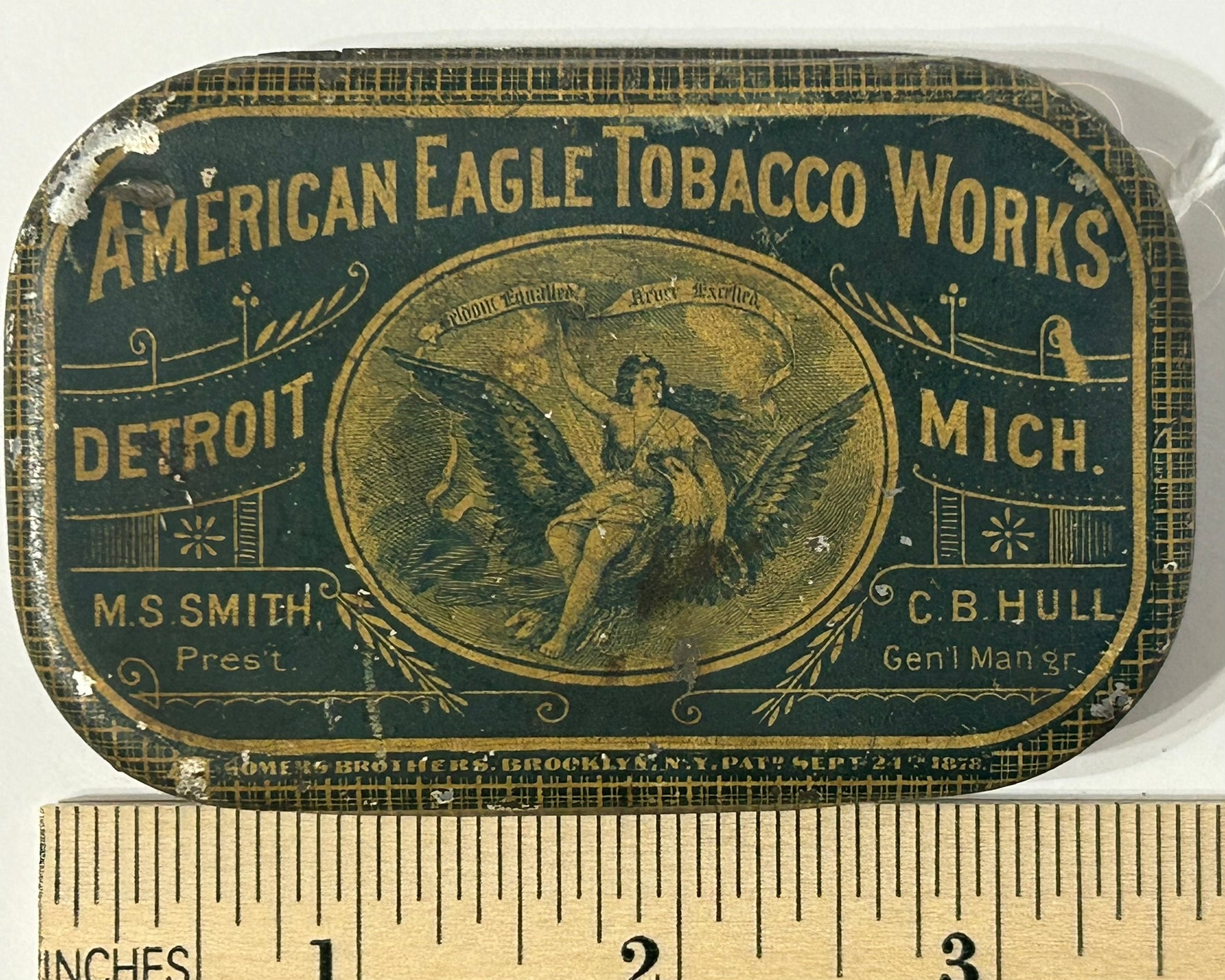 RARE AMERICAN EAGLE TOBACCO WORKS TIN 2/4" X 3 1/2" AND SOME DAMAGE. CALL OR TEXT FOR MORE INFORMATION