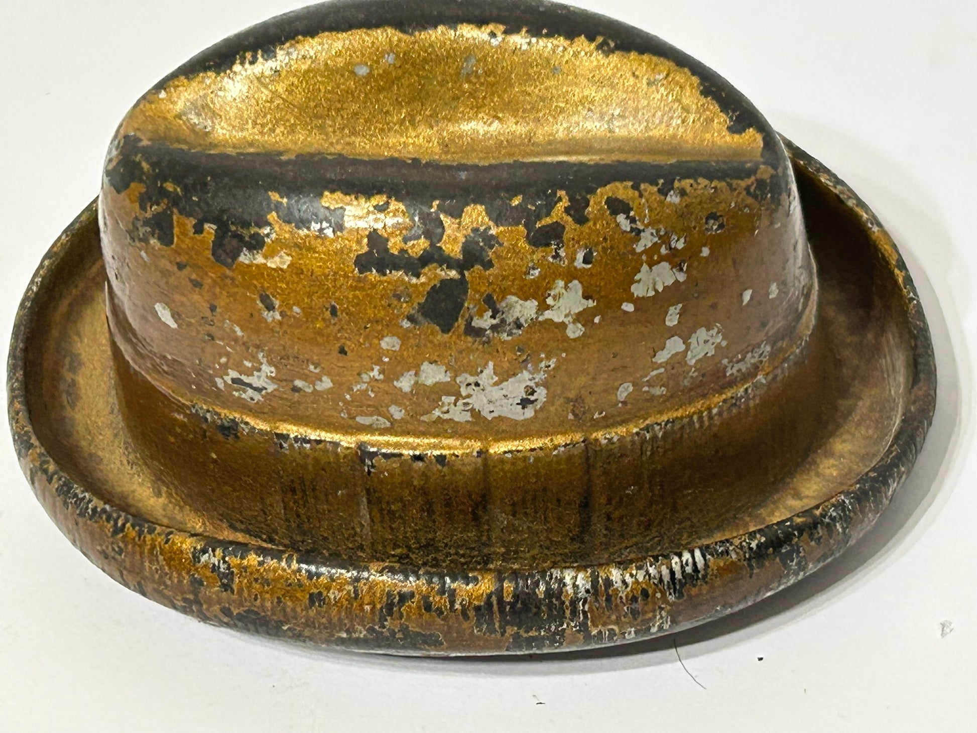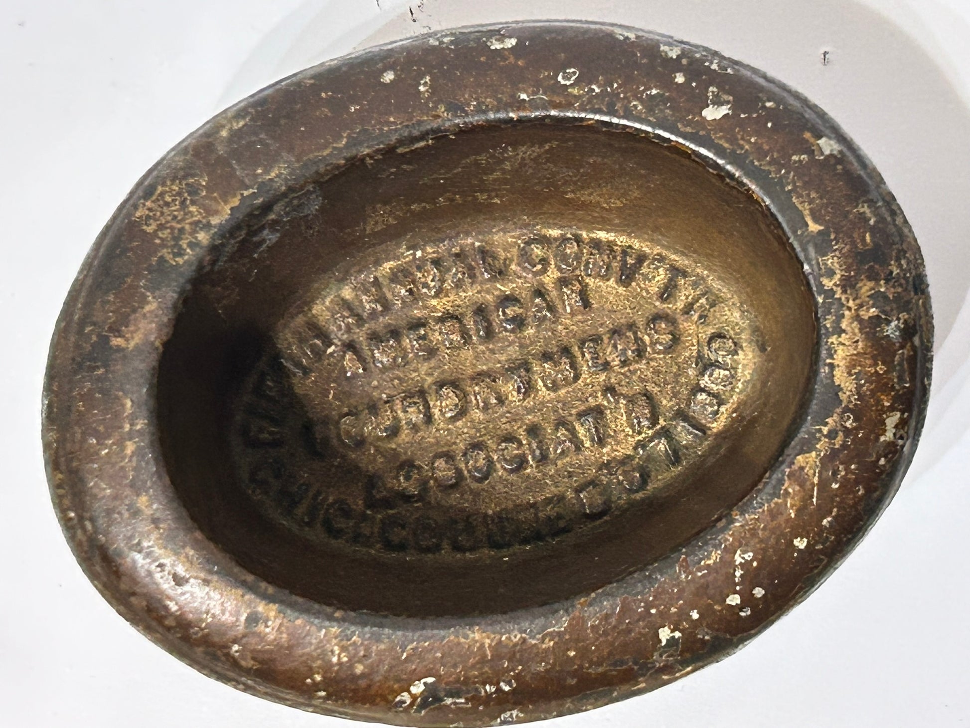 AMERICAN FOUNDRY MENS ASSOCIATION 1900 CAST IRON FIGURAL HAT PAPERWEIGHT 4 1/2" WIDE X 2" TALL. CALL OR TEXT FOR MORE INFORMATION