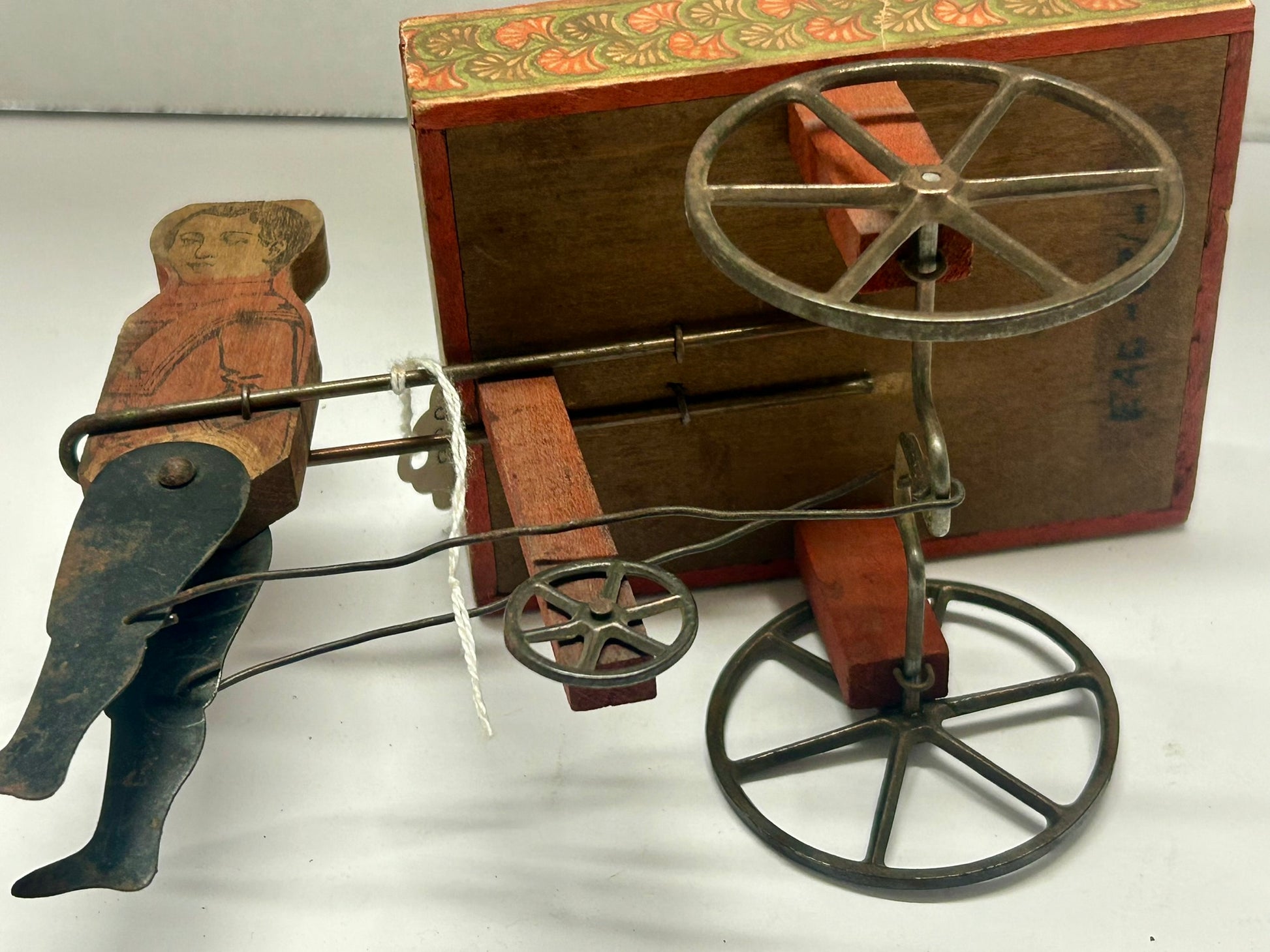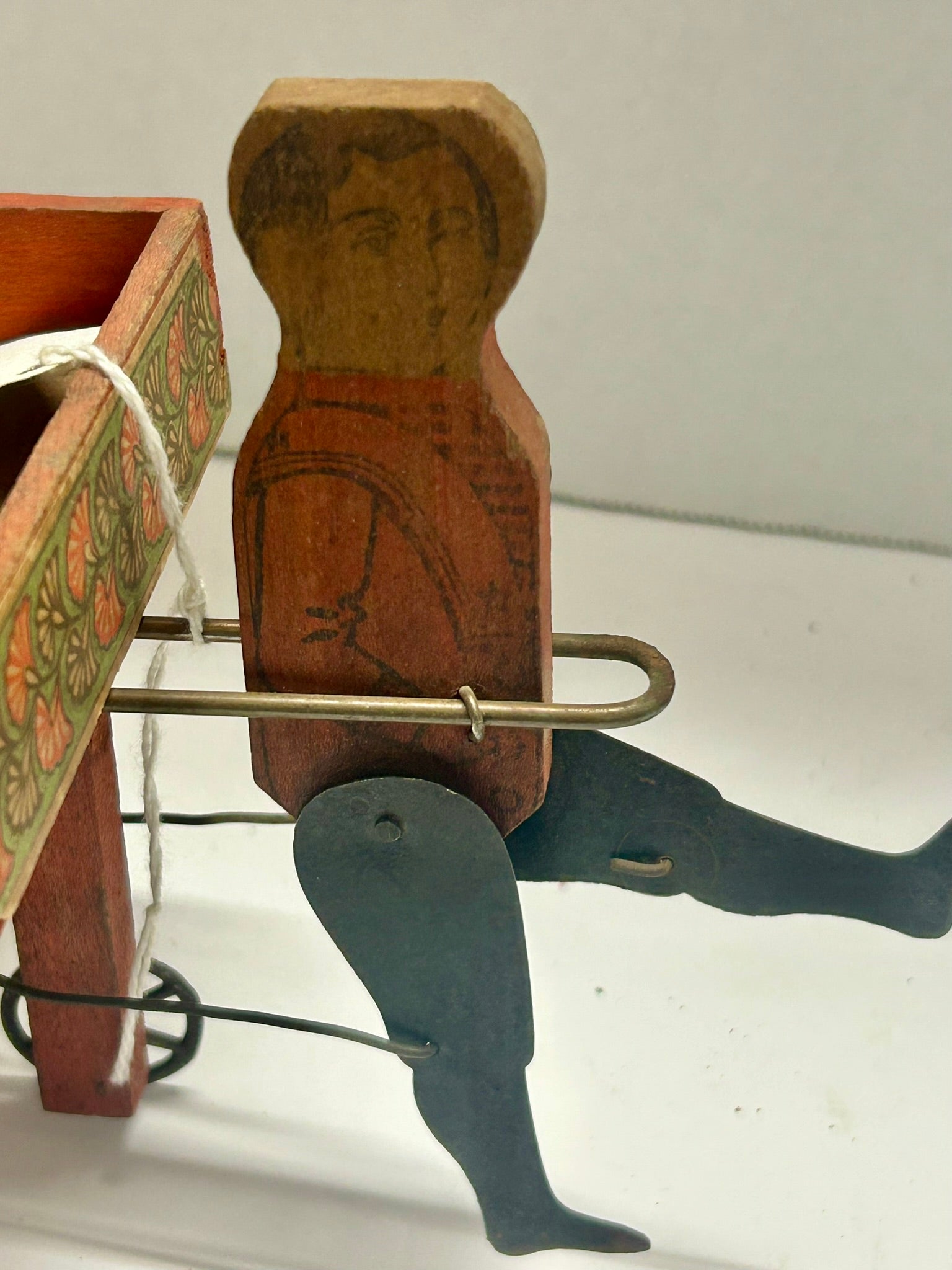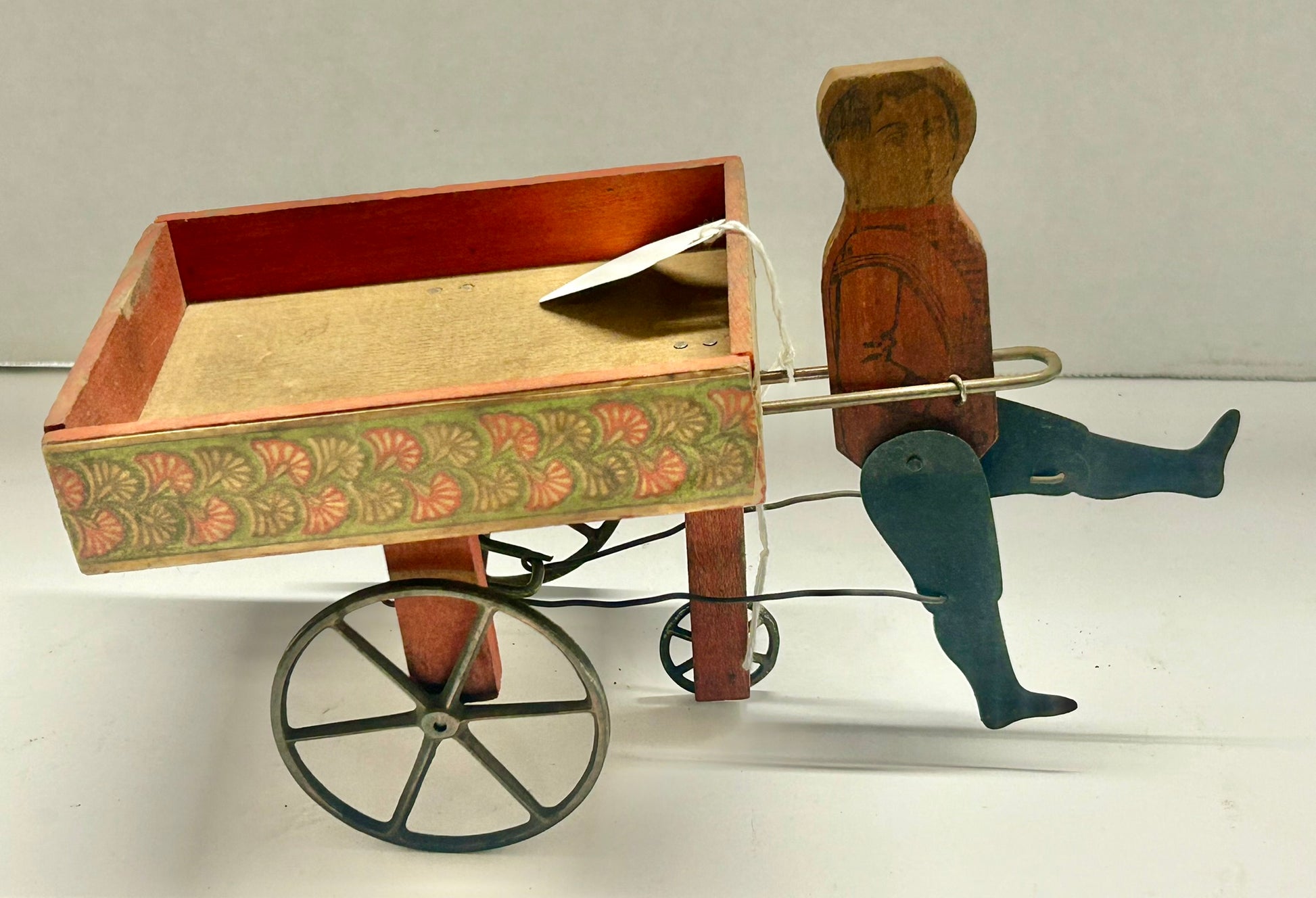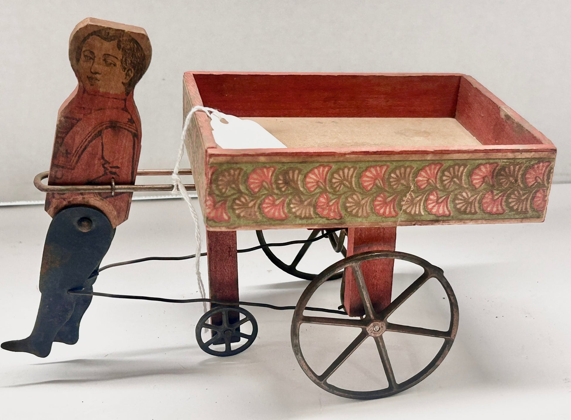 ANTIQUE LATE 1800'S WOOD AND PAPER LITHO PULL TOY OF BOY WITH CART 8" LONG. CALL OR TEXT FOR MORE INFORMATION