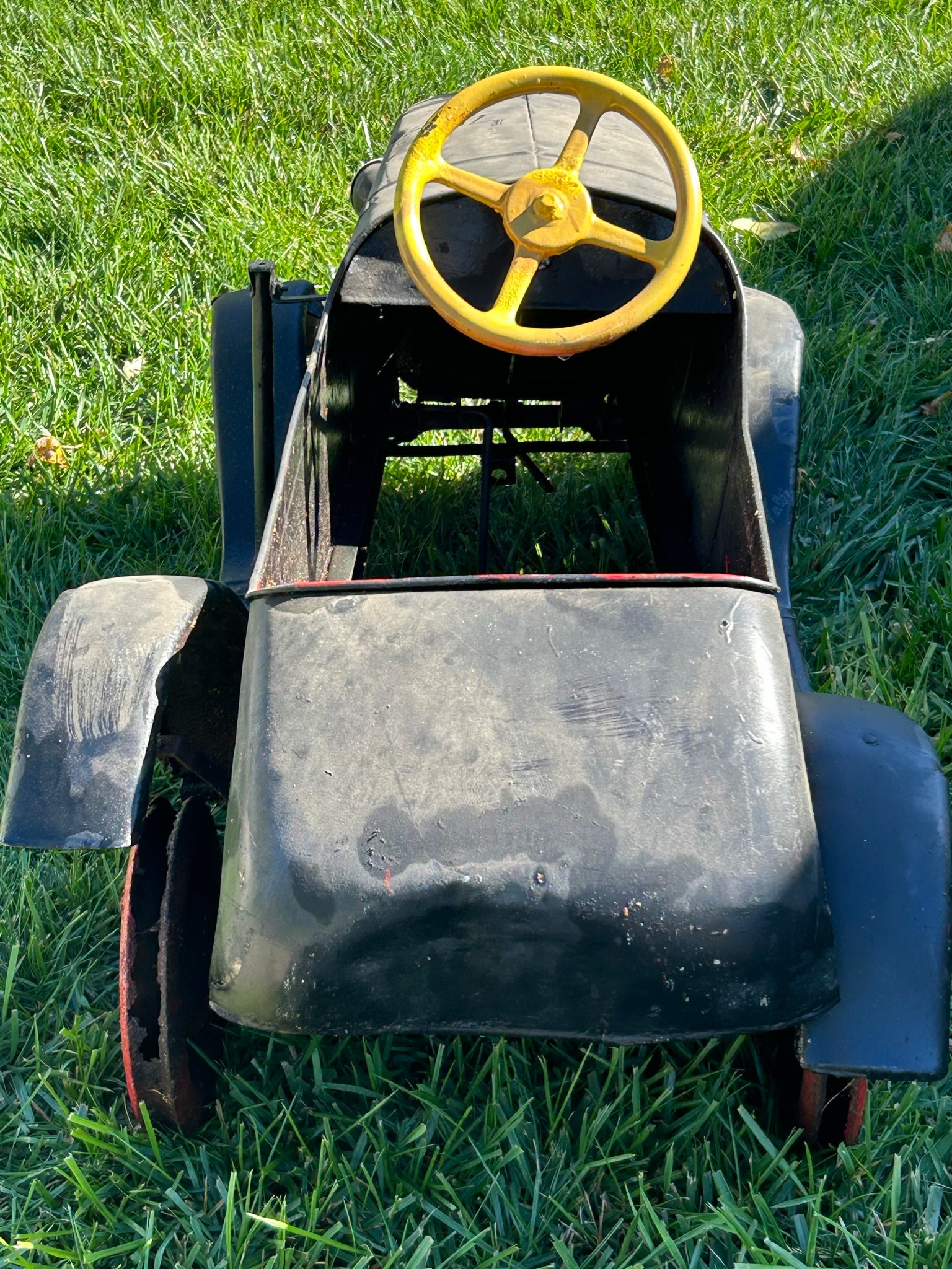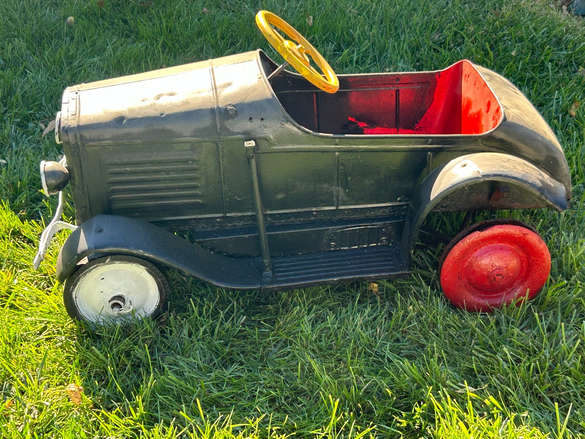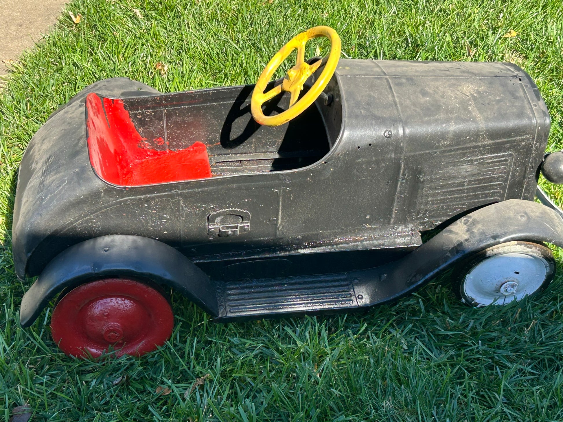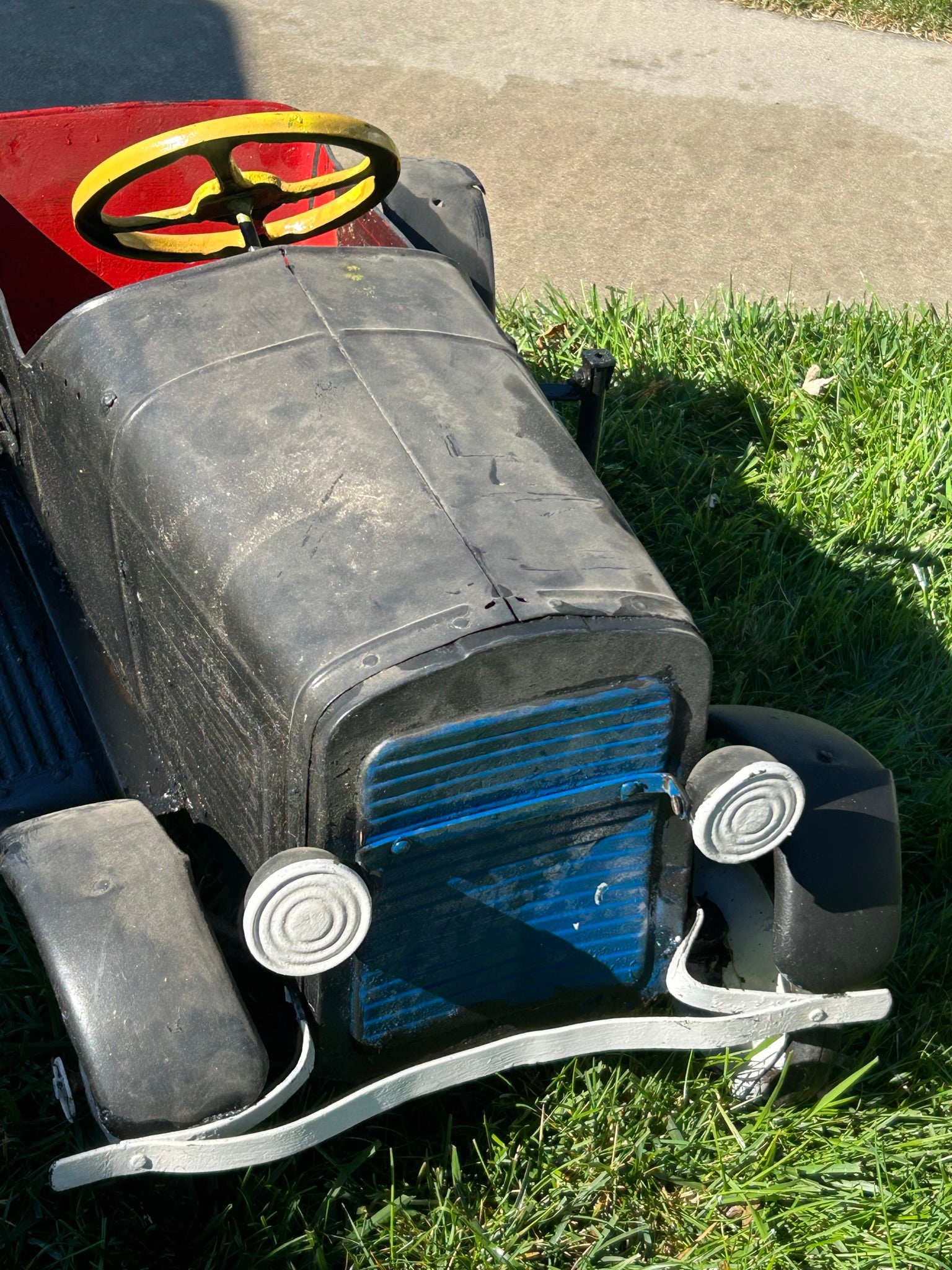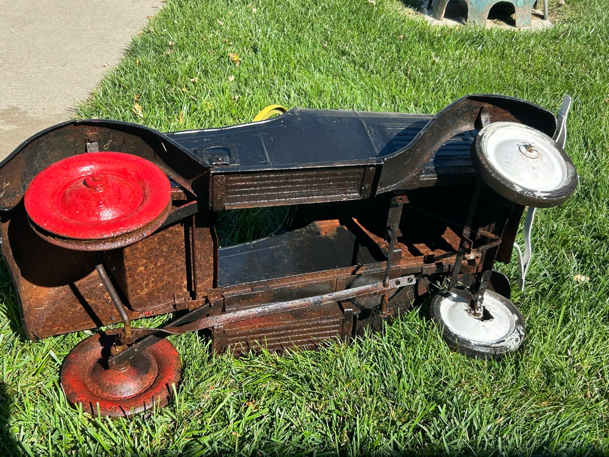 Antique 1930's metal pedal car in unrestored condition. Call, text, or e-mail for more information please.