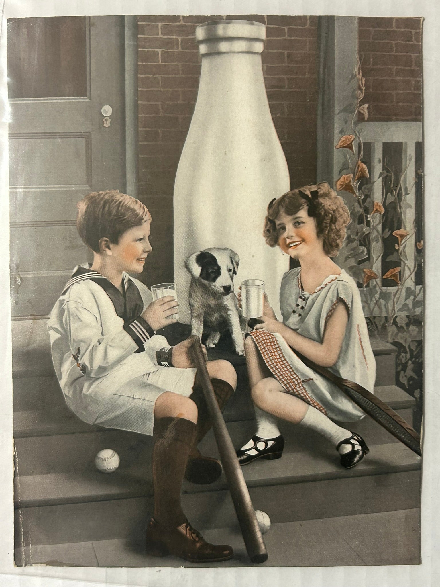 ANTIQUE AD ILLUSTRATION OF BOY AND GIRL BESIDE GIANT MILK BOTTLE
