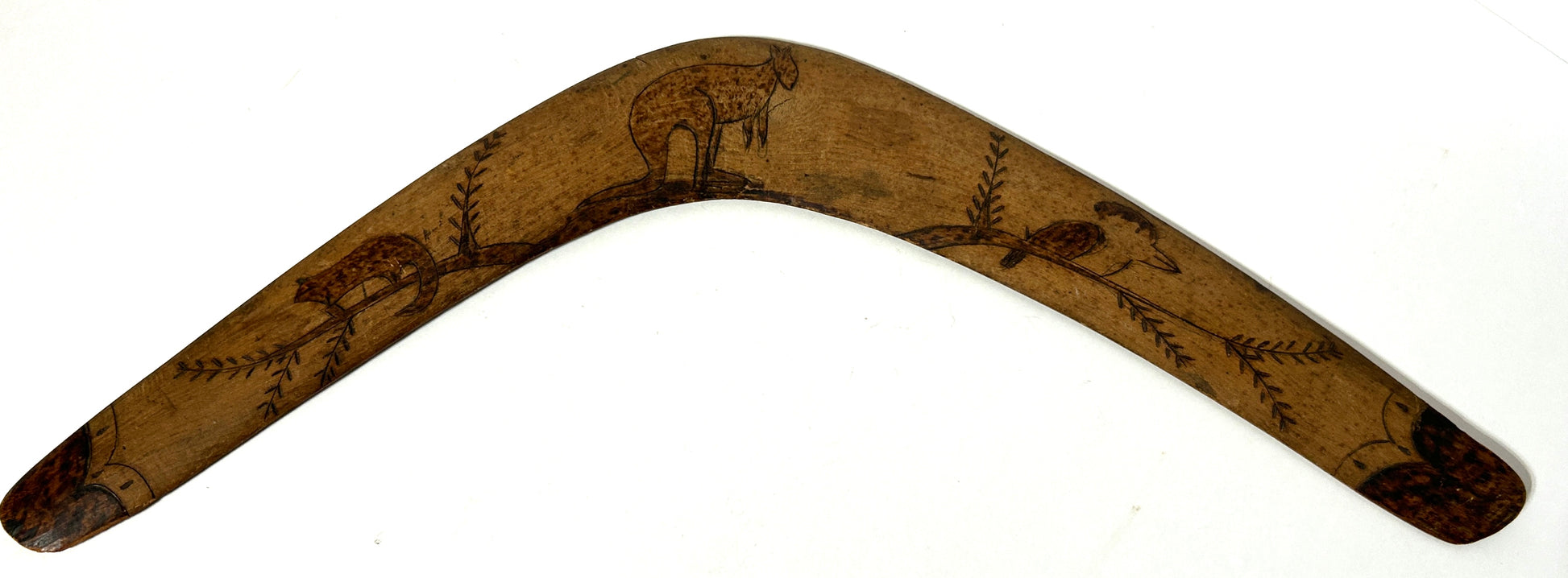 ANTIQUE AUSTRAILIAN BOOMERANG WITH WOOD BURNT DECORATIONS 21" WIDE. SHIPPING IS EXTRA CHARGE SO CALL OR TEXT TO FIND OUT WHAT IT WILL COST TO SEND TO YOUR ADDRESS