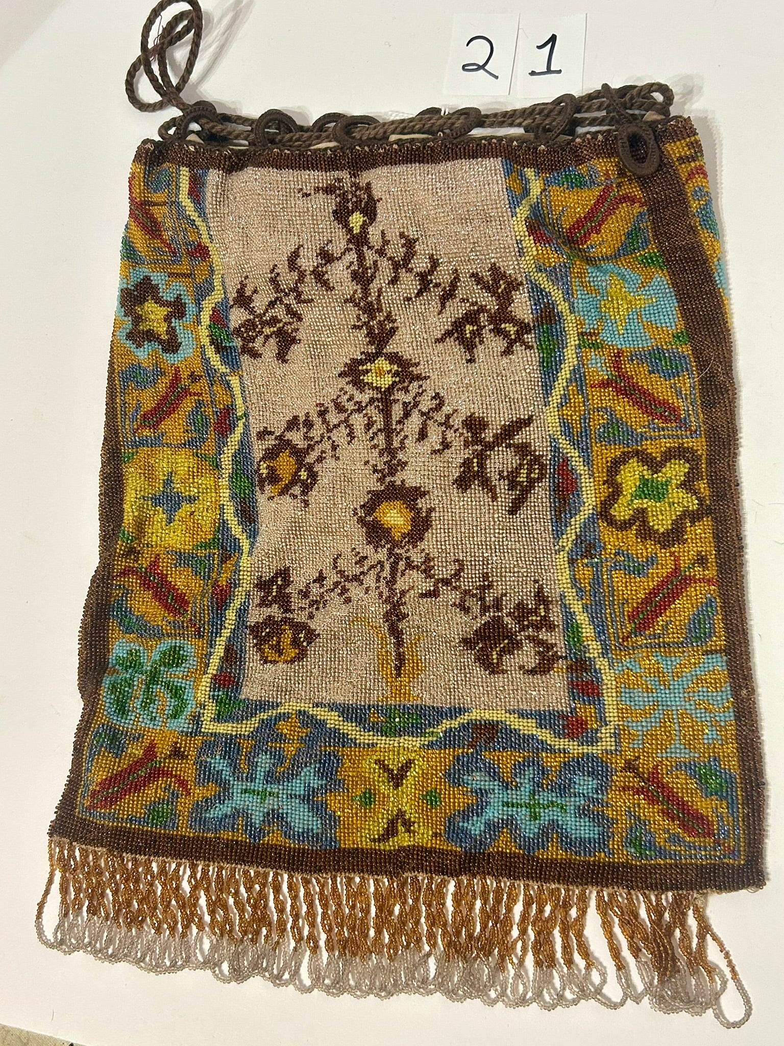 ANTIQUE LARGE 11 1/2" BEADED DRAWSTRING PURSE, SOME BOTTOM FRINGE BEADS MISSING ON ONE SIDE. ALL OR TEXT FOR MORE INFORMATION