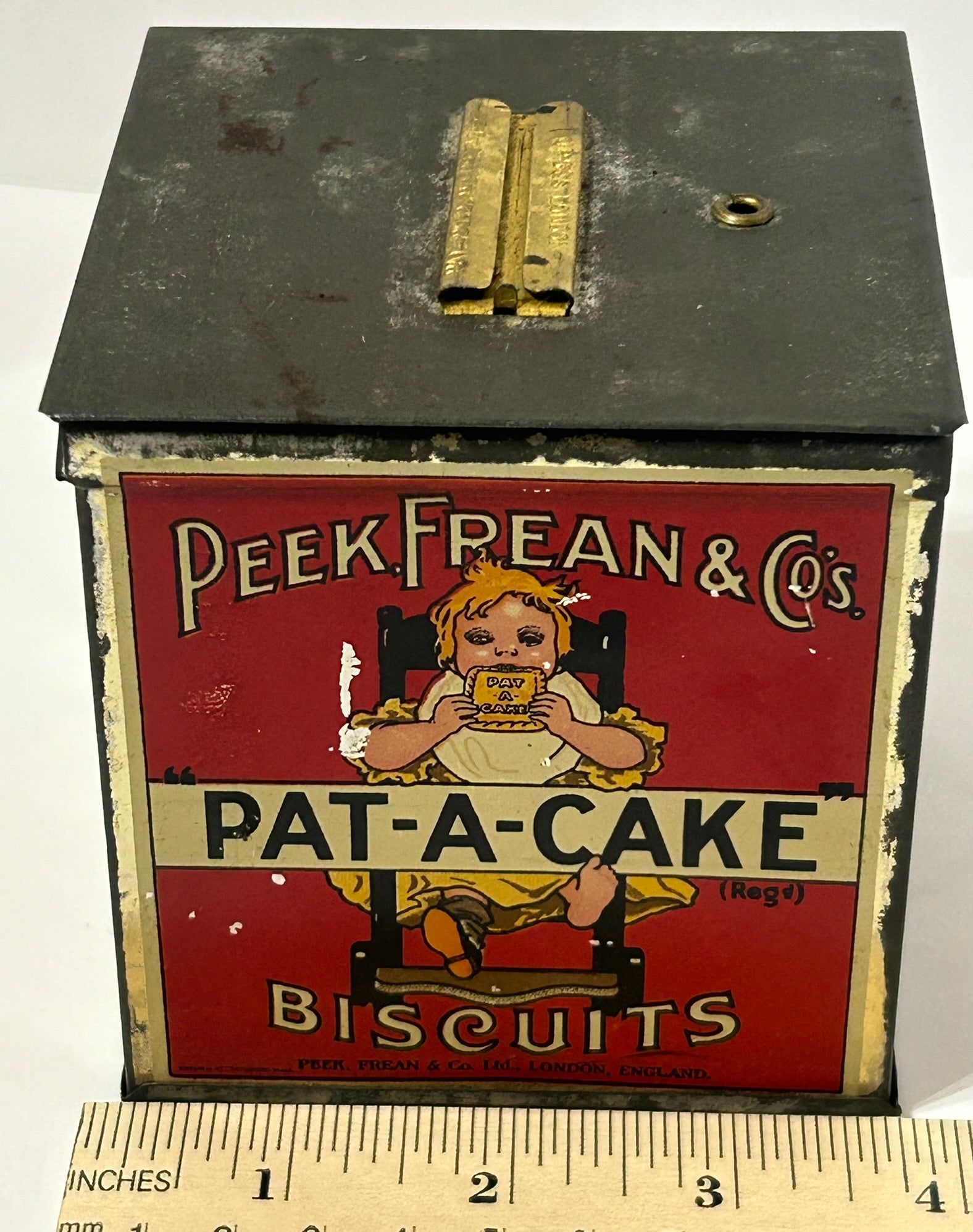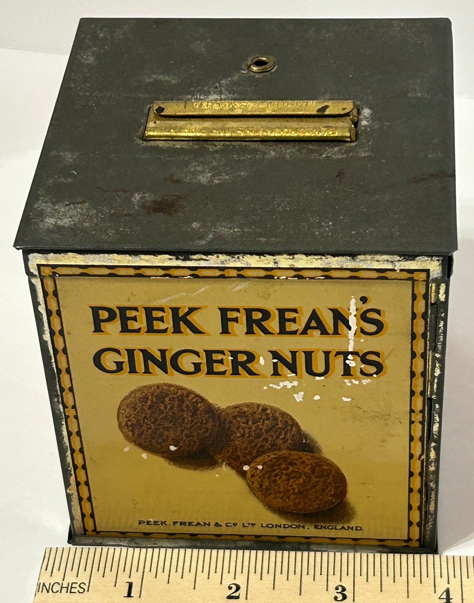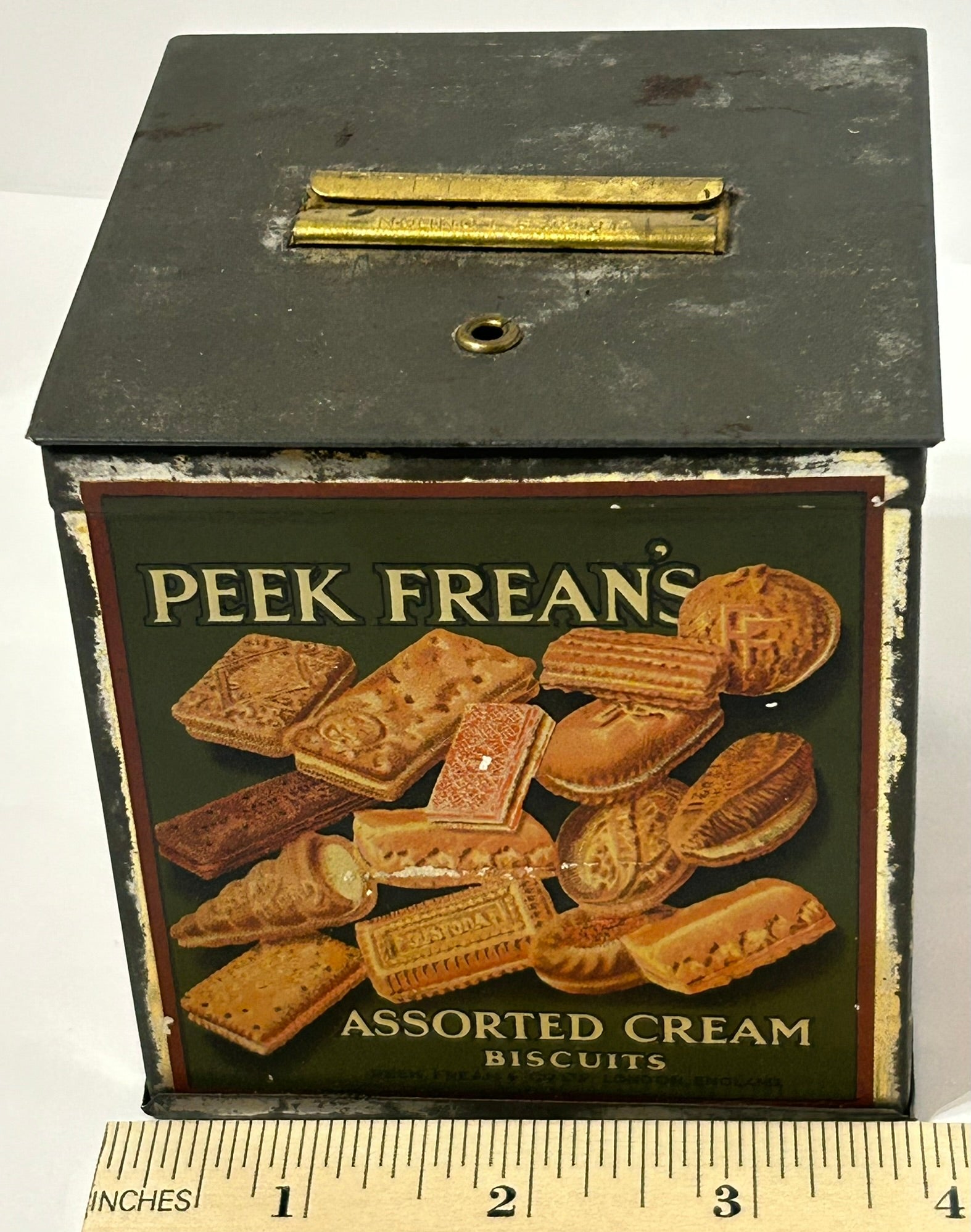 ANTIQUE BISCUIT TIN BY PEEK FREAN & CO. BISCUIT TIN, LONDON 3 1/2" SQUARE. CALL OR TEXT FOR MORE INFORMATION