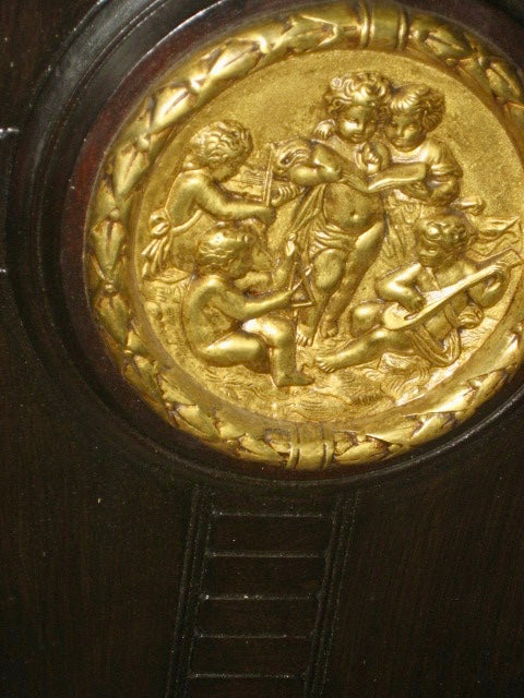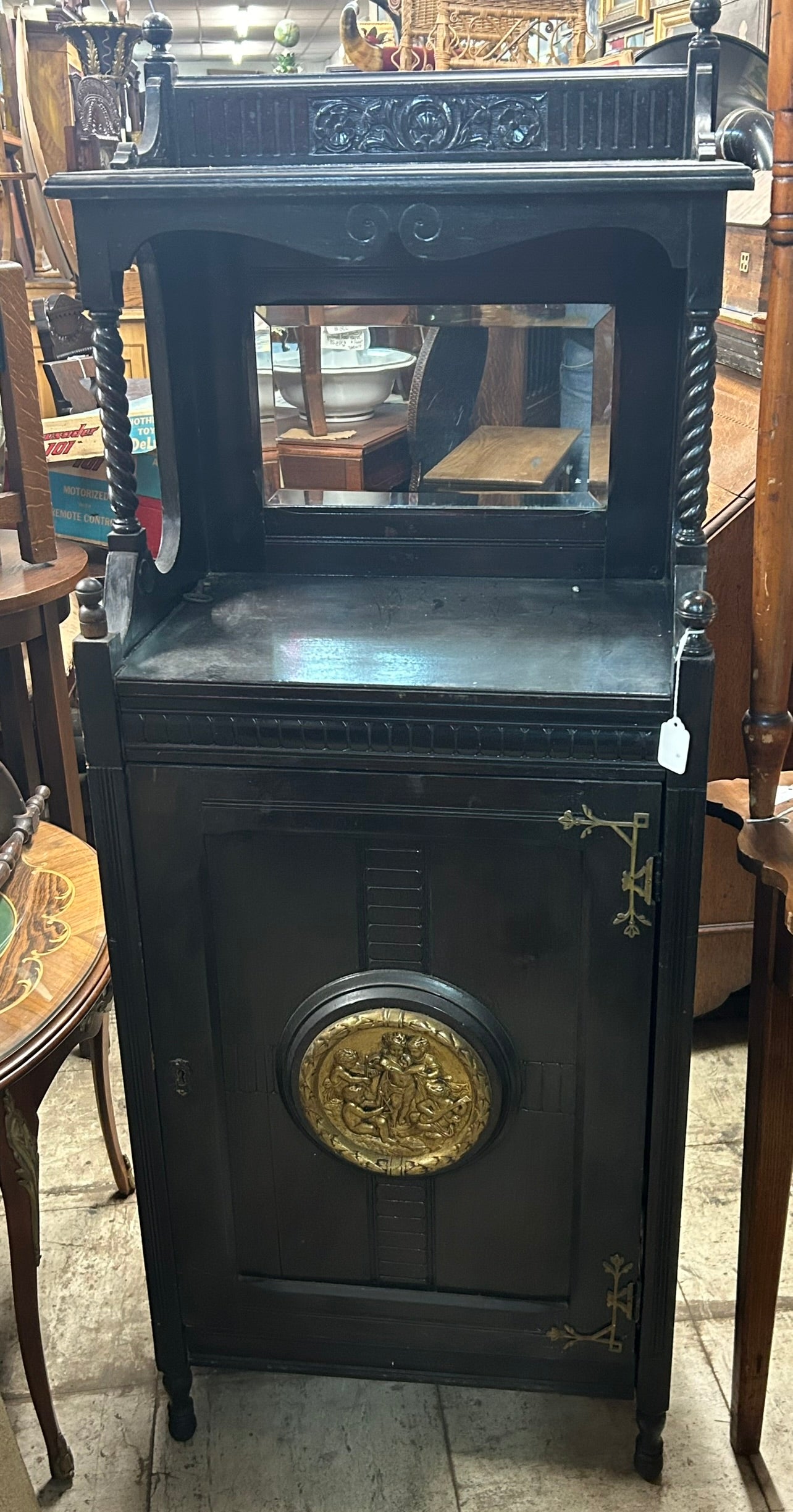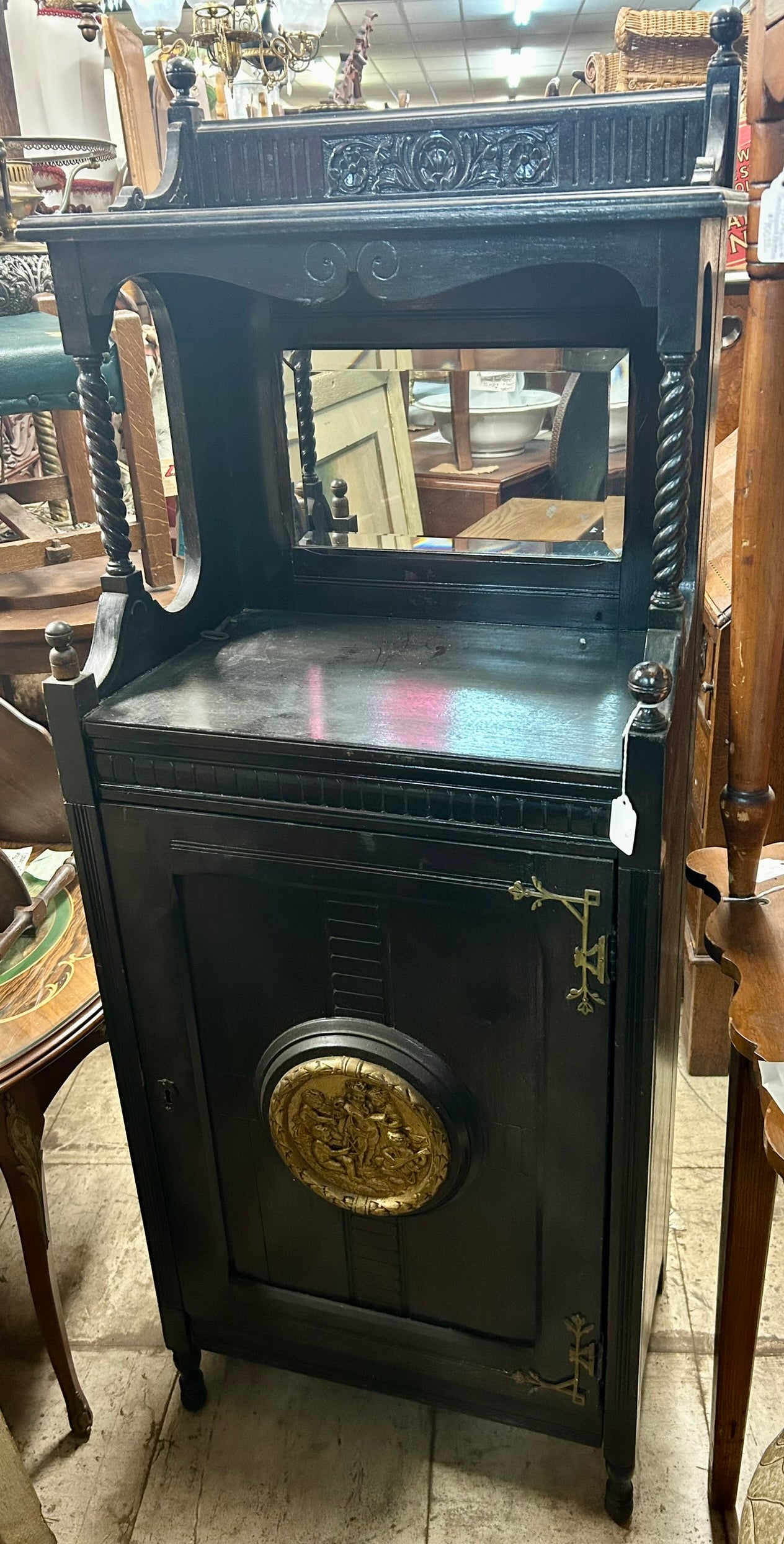 ANTIQUE BLACK EBONIZED MUSIC STAND WITH BRONZE PLAQUE ON DOOR, POTTIER AND STYMUS?