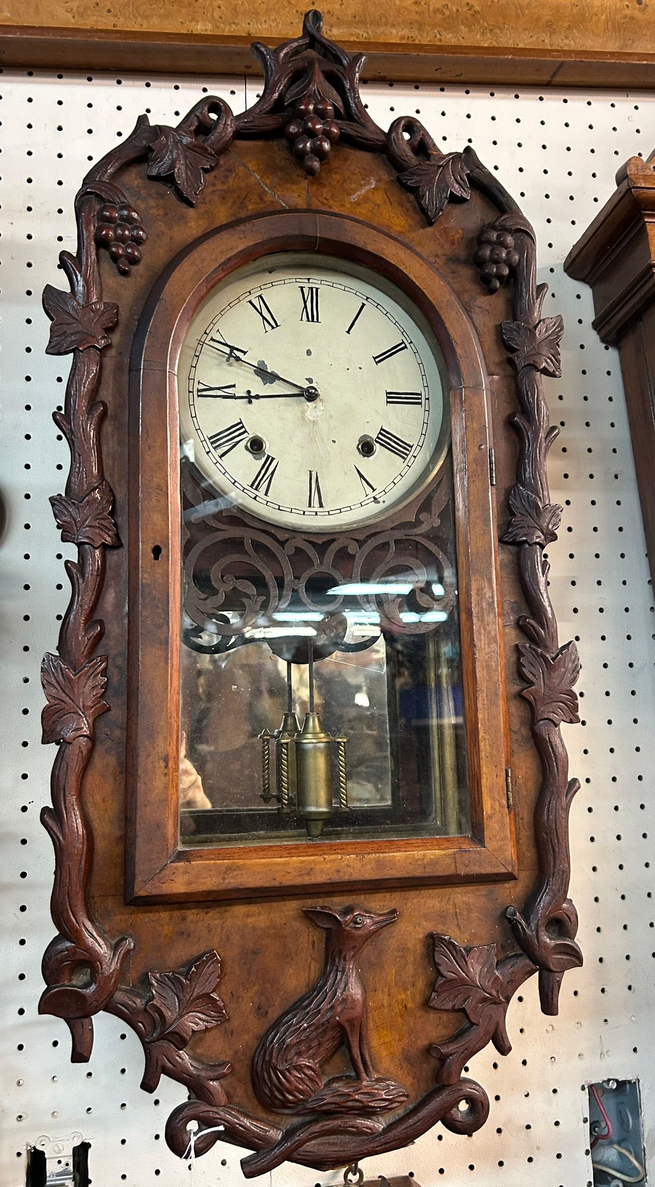 ANTIQUE BLACK FOREST CARVED WALL CLOCK WITH FOX, 32" TALL. CALL, TEXT, OR E-MAIL FOR MORE INFORMATION