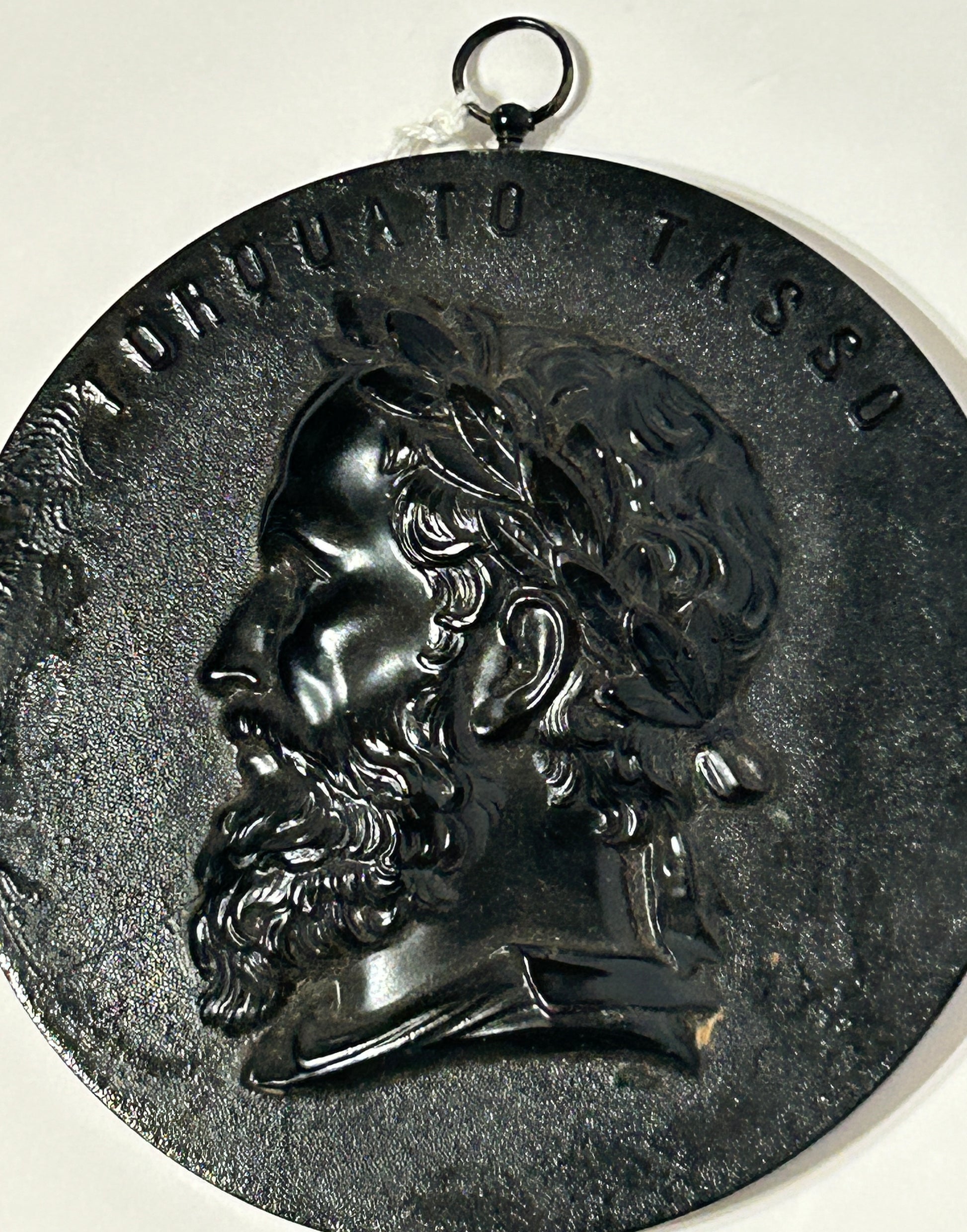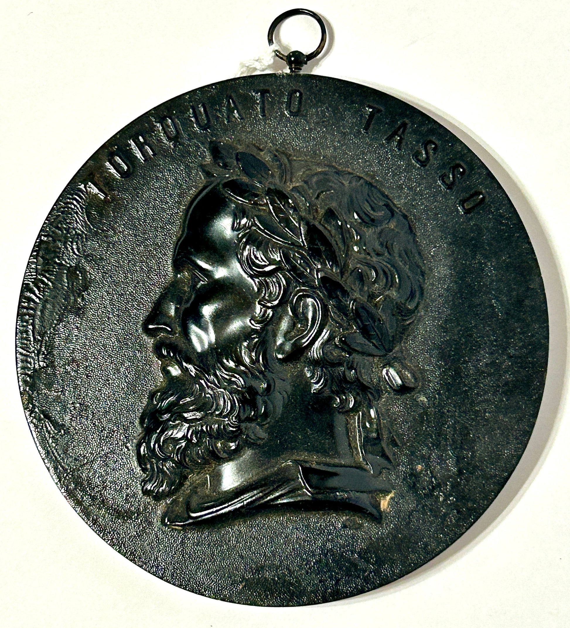 ANTIQUE WALL PLAQUE OF TORQUATO TASSO ITALIAN WRITER AND POET 1544-1595 MADE BY SOCIETE DU BOIS DURCI 4 1/2" DIA. SHIPPING COSTS ARE A EXTRA CHARGE SO CALL OR TEXT FOR PRICE INFO FOR SHIPPING