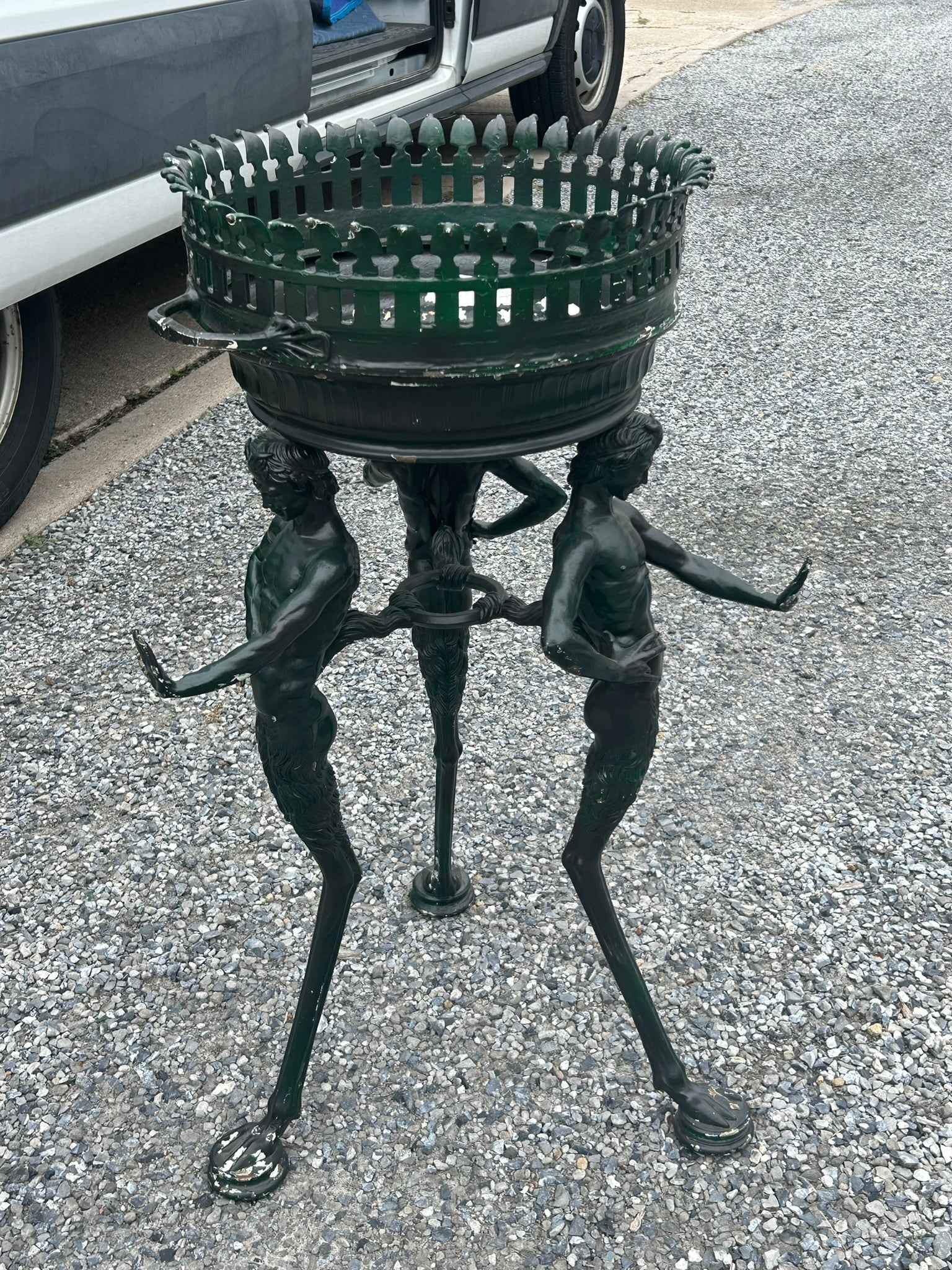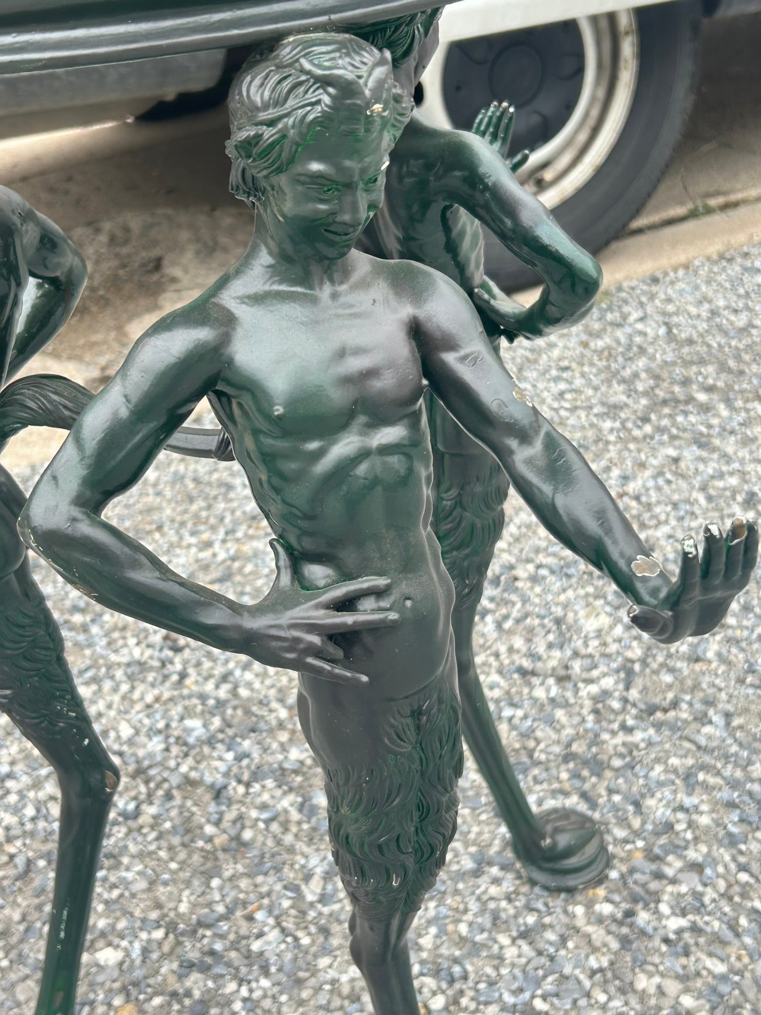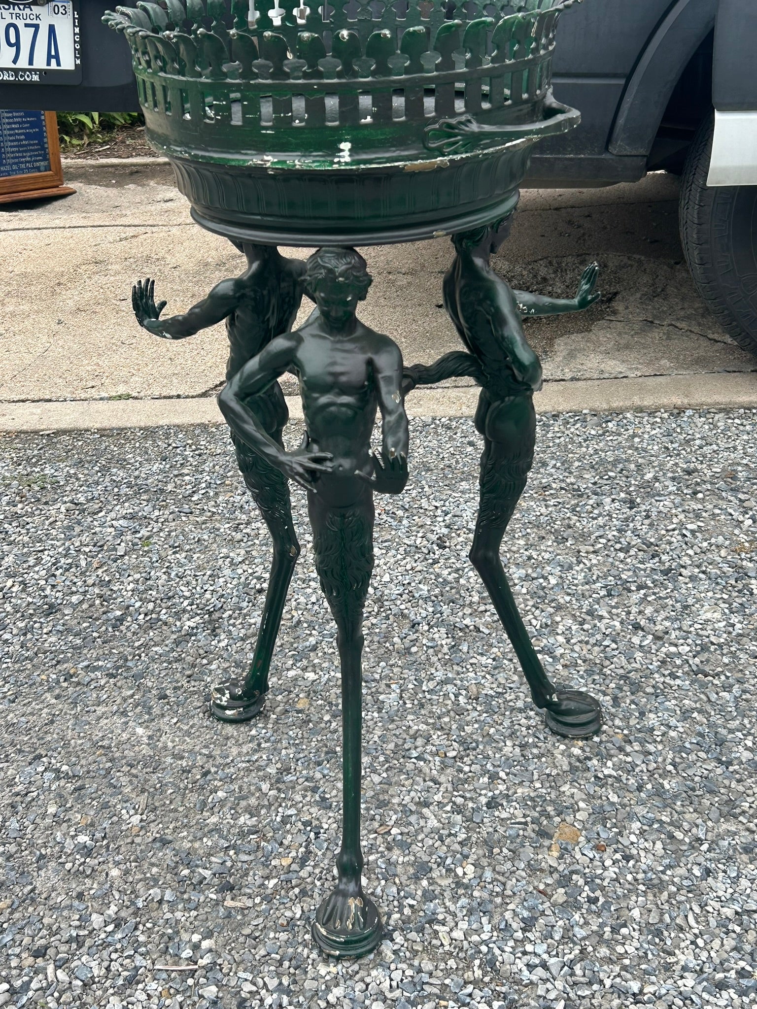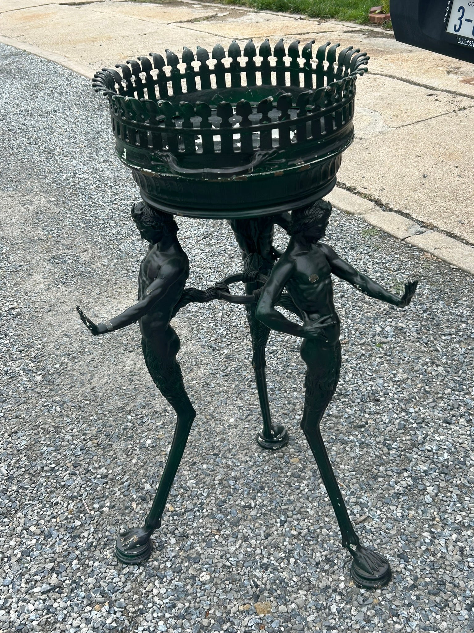 ANTIQUE BRONZE BRAZIER OR TORCHERE WITH PAN SATYR FIGURAL LEGS 35" TALL. CALL, TEXT, OR E-MAIL FOR MORE INFORMATION