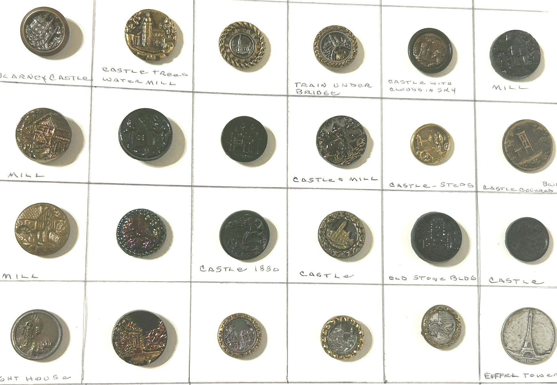 ANTIQUE BUTTON COLLECTION OF BUTTONS WITH BUILDINGS ON THEM