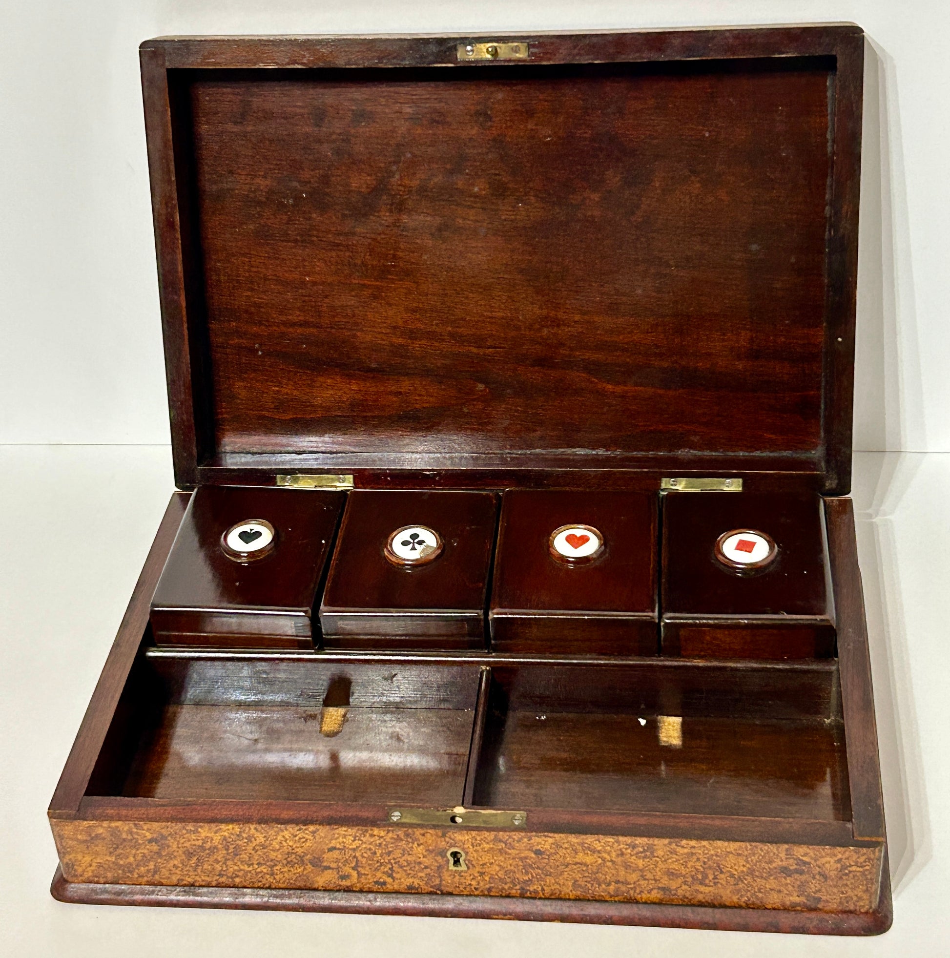 ANTIQUE CARD COUNTERS BOXED SET WITH ENAMELED LID INNER BOXES WITH BAKELITE COUNTERS 12" X 8" X 2 3/4". CALL OR TEXT FOR MORE INFORMATION