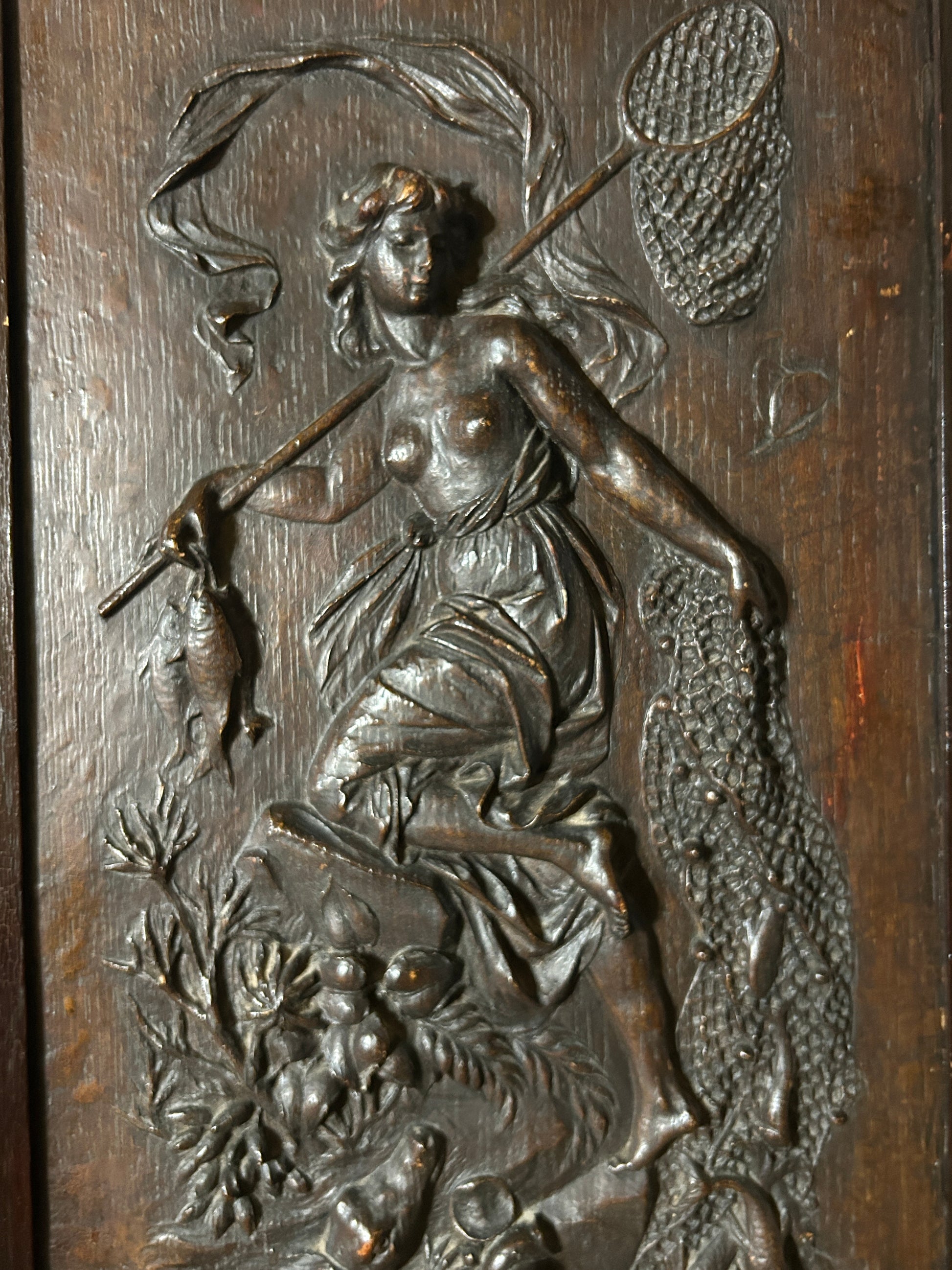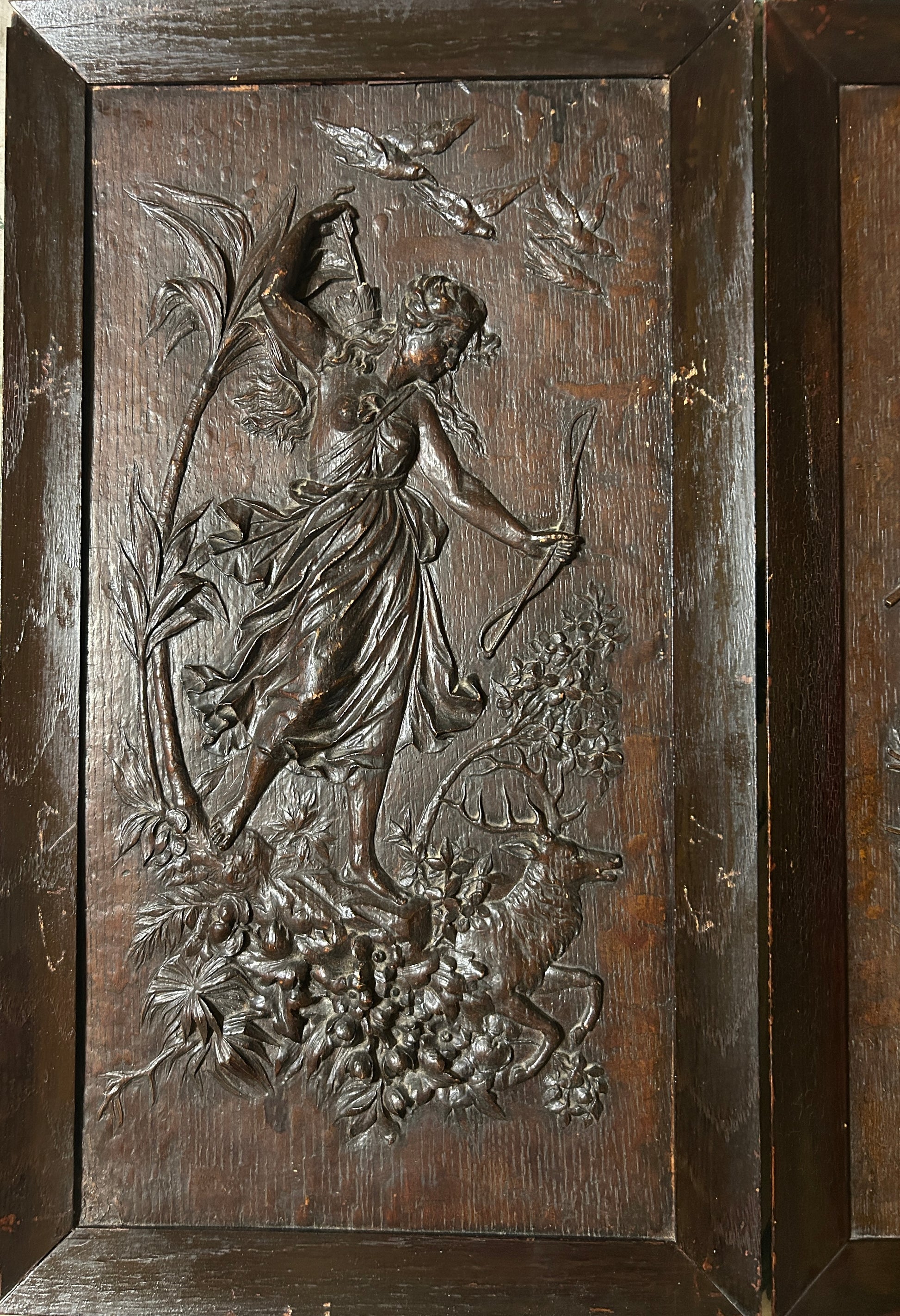 ANTIQUE CARVED WOOD CLASSICAL PLAQUES OF WOMEN HUNTING AND FISHING