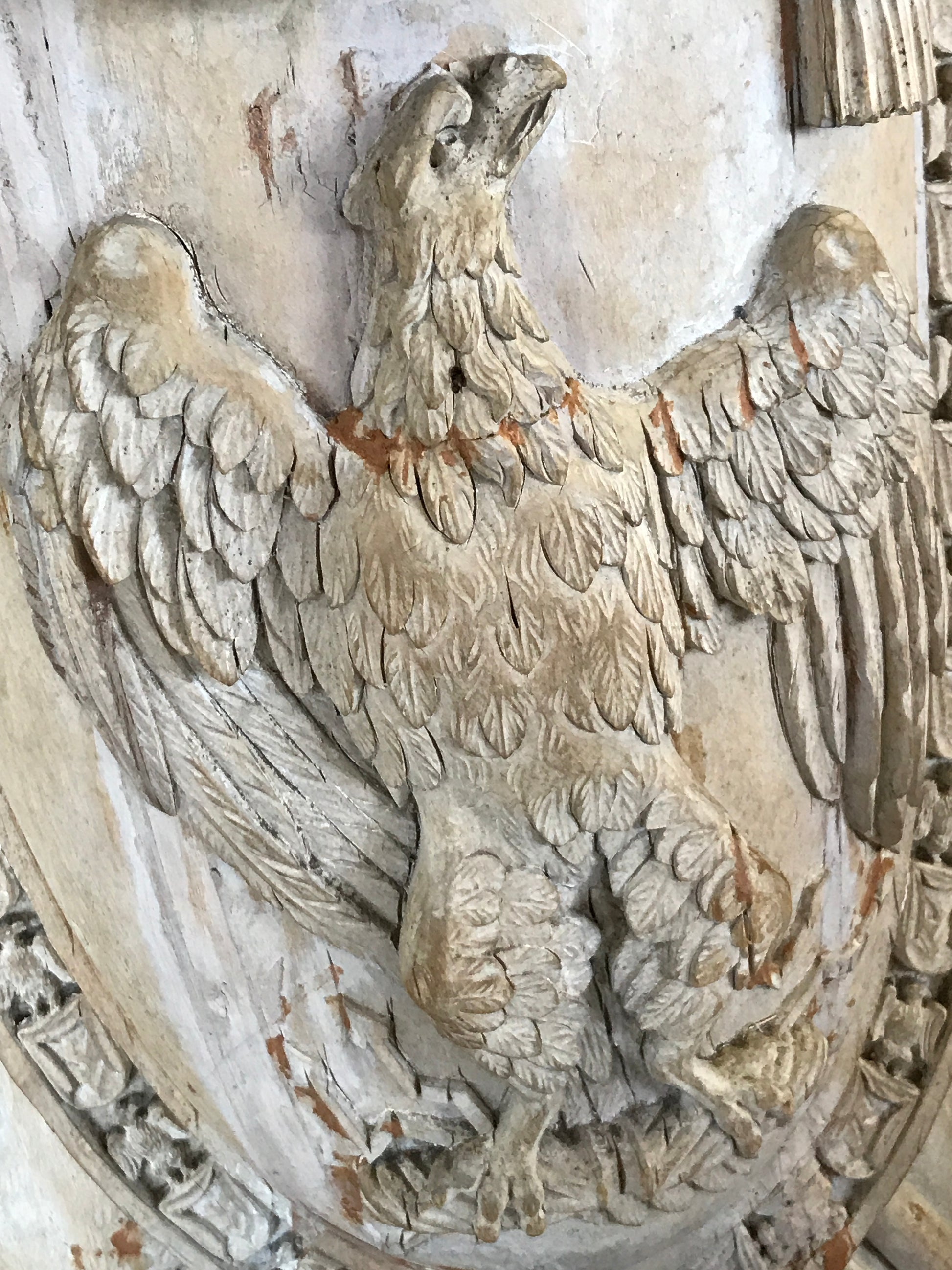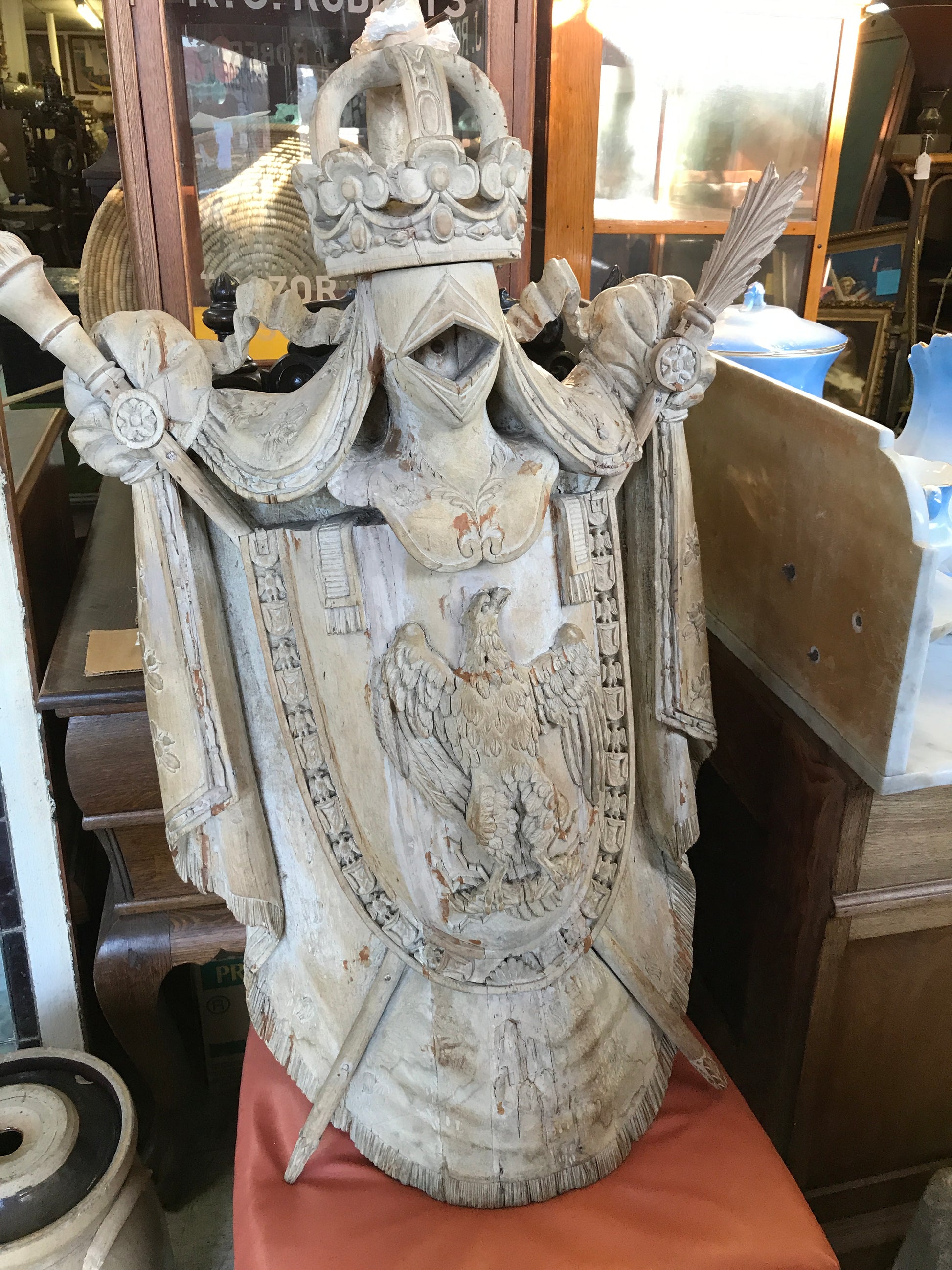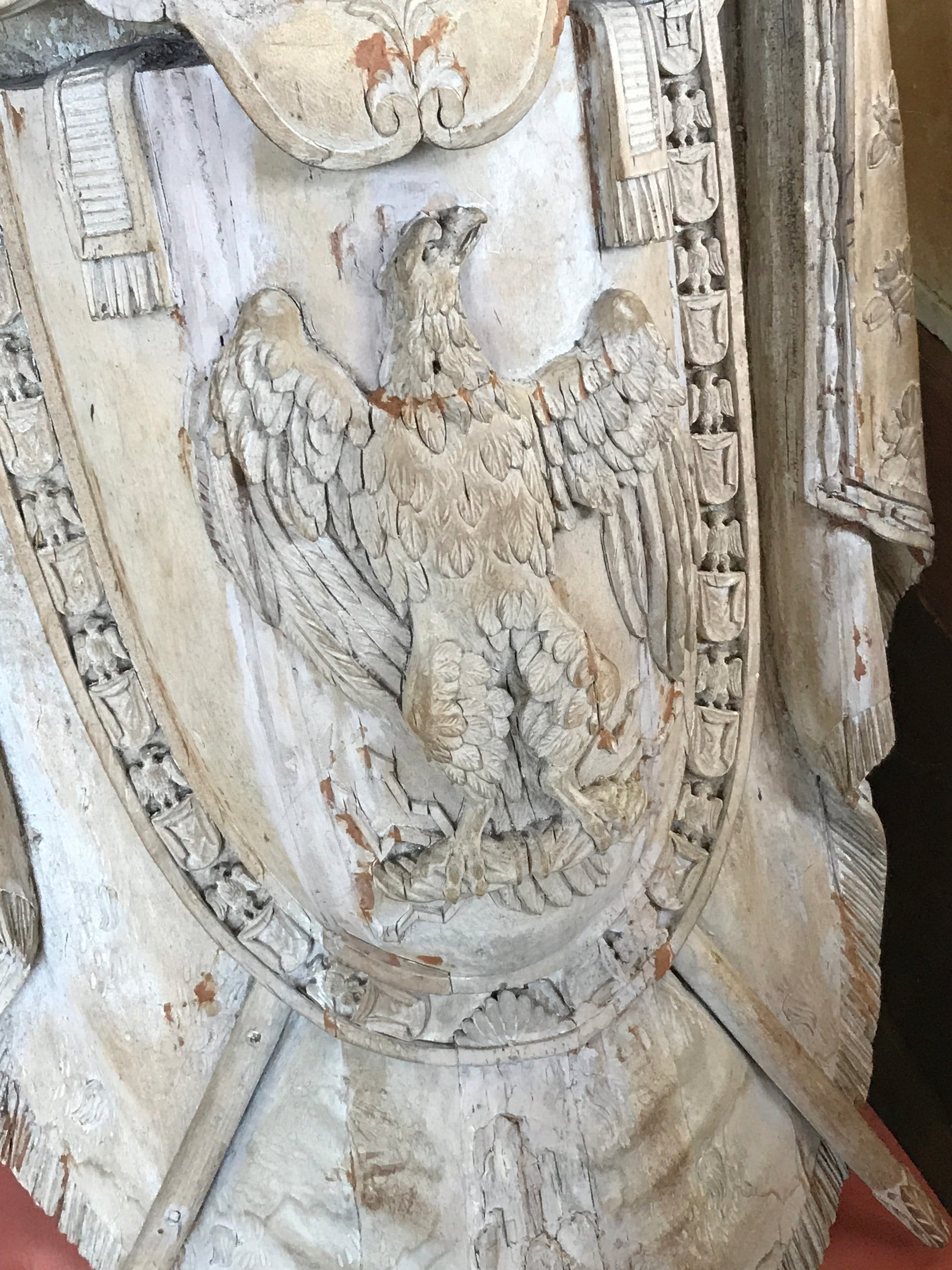 ANTIQUE CARVED WOOD NAPOLEANIC ERA COAT OF ARMS, ALL ORIGIANAL 37" TALL X 25" WIDE. CALL, TEXT, OR E-MAIL FOR MORE INFORMATION