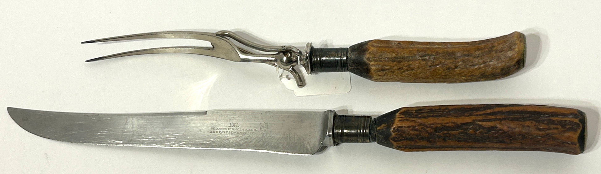 ANTIQUE STERLING AND HORN HANDLE CARVING SET WITH 14" KNIFE WITH WESTENHOLM BLADE. SHIPPING COST IS NOT INCLUDED IN PRICE-CALL OR TEXT FOR ADDED COST OF SHIPPING