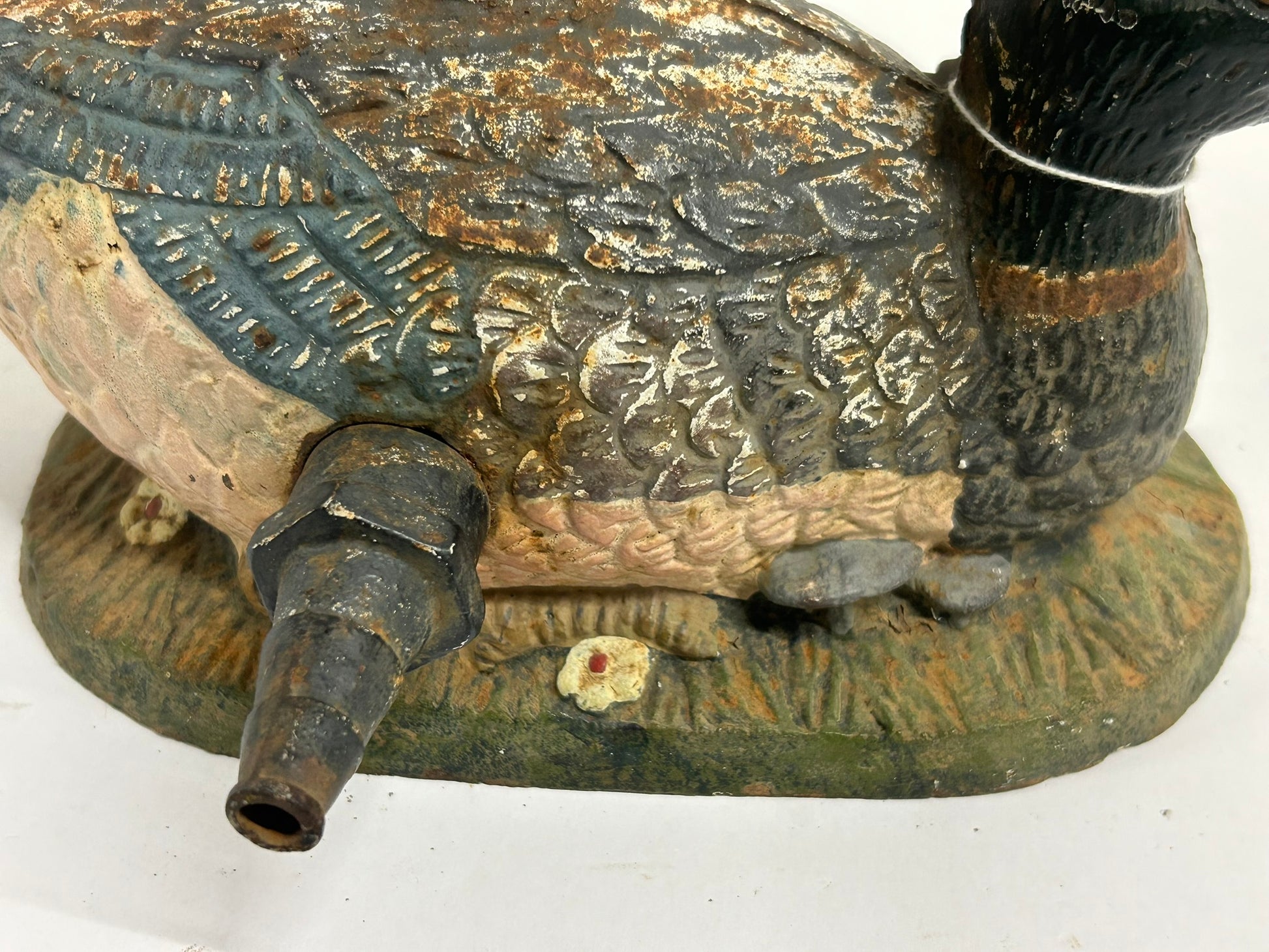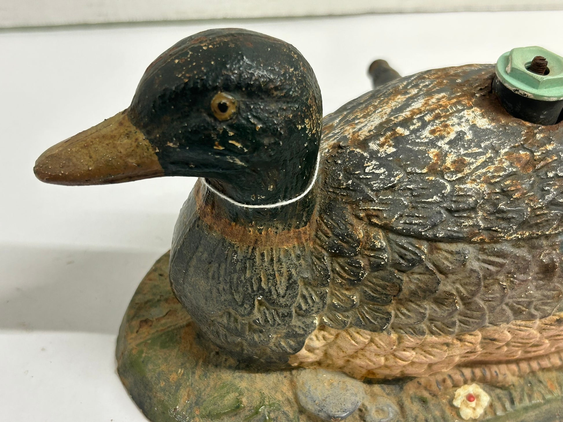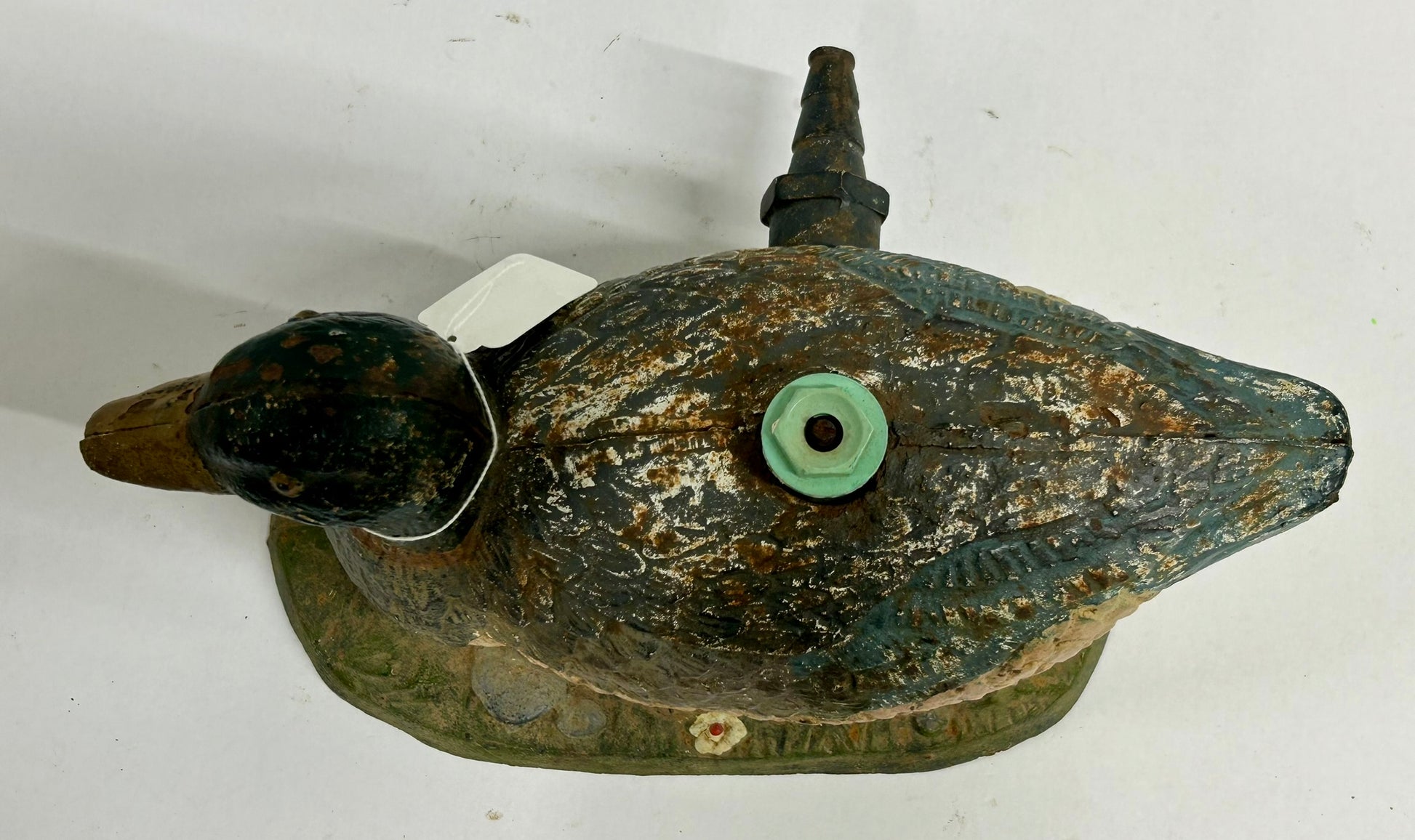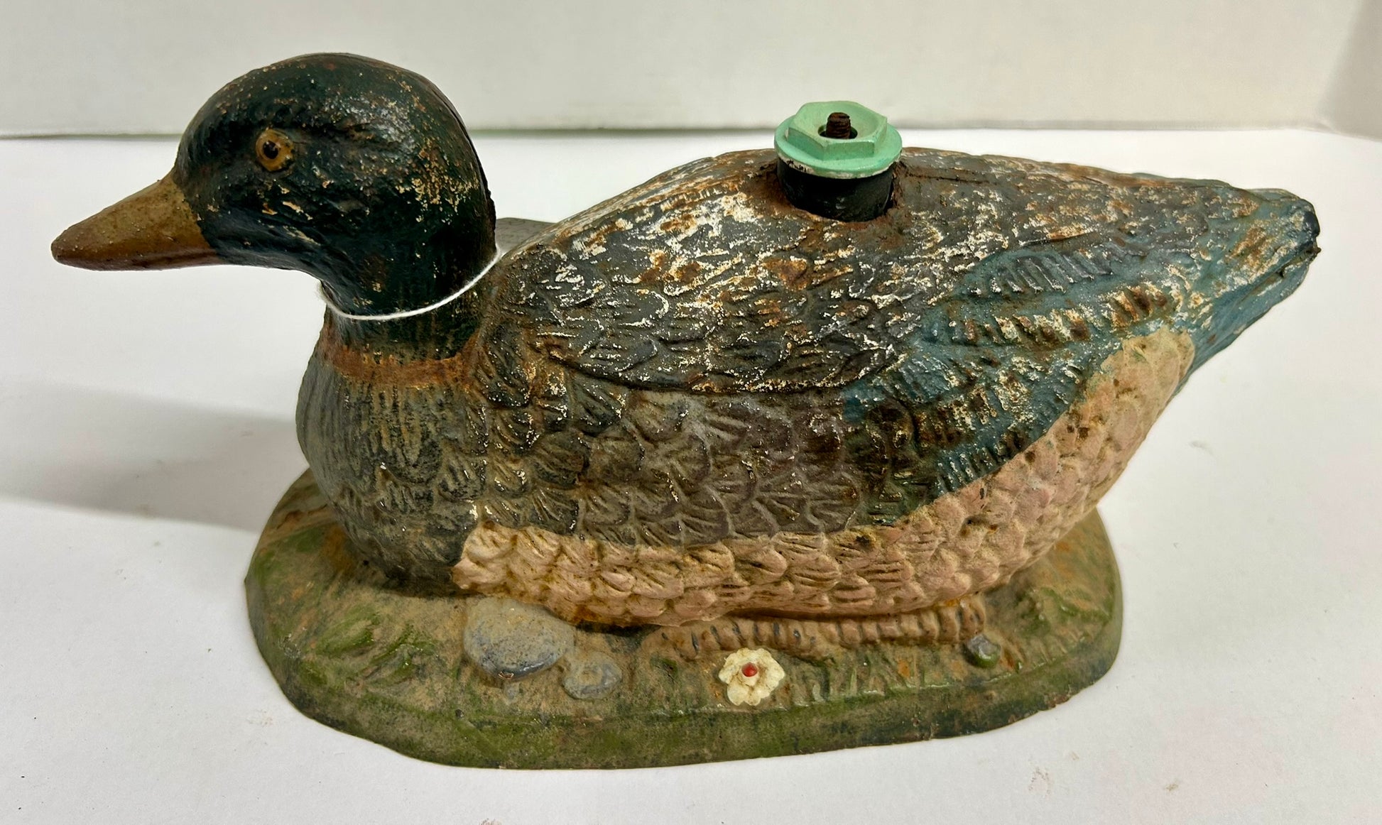 ANTIQUE CAST IRON FIGURAL DUCK ON GRASS LAWN SPRINKLER