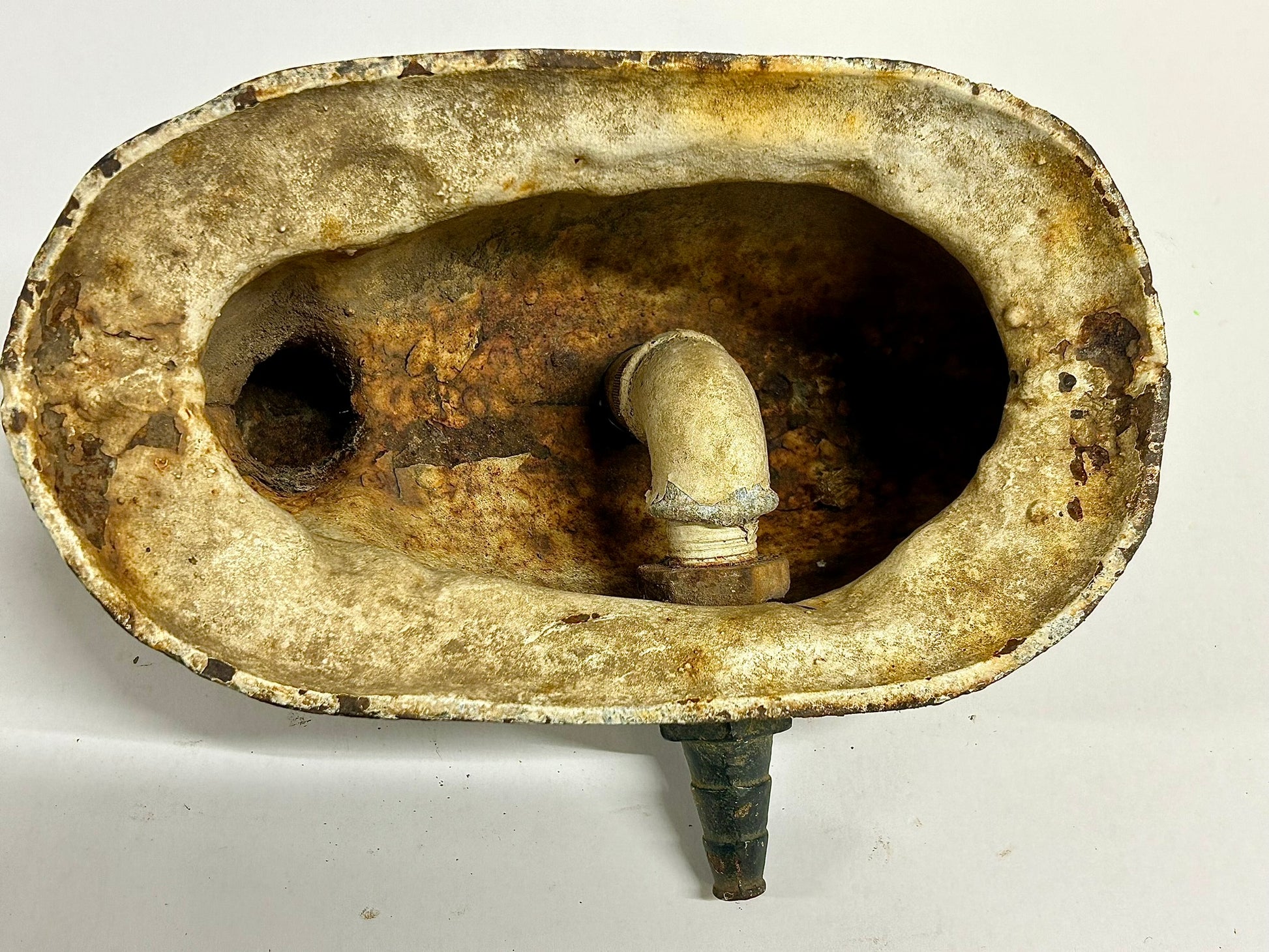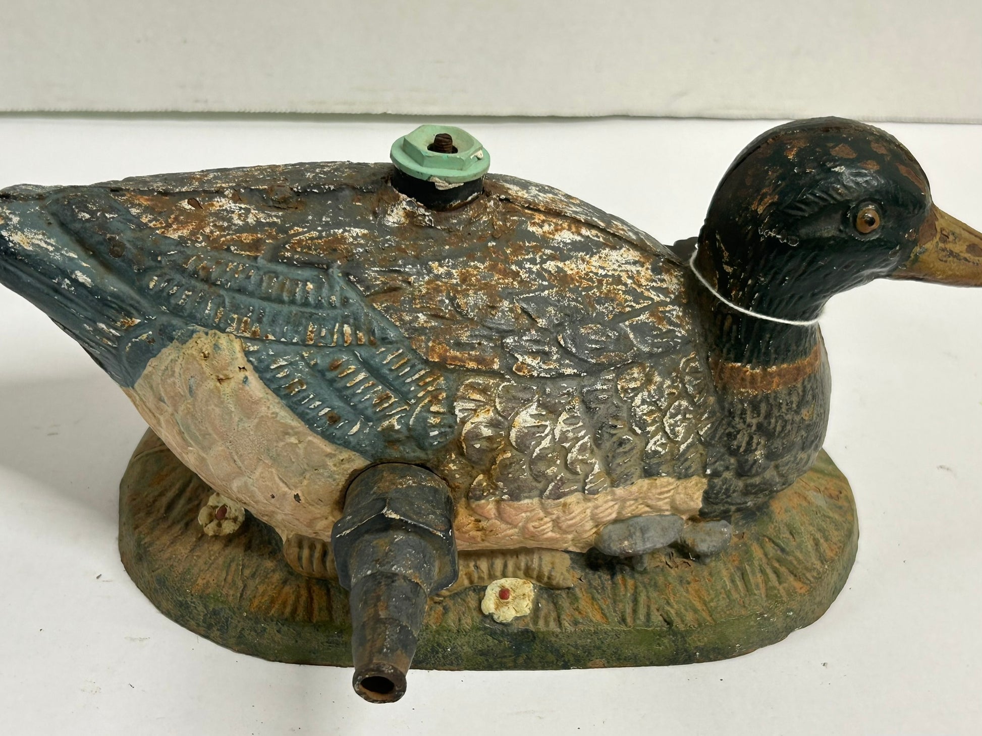 ANTIQUE CAST IRON DUCK ON GRASS FIGURAL LAWN SPRINKLER 11" LONG X 7". CALL OR TEXT FOR MORE INFORMATION