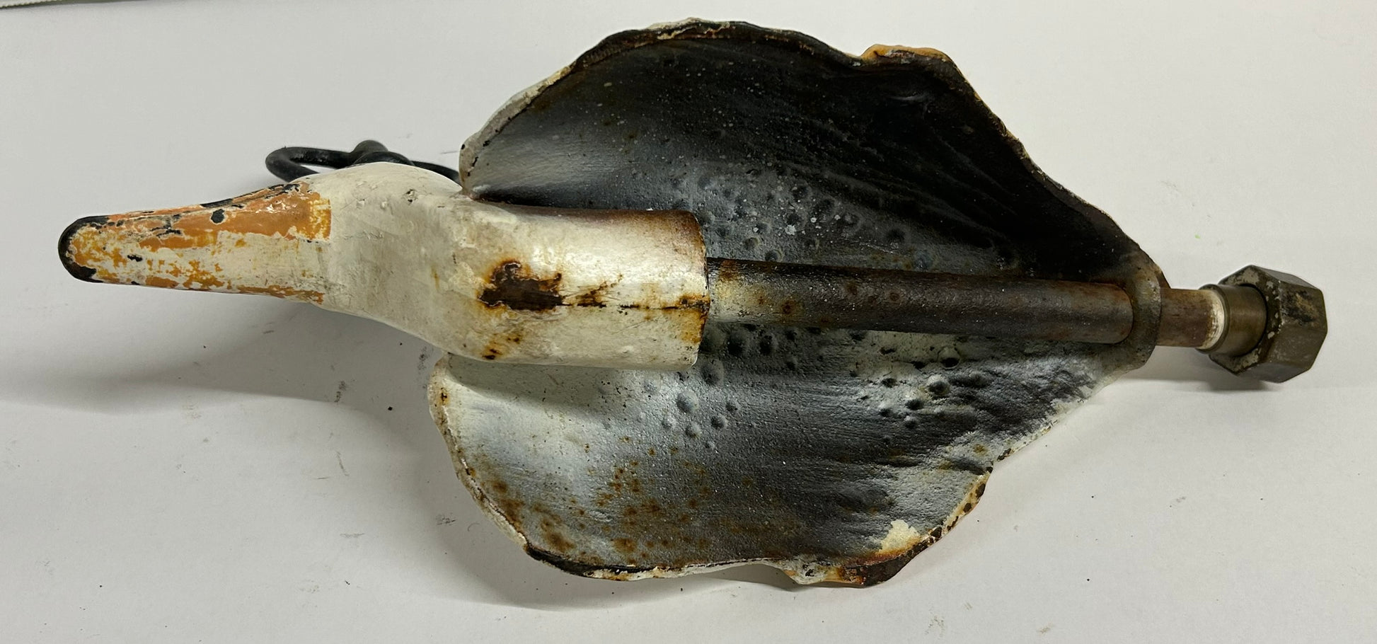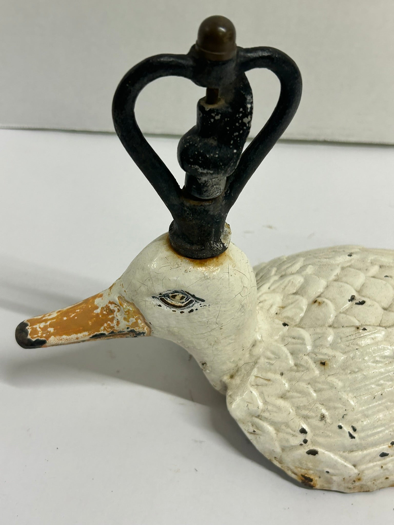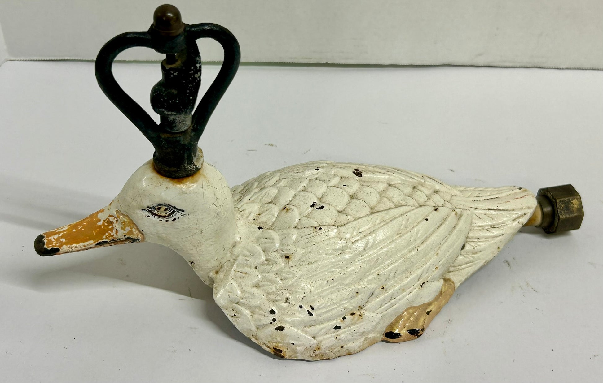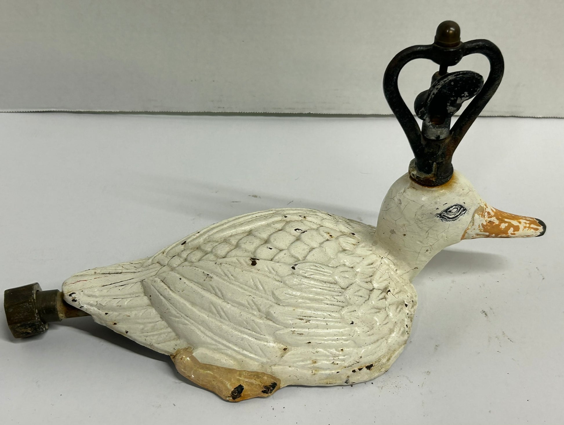 ANTIQUE CAST IRON FIGURAL DUCK LAWN SPRINKLER WITH GREAT ORIGINAL WHITE PAINT 14" LONG X 8" TALL. CALL OR TEXT FOR MORE INFORMATION