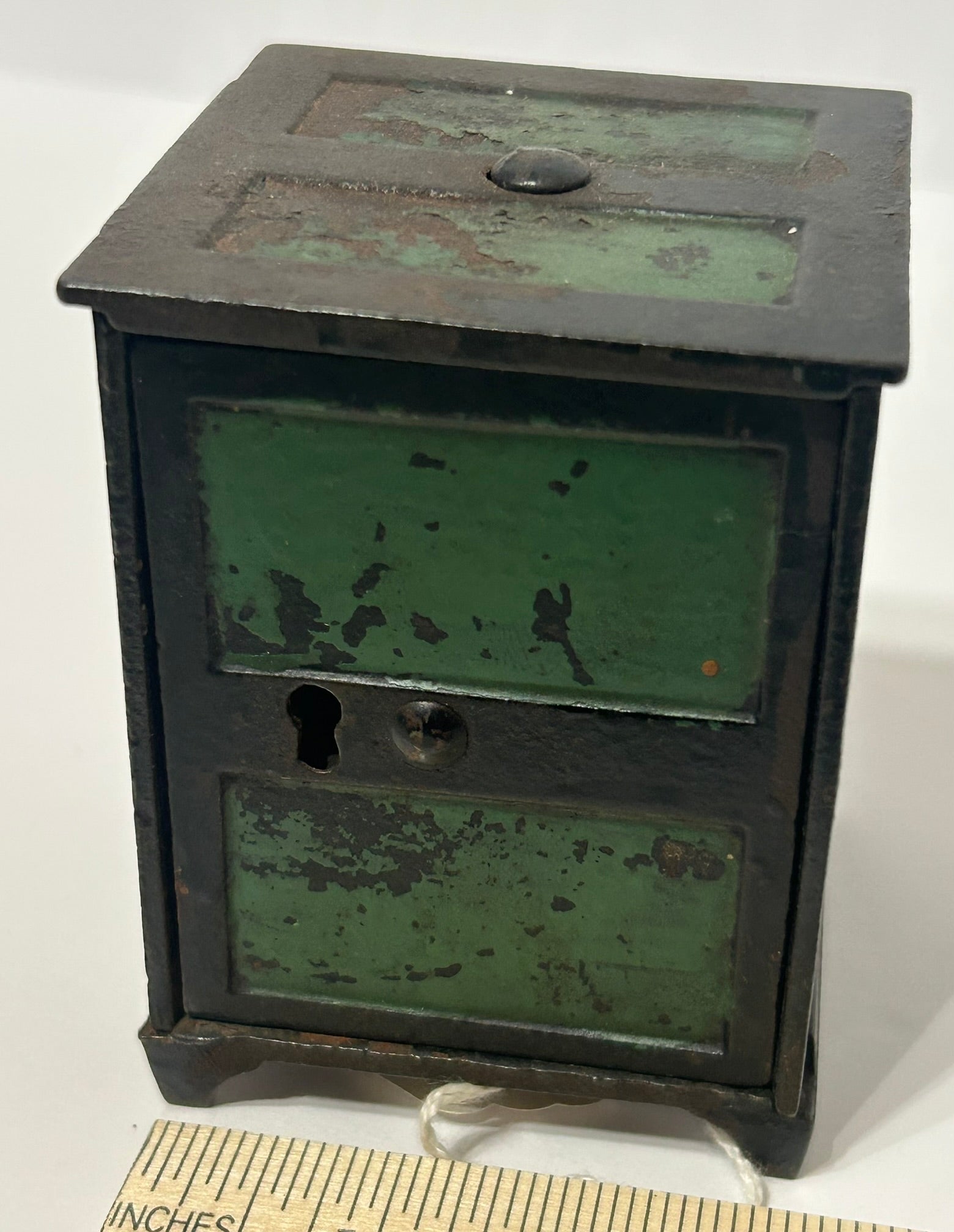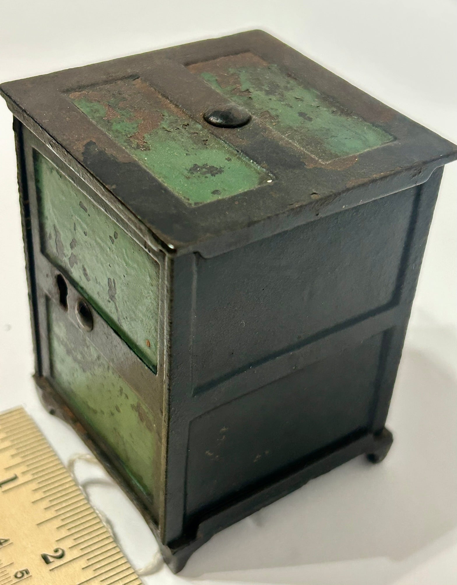 ANTIQUE CAST IRON MONEY BOX BANK 3 1/2" TALL. CALL OR TEXT FOR MORE INFORMATION