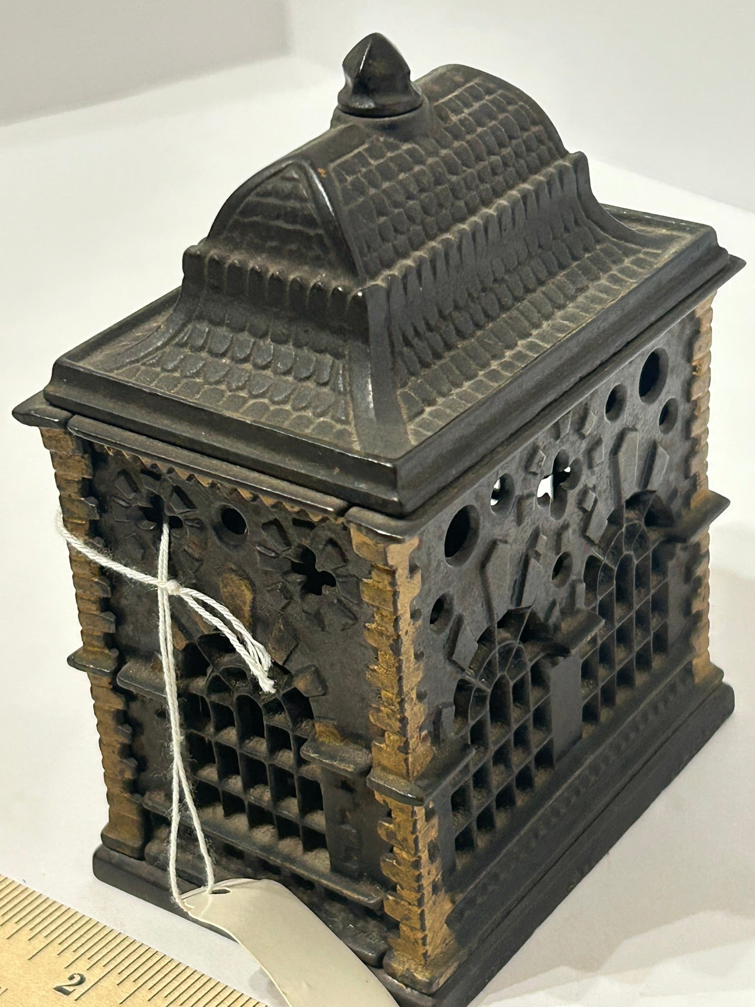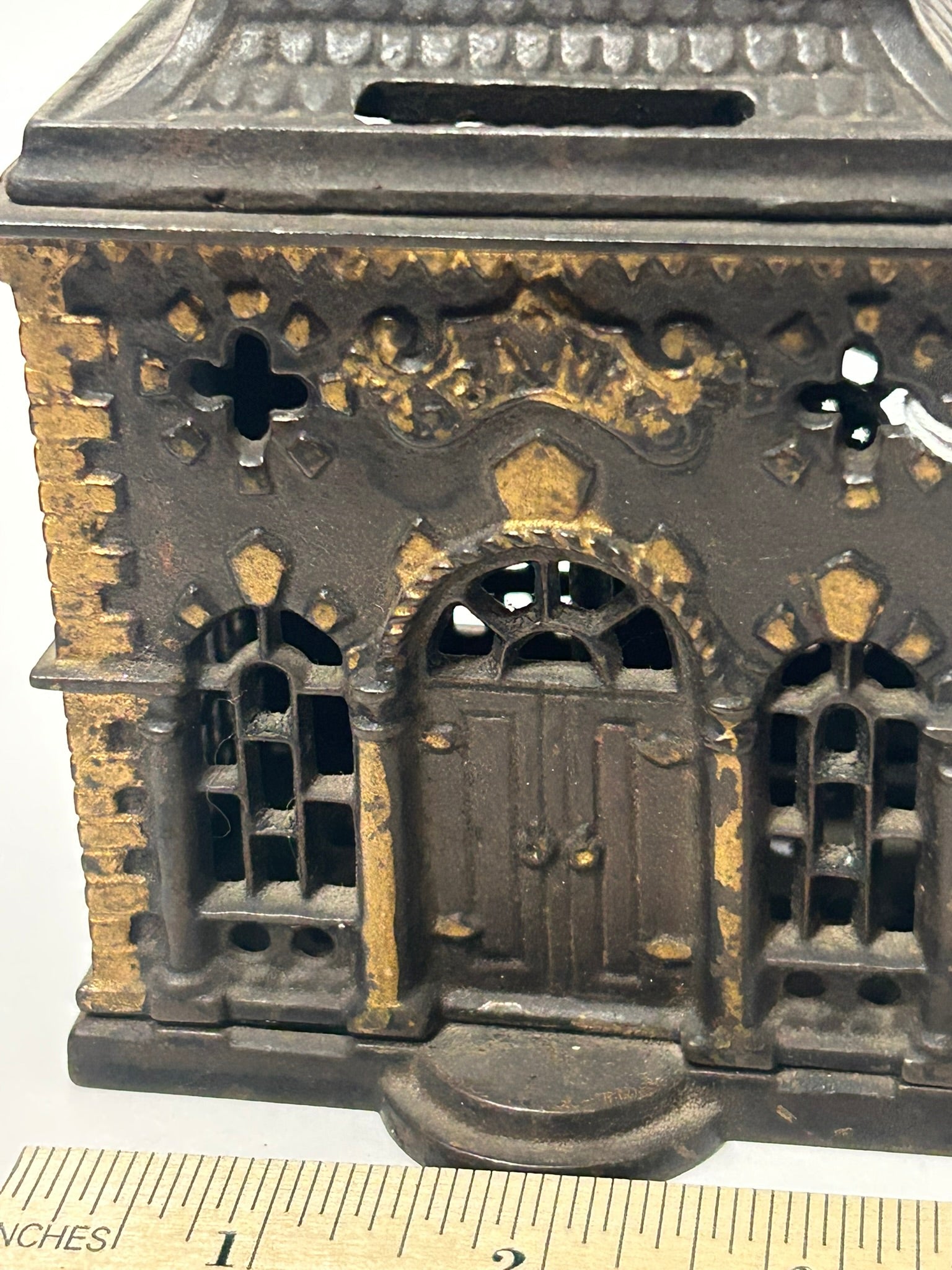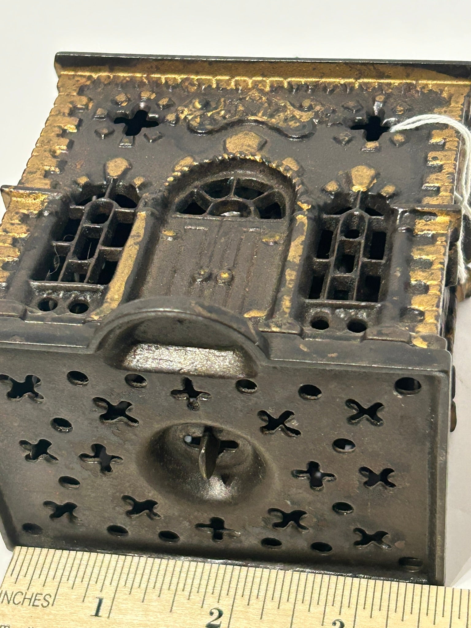 ANTIQUE CAST IRON HARD TO FIND "ROOF" SAVINGS BANK 5" TALL. CALL OR TEXT FOR MORE INFORMATION