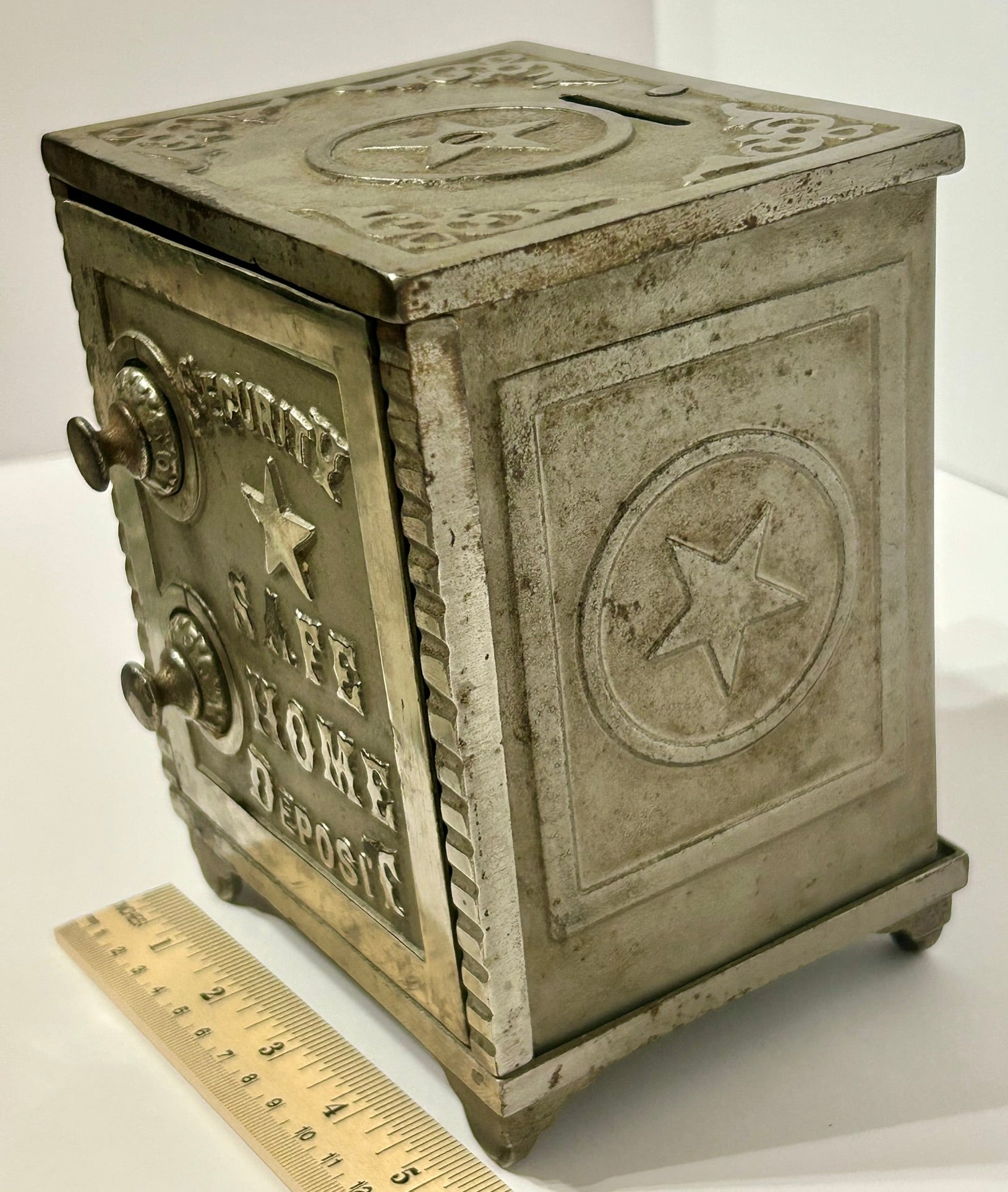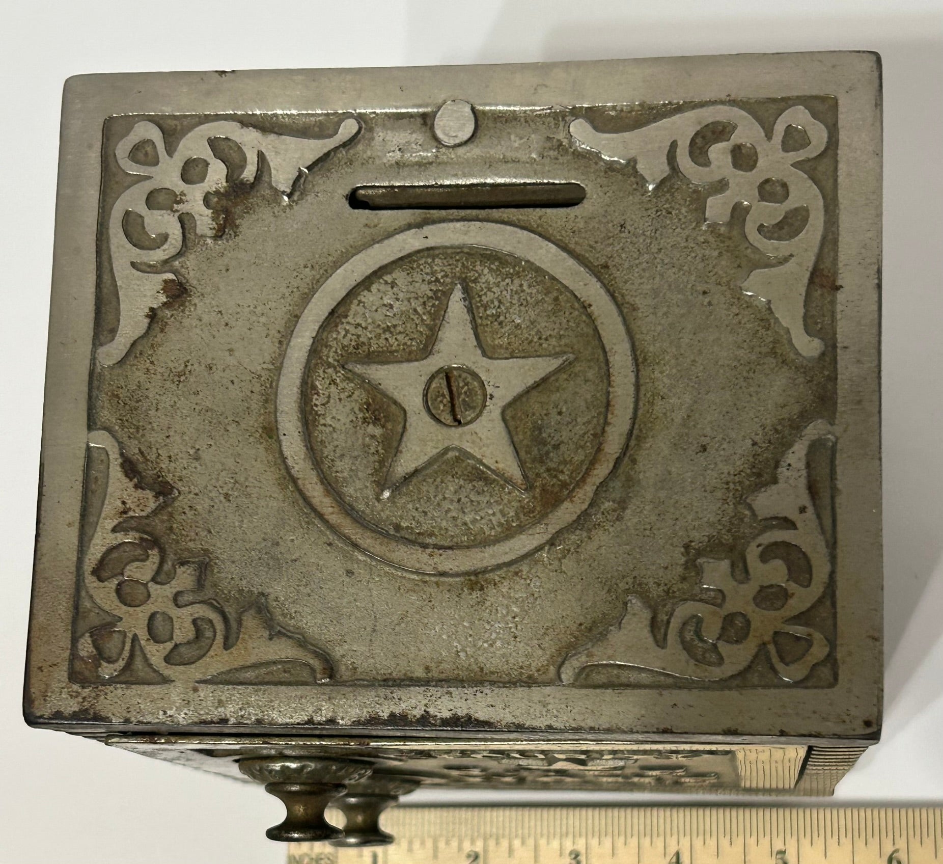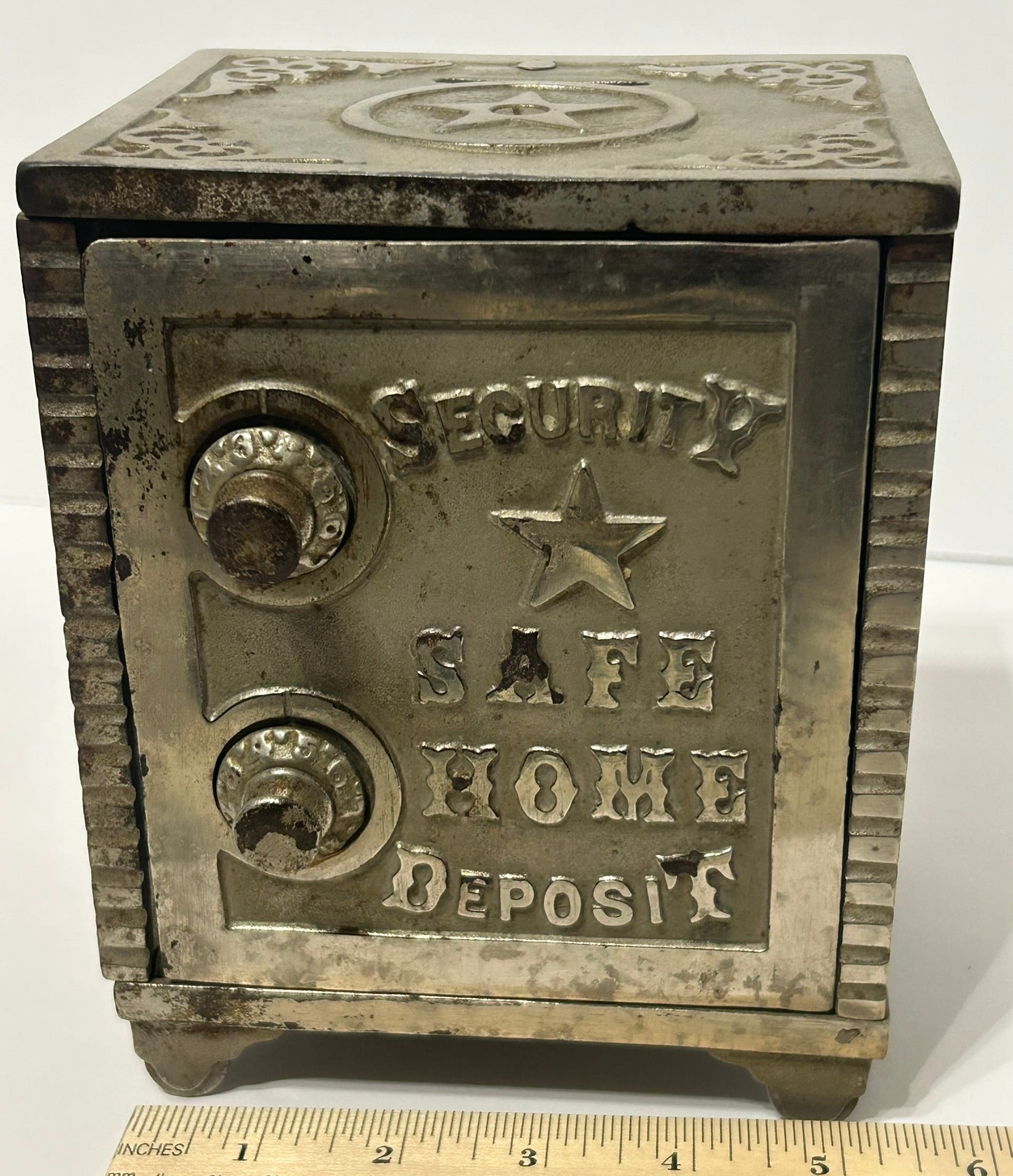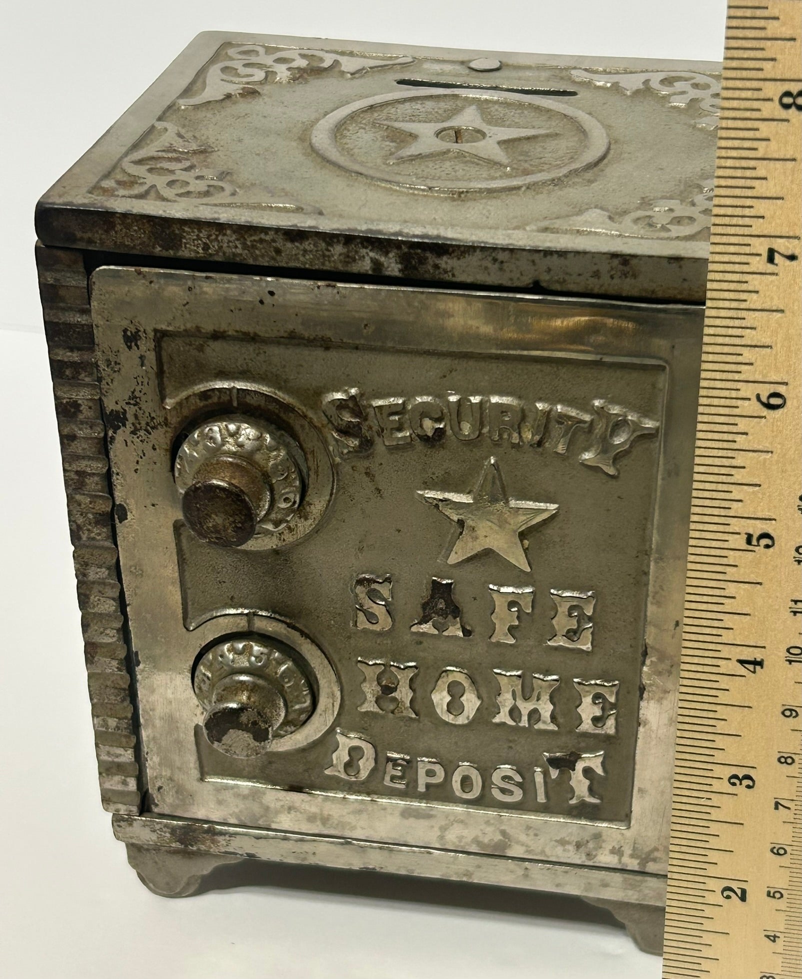 ANTIQUE CAST IRON SECURITY SAFE LARGE BANK 7" TALL X 5 1/2" X 4 1/2". CALL OR TEXT FOR MORE INFORMATION