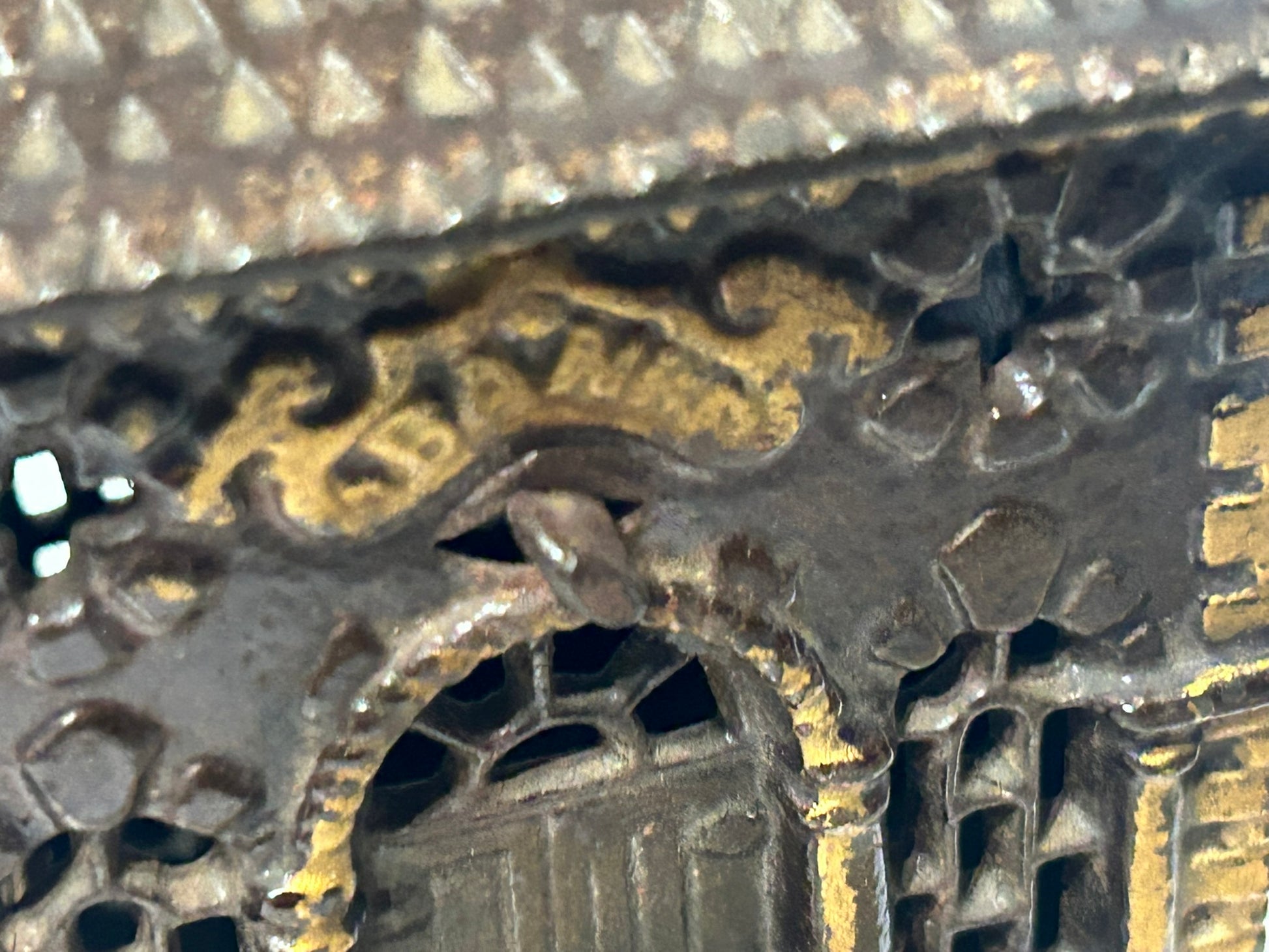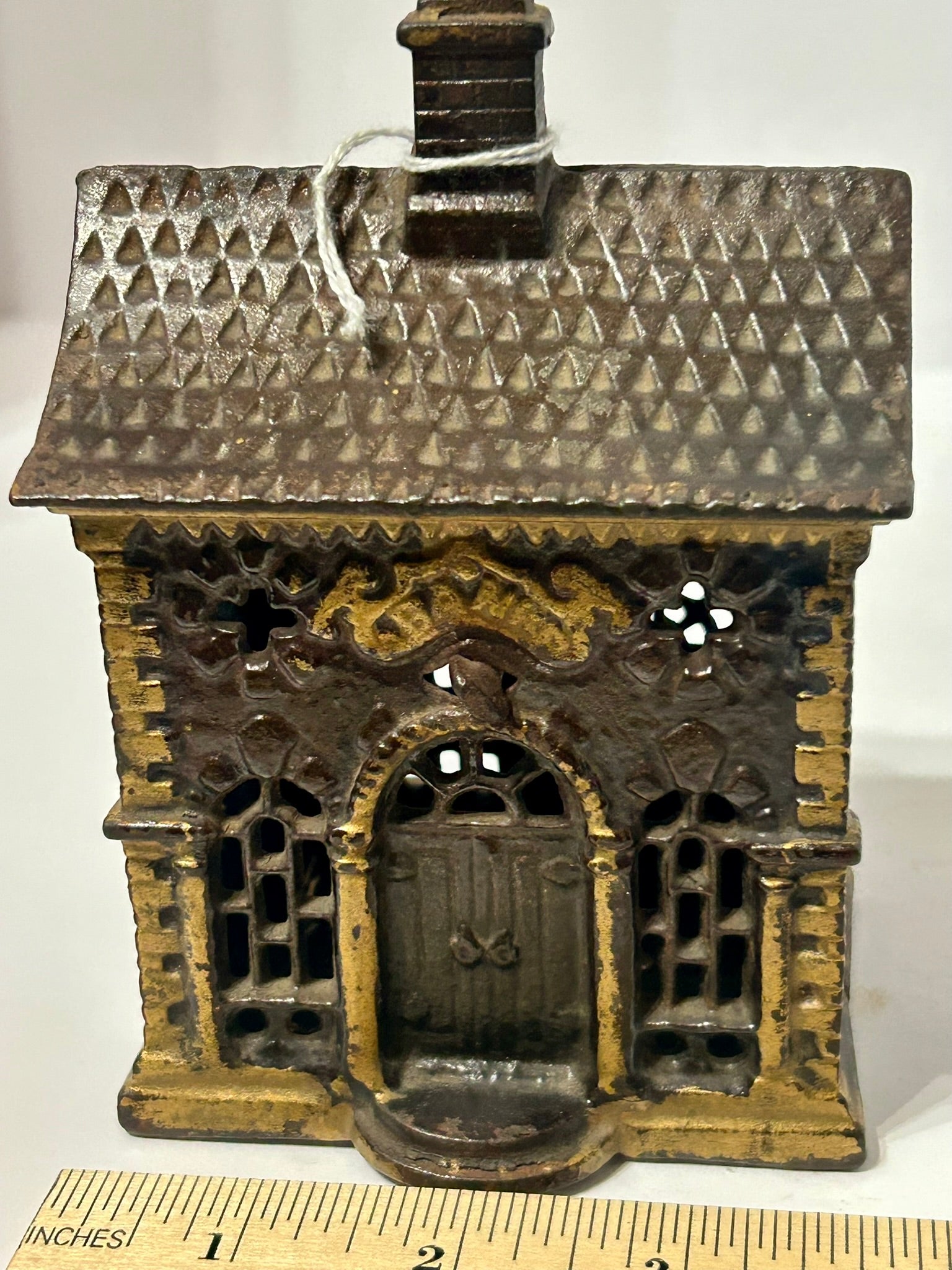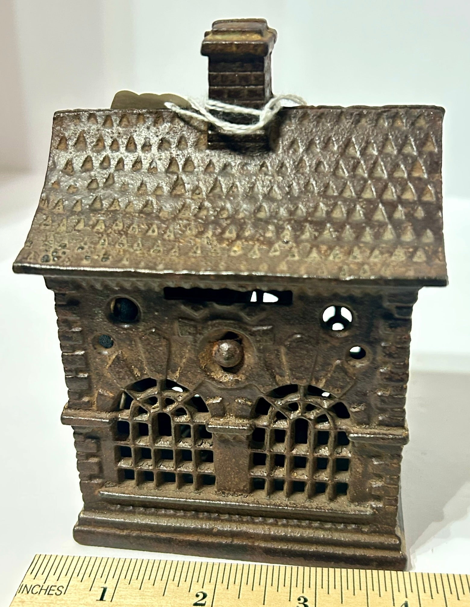 ANTIQUE CAST IRON SLOPE STATE BANK 5 1/2" TALL. CALL OR TEXT FOR MORE INFORMATION