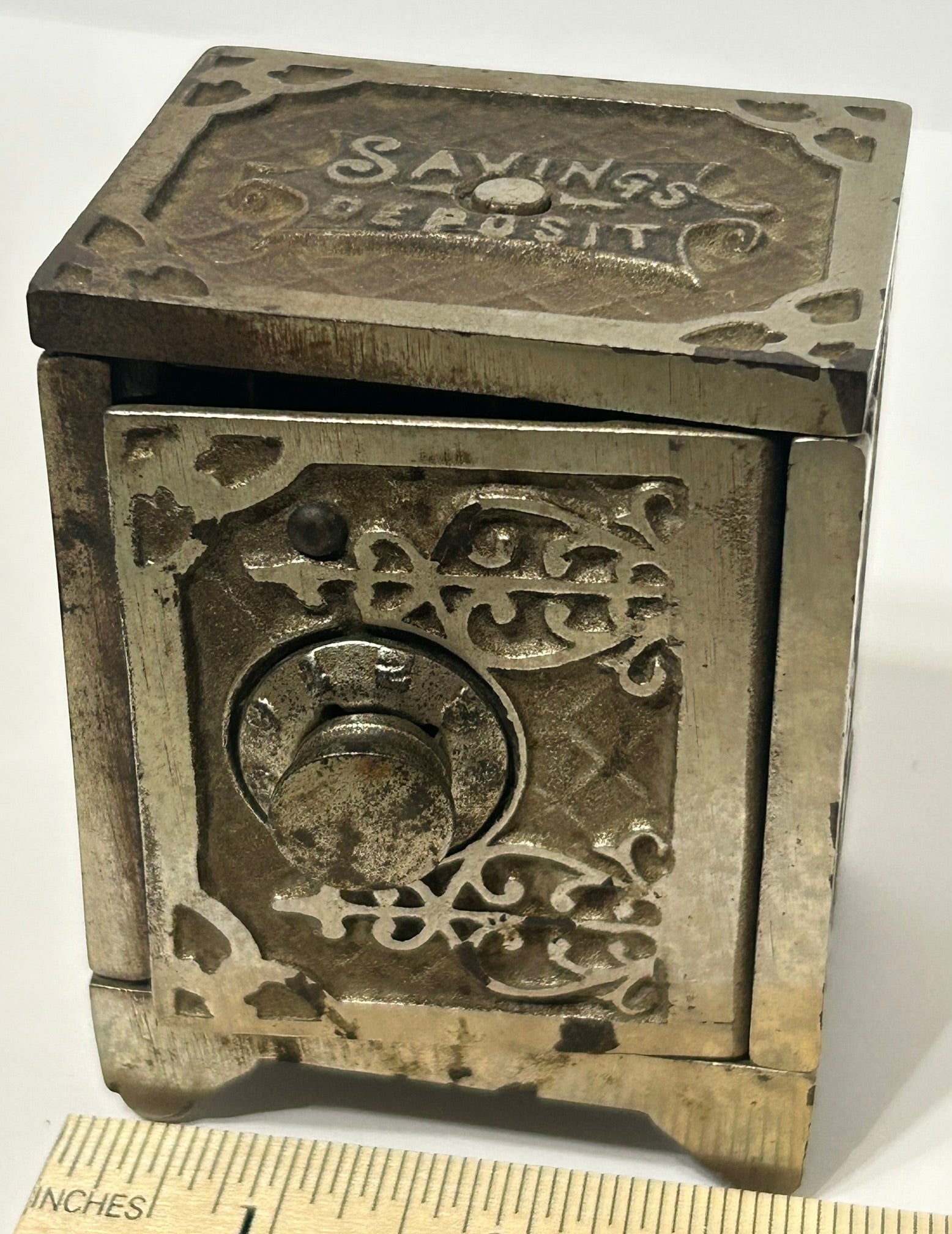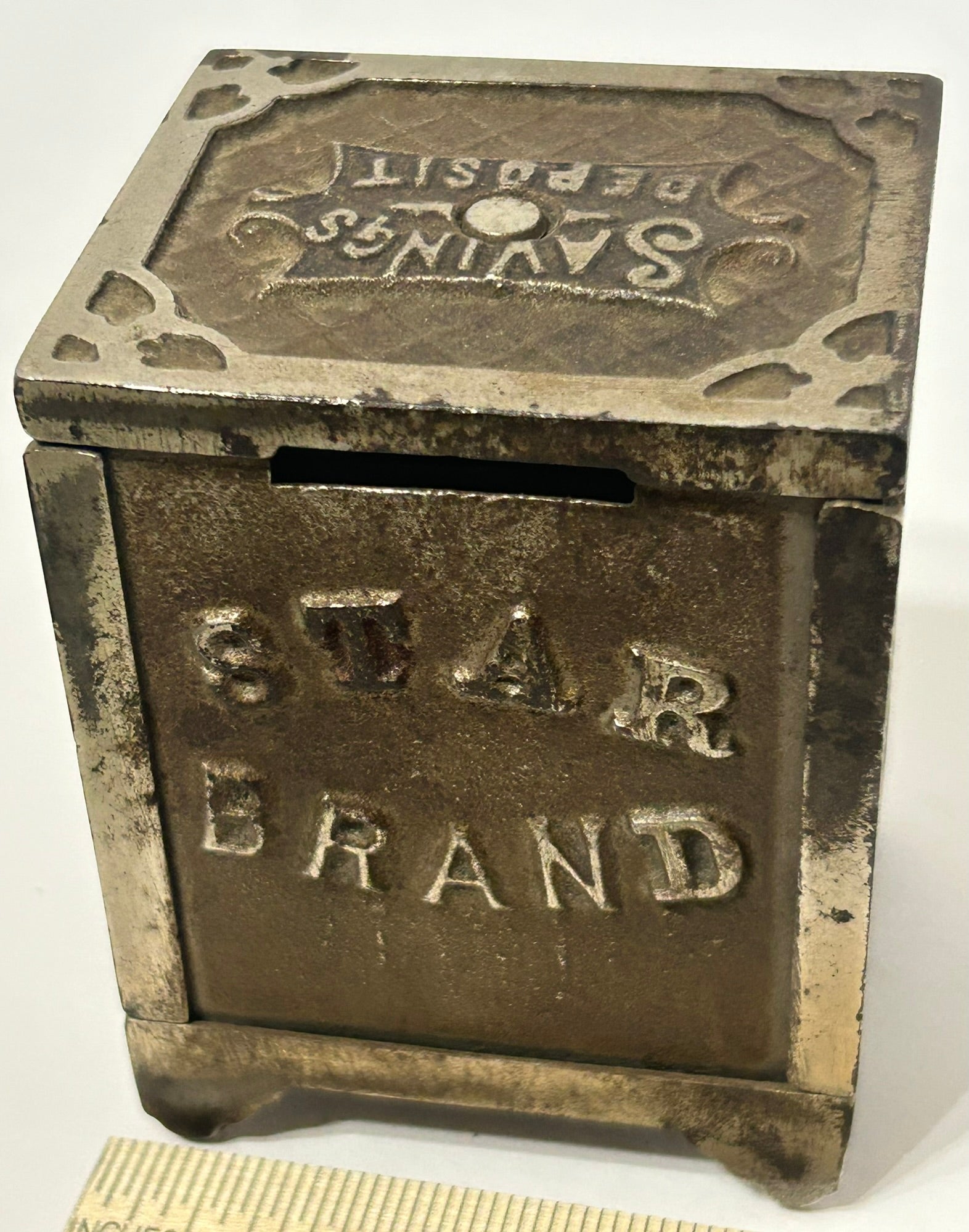 ANTIQUE STAR BRAND CAST IRON COMBINATON SAFE BANK 4" TALL X 3" WIDE. CALL OR TEXT FOR MORE INFORMATION