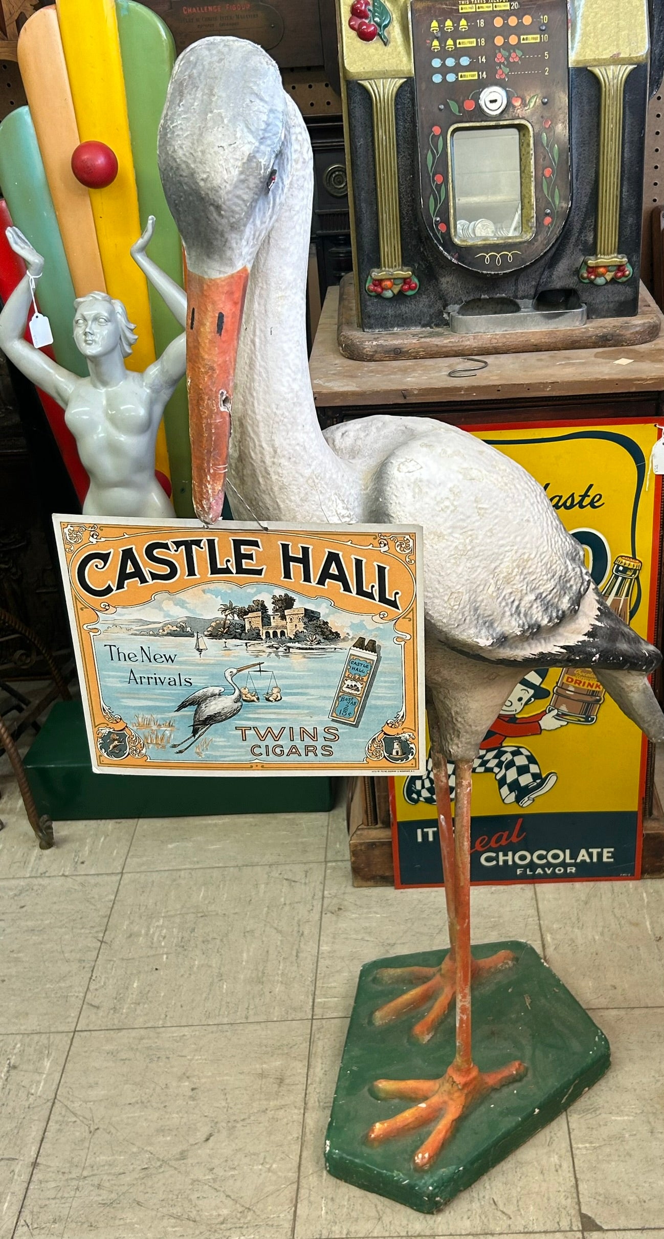 ANTIQUE CASTLE HALL TWINS PAPER MACHE FIGURAL STORK ADVERTISING FIGURE 48" TALL. CALL, TEXT, OR E-MAIL FOR MORE INFORMATION