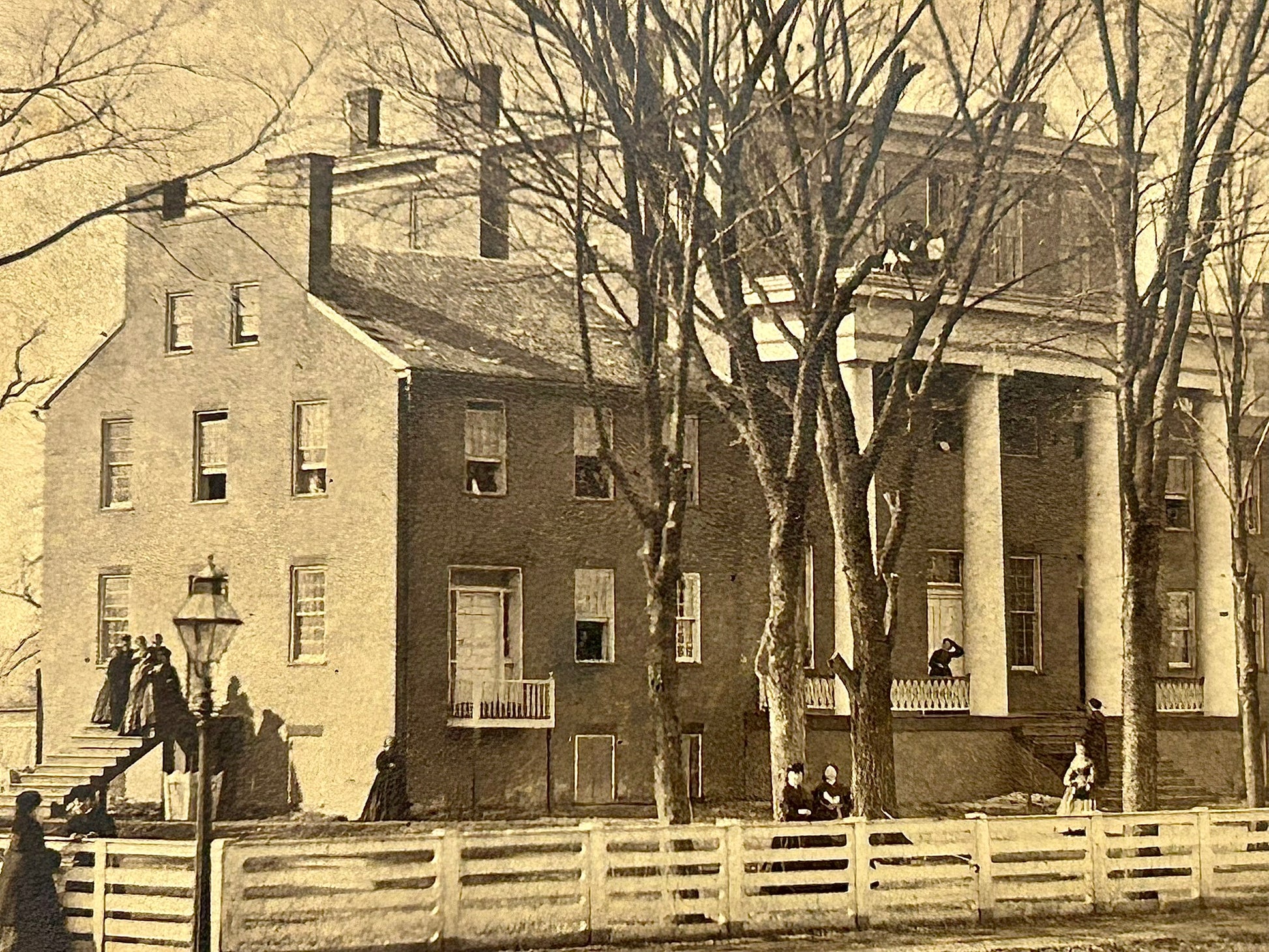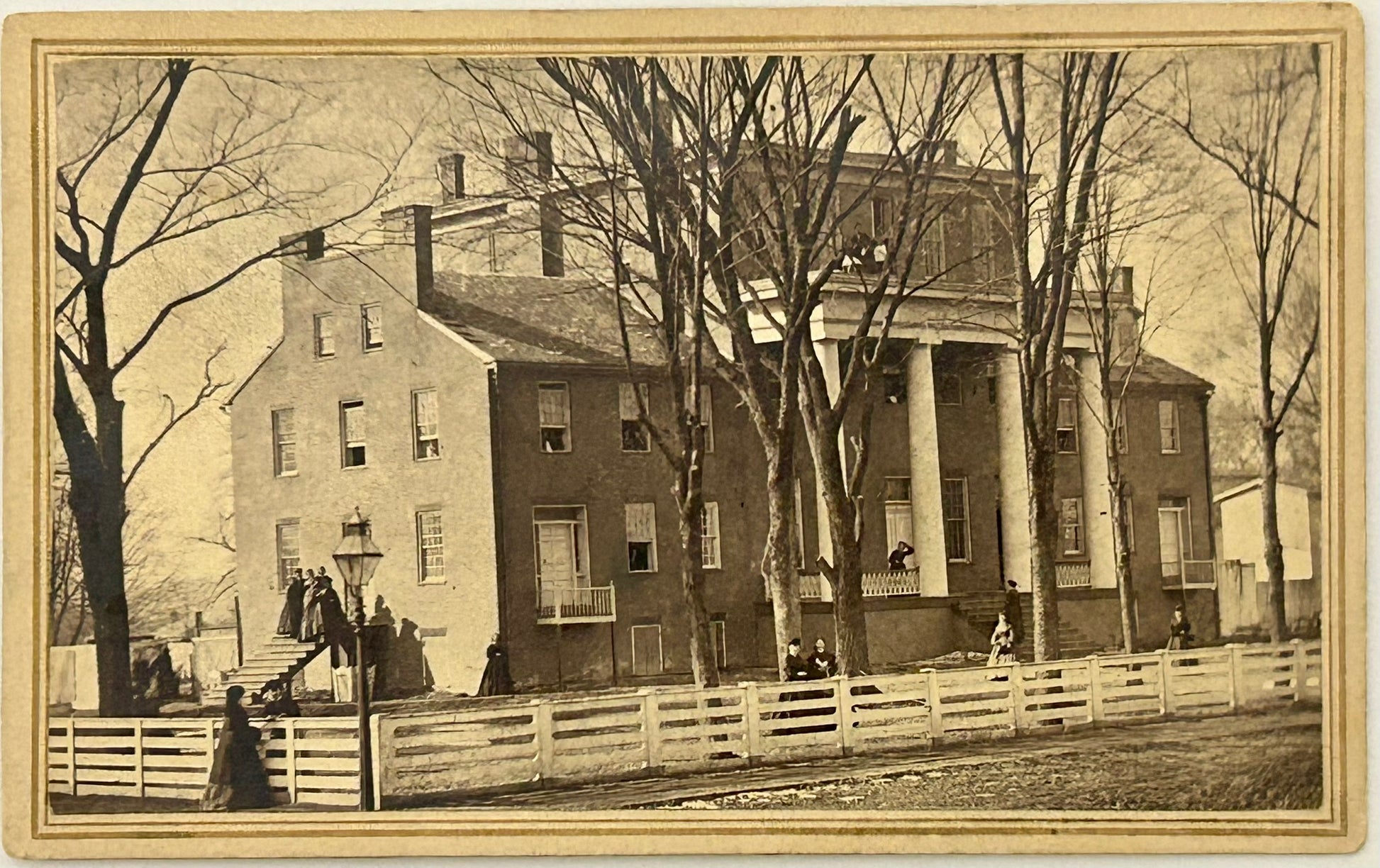 ANTIQUE CDV OUTDOOR PHOTOGRAPH OF LARGE BUILDING WITH PEOPLE
