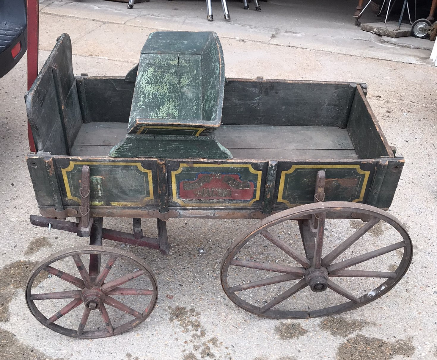 ANTIQUE CHILDS SIZE BADGER ADVERTISING WOOD FARM WAGON. CALL OR TEXT FOR MORE INFORMATION