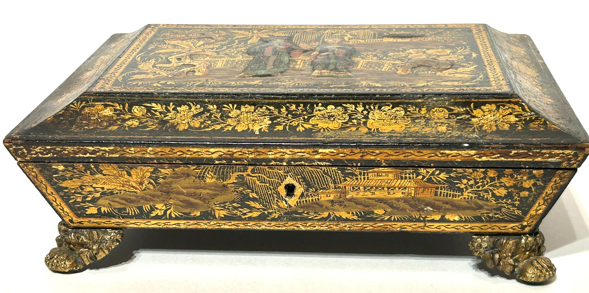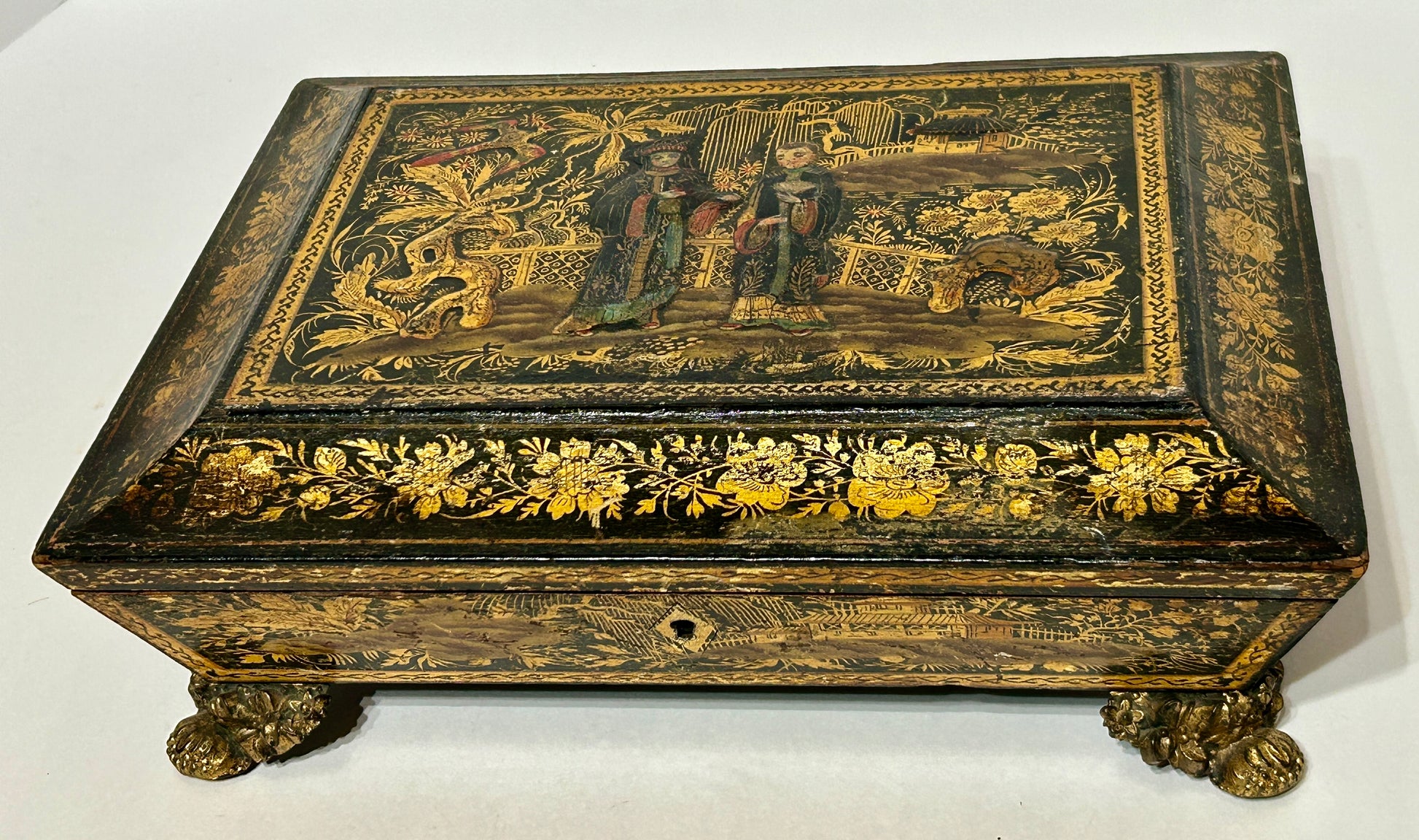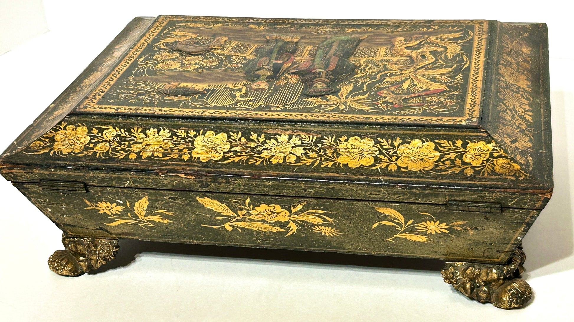 ANTIQUE CHINESE CHINOISERIE LACQUER BOX FROM 1800'S 12" X 9" X 3 1/4". SHIPPING IS EXTRA COST SO CALL OR TEXT TO FIND OUT WHAT COST TO SHIP IS