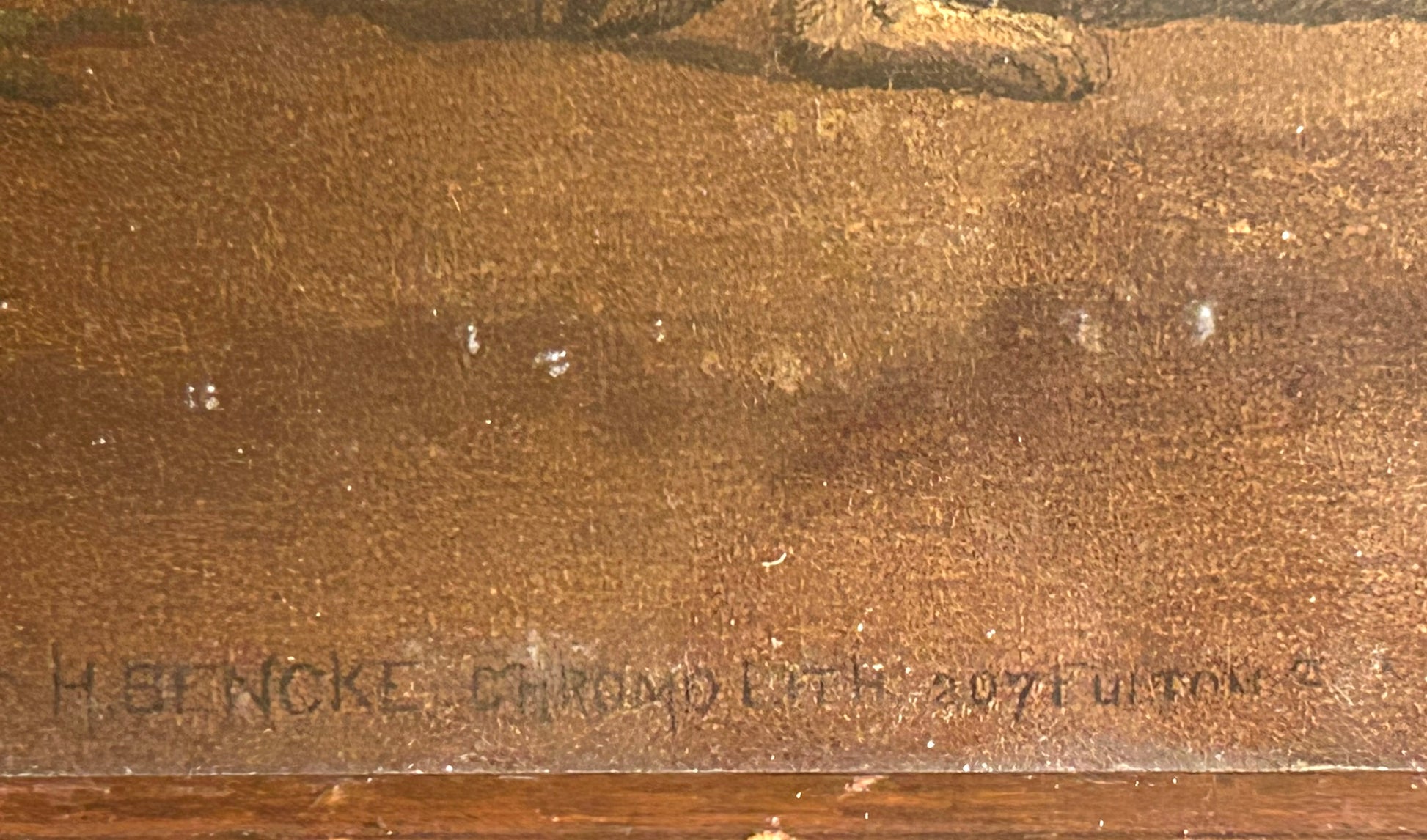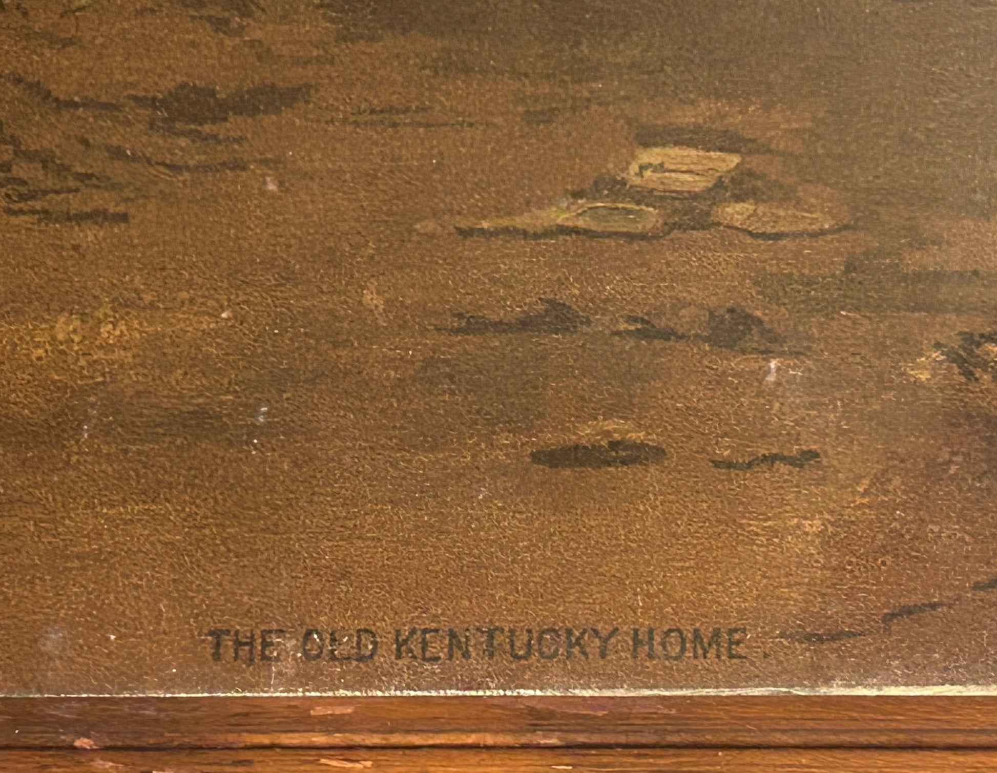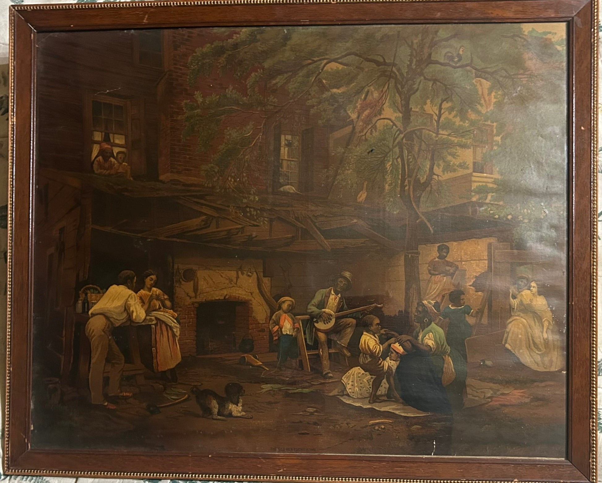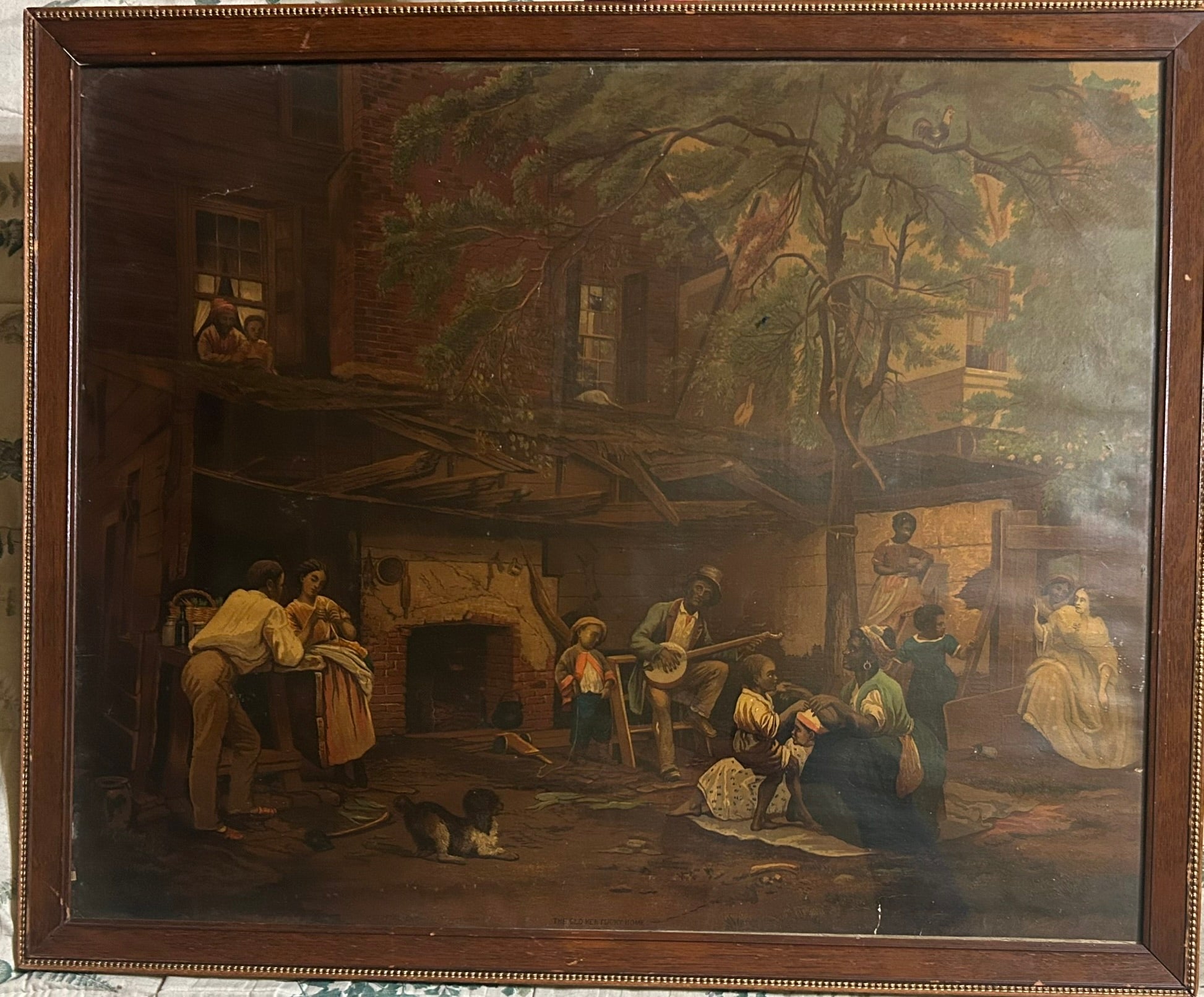 ANTIQUE CHROMO LITHO PRINT OF "THE OLD KENTUCKY HOME" FROM EASTMAN JOHNSON PAINTING AND PRINTED BY H. BENCKE NEW YORK IN 1870'S 26" X 32" INCLUDING FRAME. CALL OR TEXT FOR MORE INFORMATION
