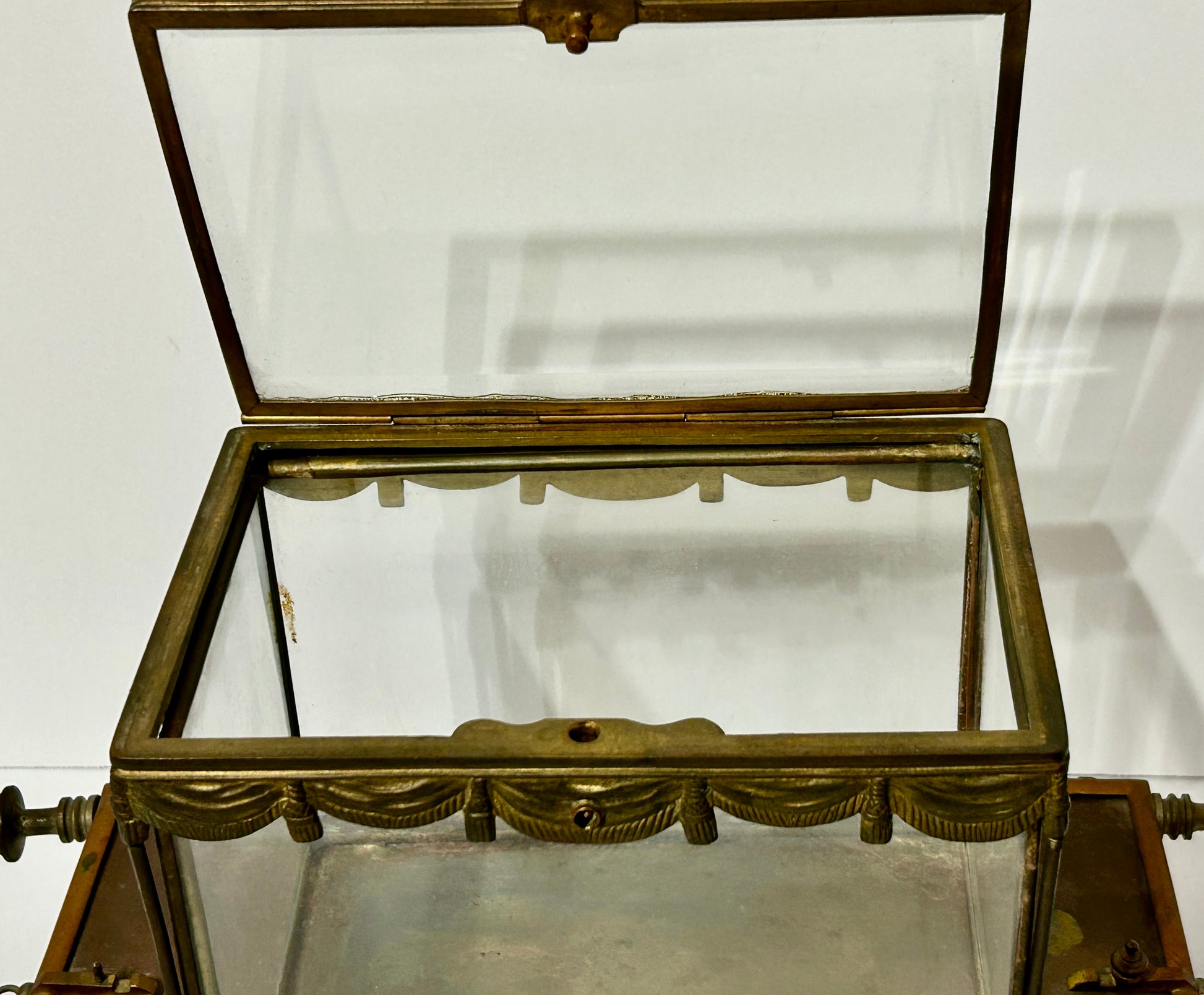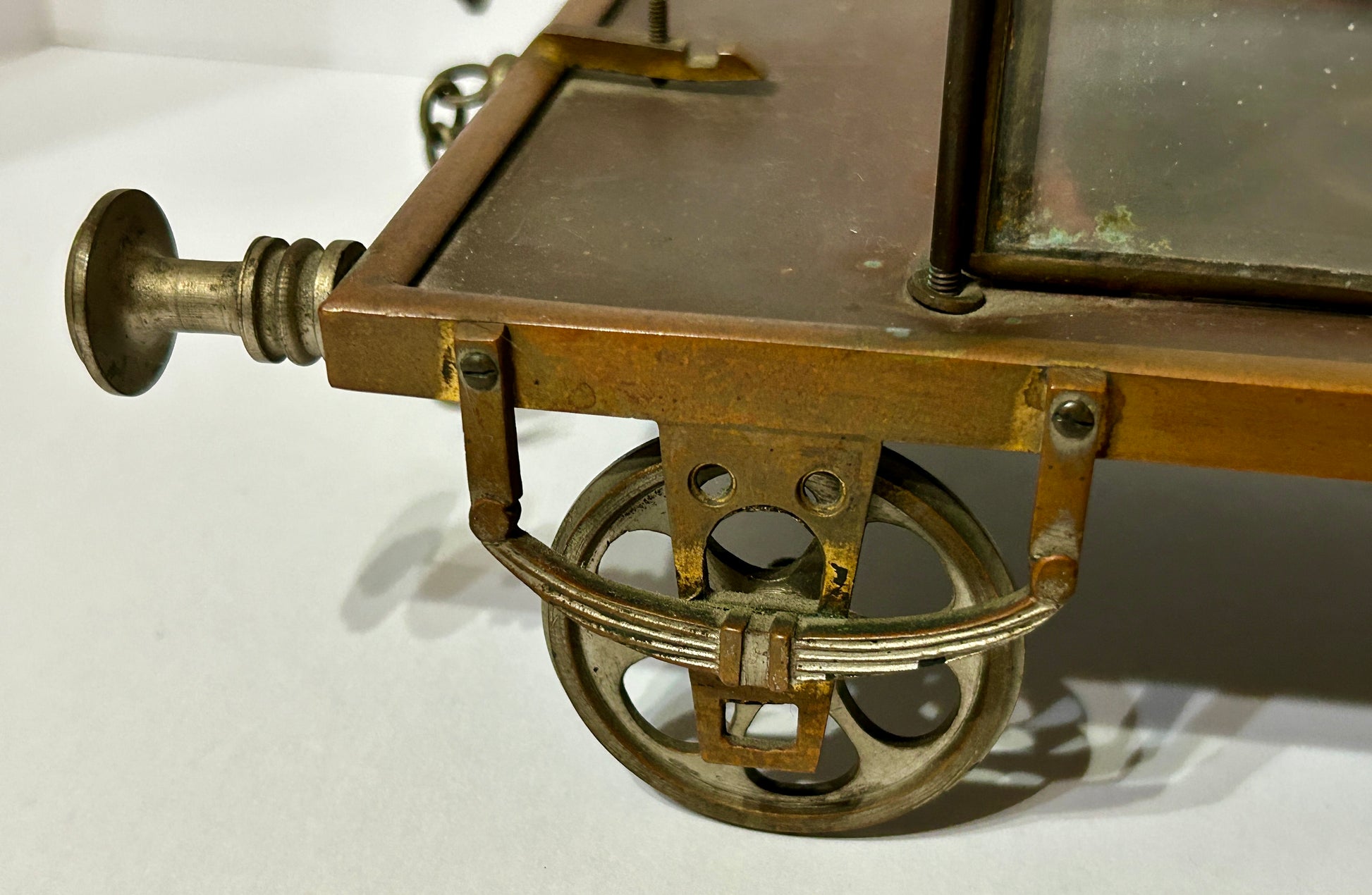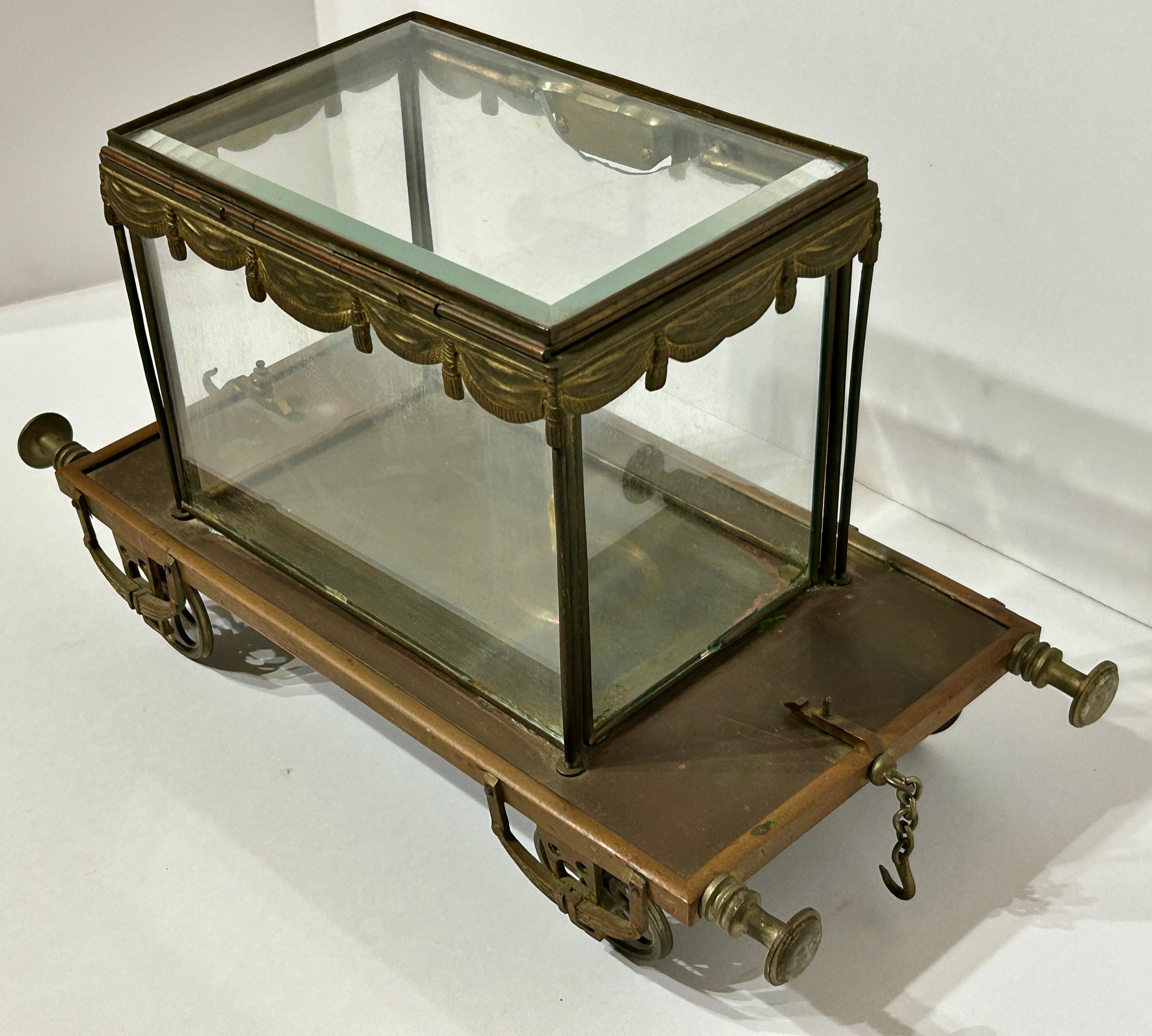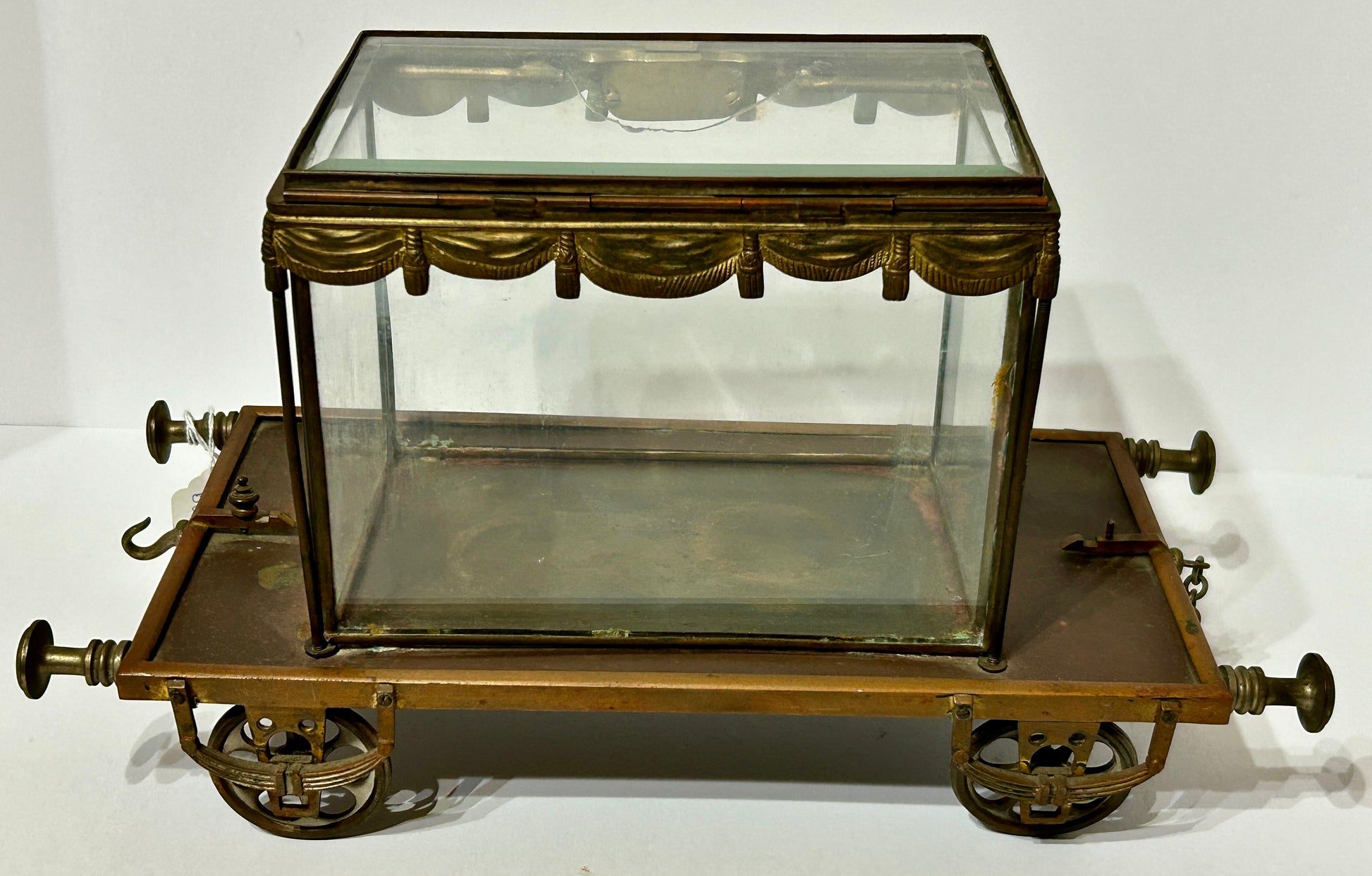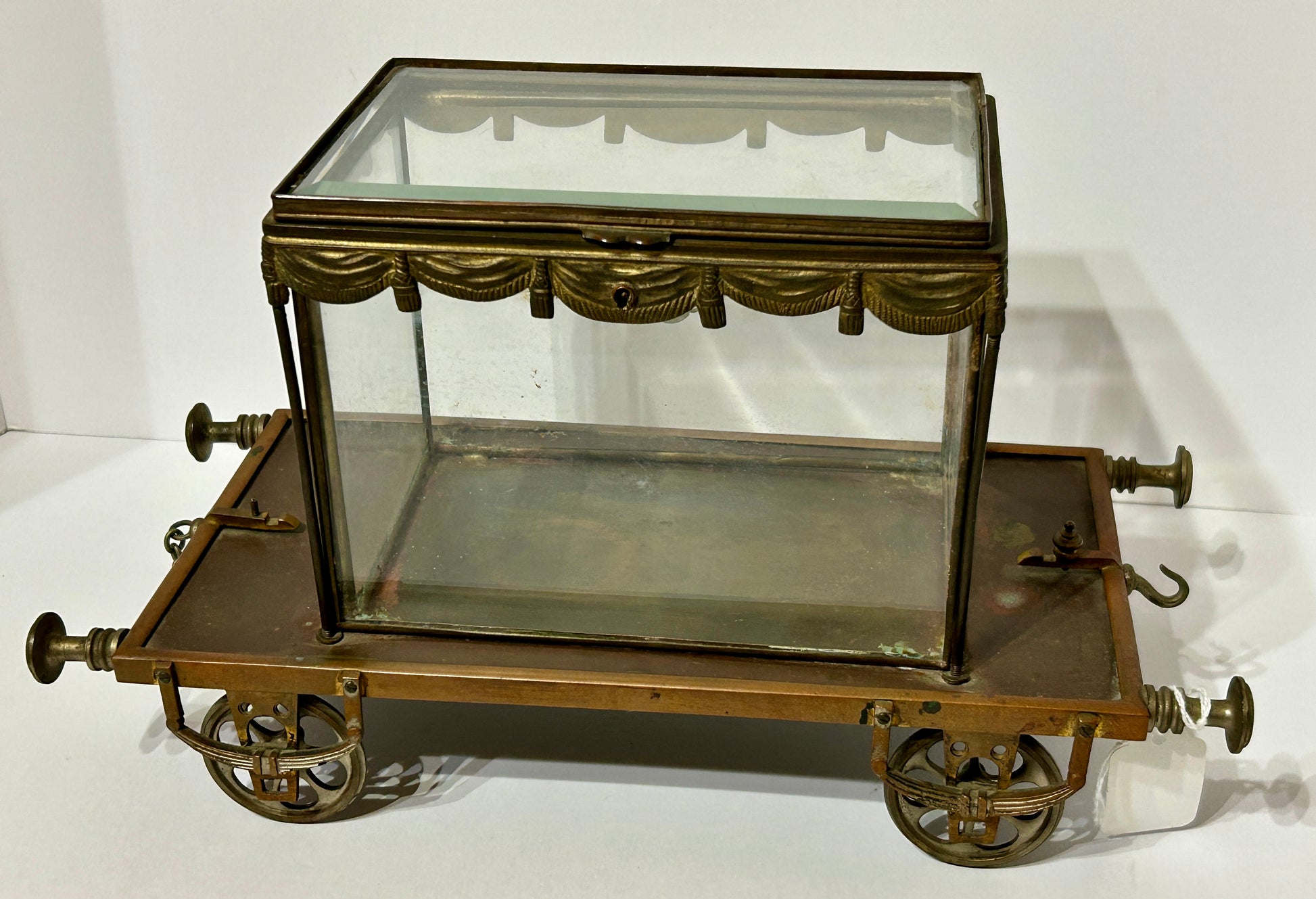 ANTIQUE CIGAR HUMIDOR ? SHAPED LIKE GLASS RAILROAD CAR WITH GREAT DETAIL ON WHEELS 13 1/2" LONG X 8" TALL X 6" DEEP - NOTE GLASS IS NOTCHED OUT AROUND LOCK TO ACCOMADATE THE LOCK AND IS MADE THAT WAY. CALL OR TEXT FOR MORE INFORMATION