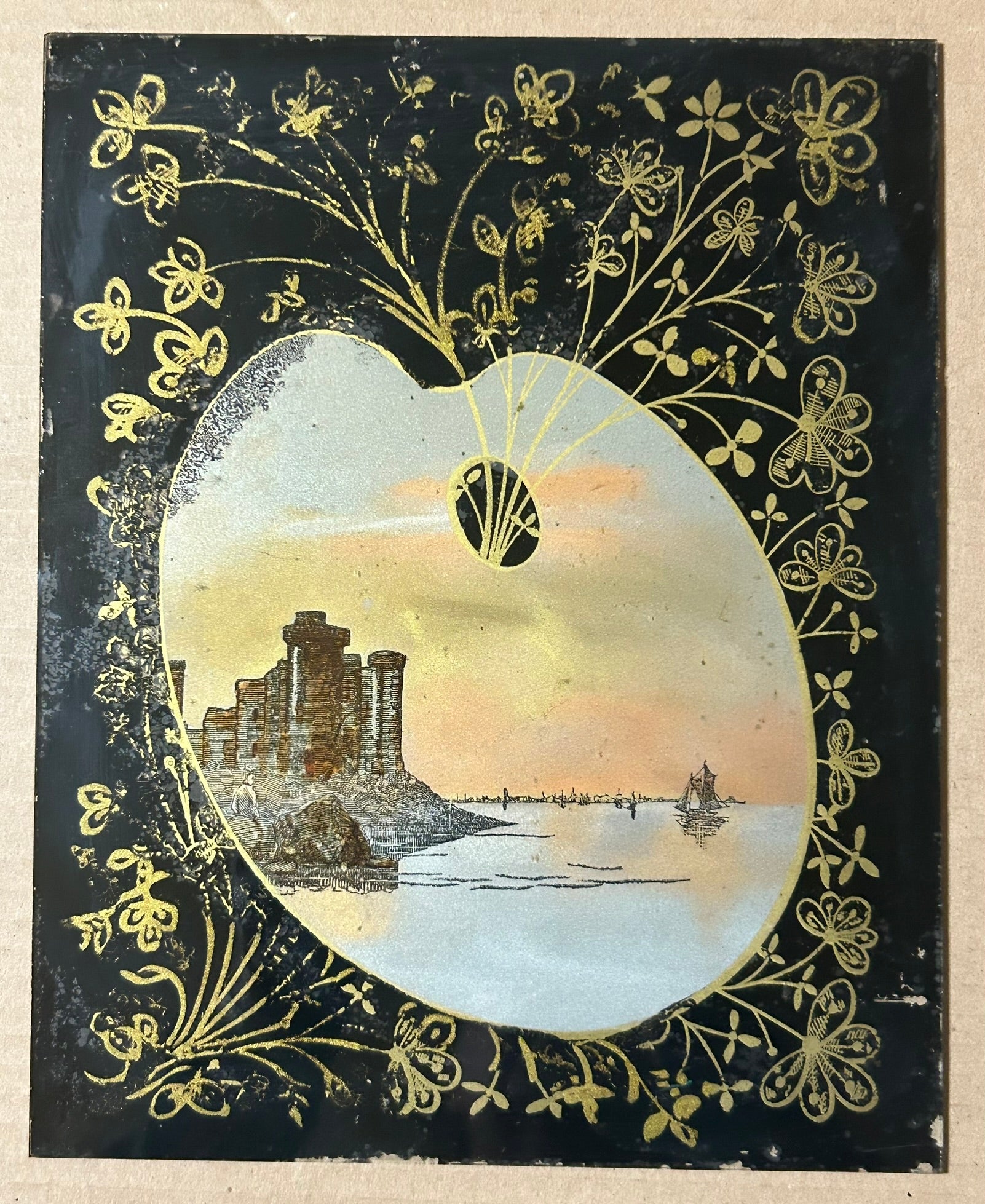 ANTIQUE CLOCK DOOR GLASS OF CASTLE SCENE 10" X 8". CALL OR TEXT FOR MORE INFORMATION