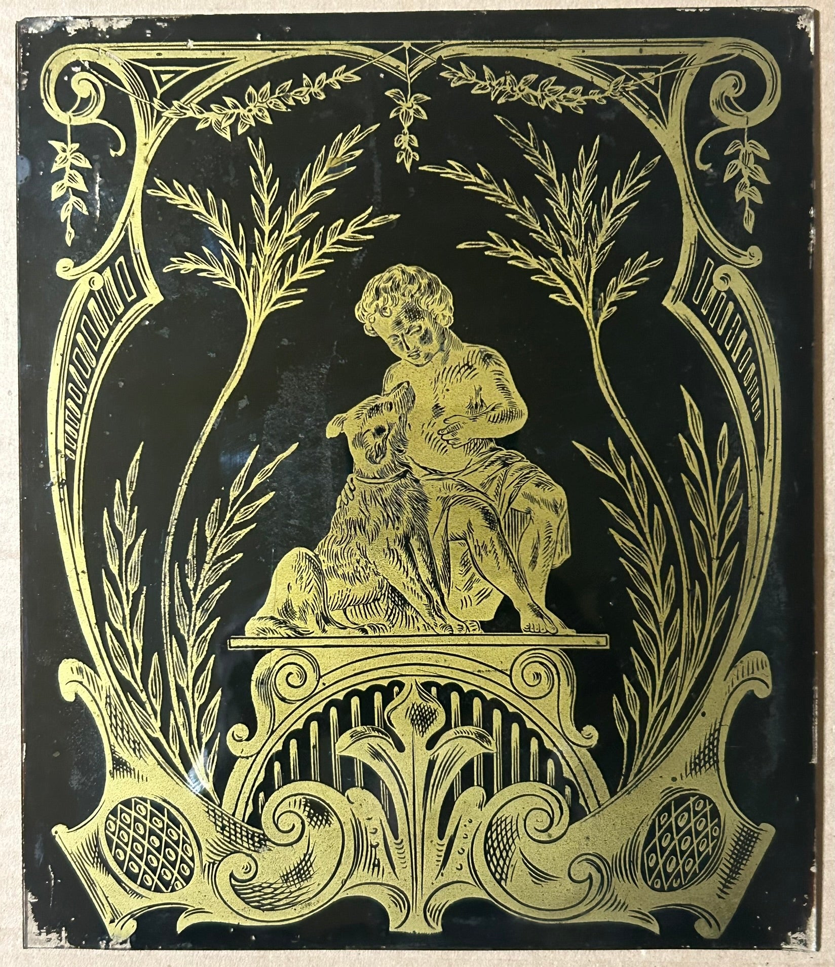 ANTIQUE CLOCK DOOR GLASS WITH BOY AND DOG SCENE