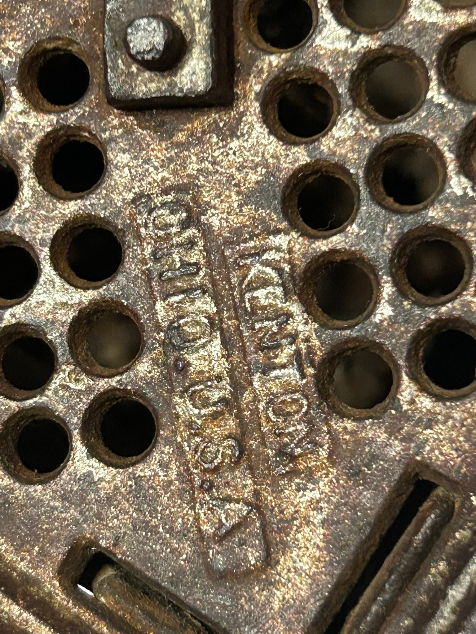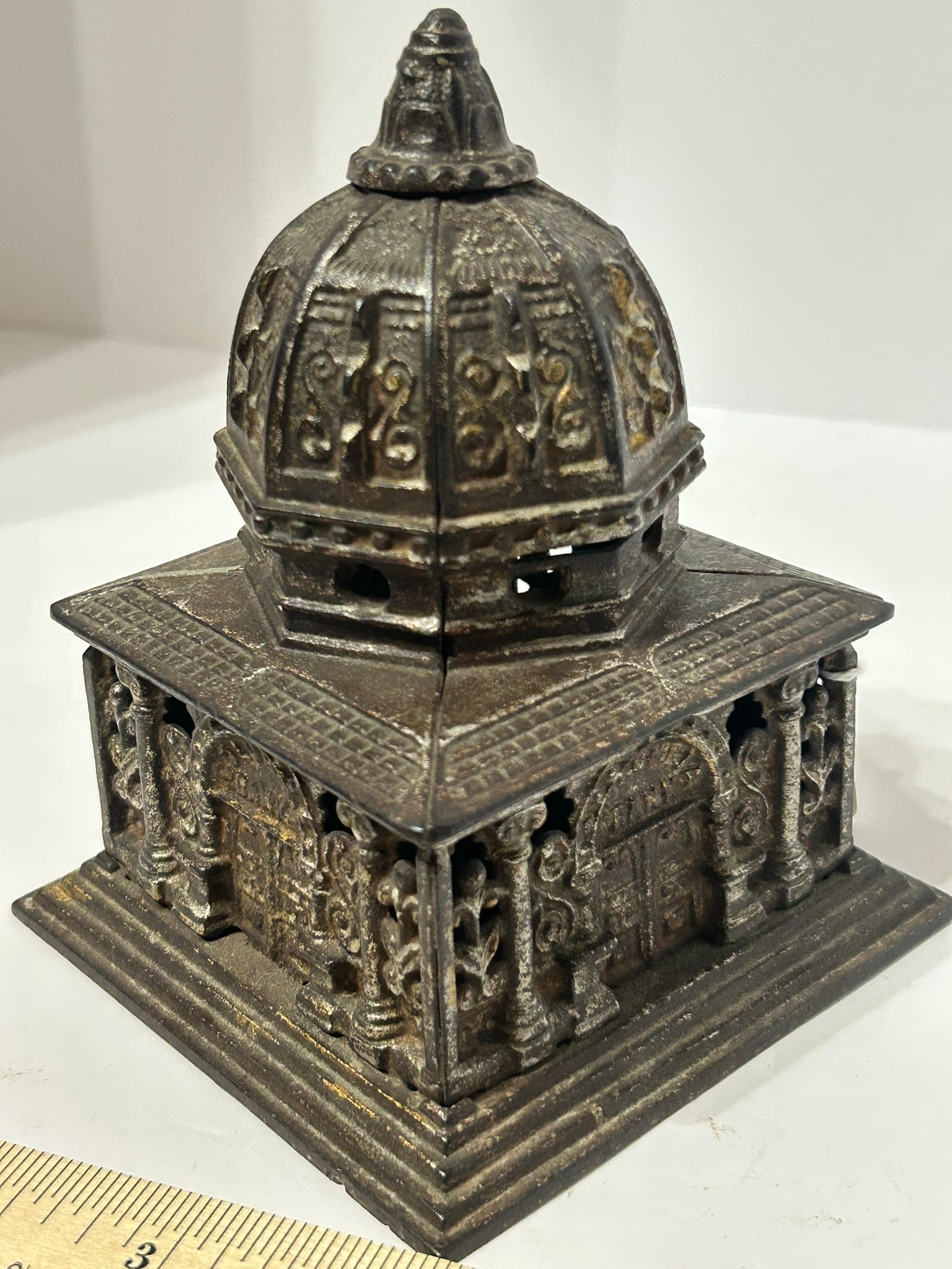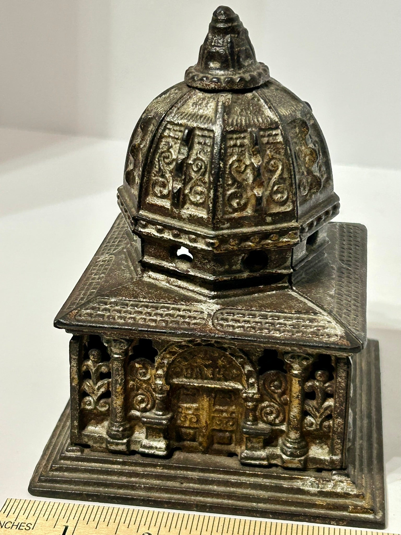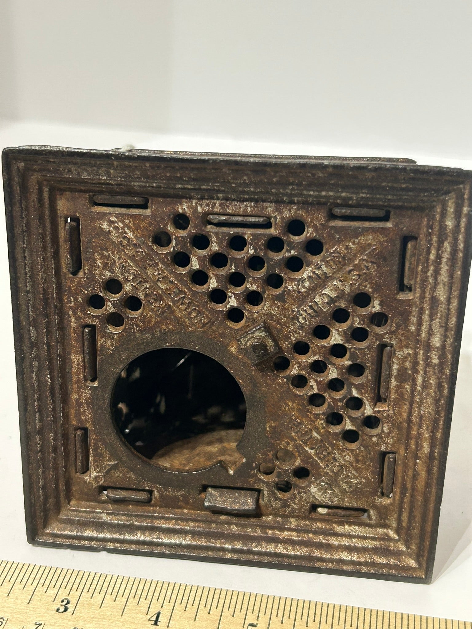 ANTIQUE COLUMBIA IRON BANK 6" TALL X 4 1/2" WIDE X 4 1/2" DEEP. CALL OR TEXT FOR MORE INFORMATION
