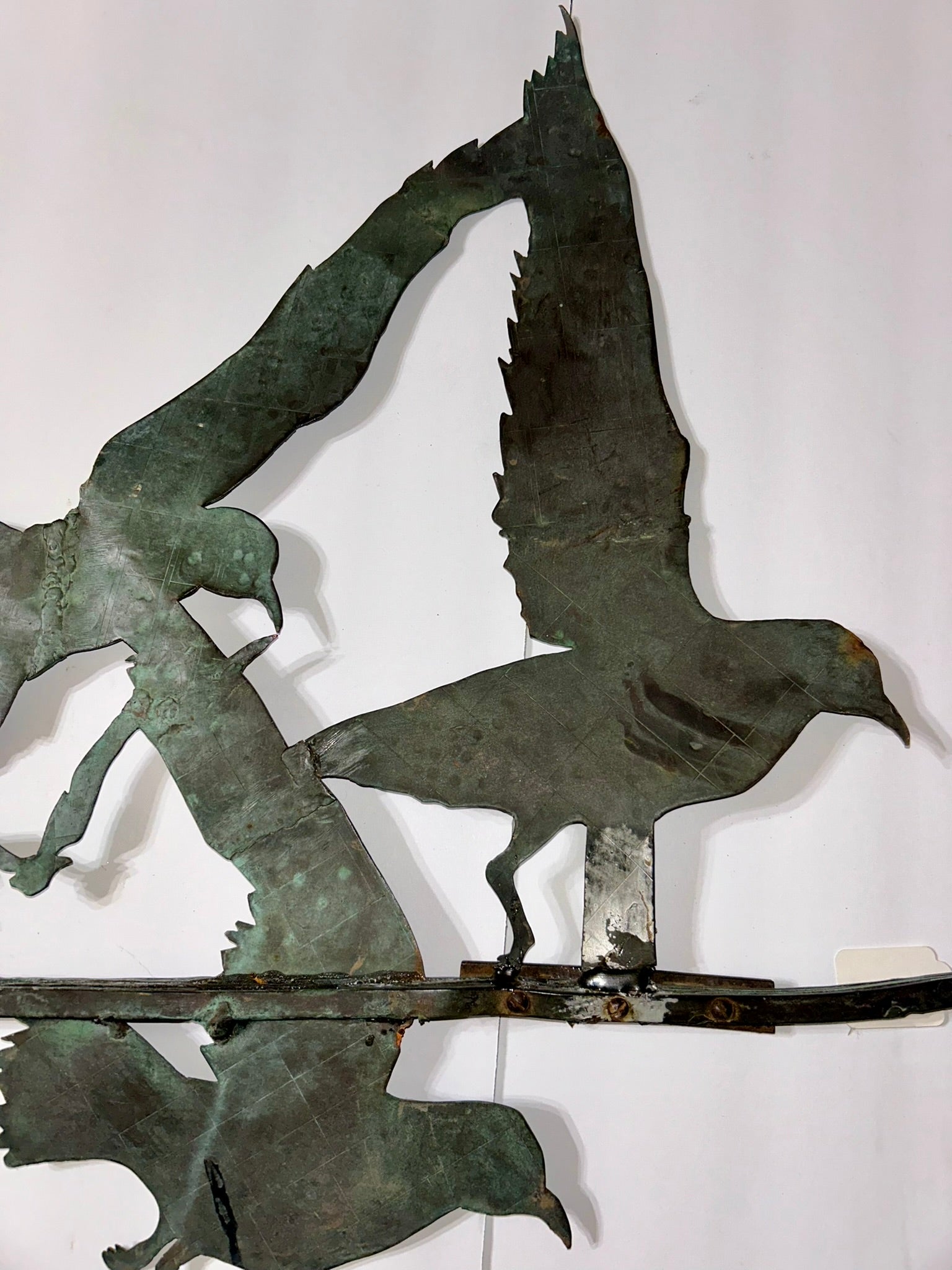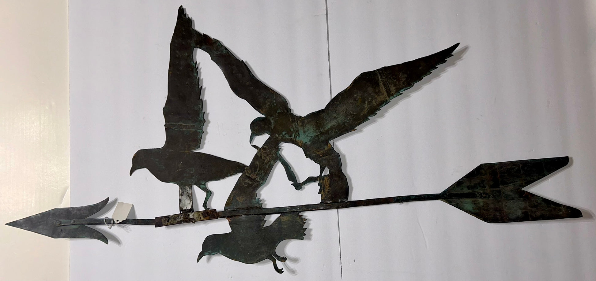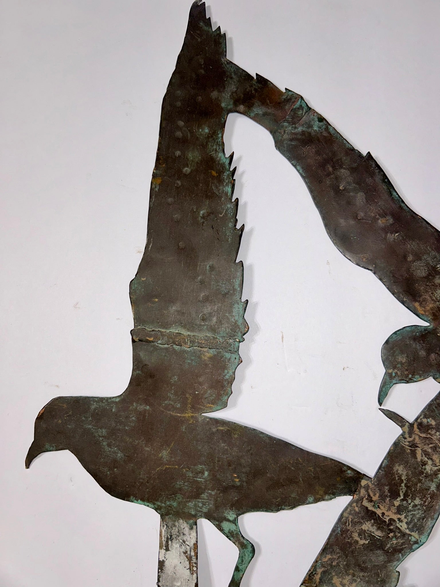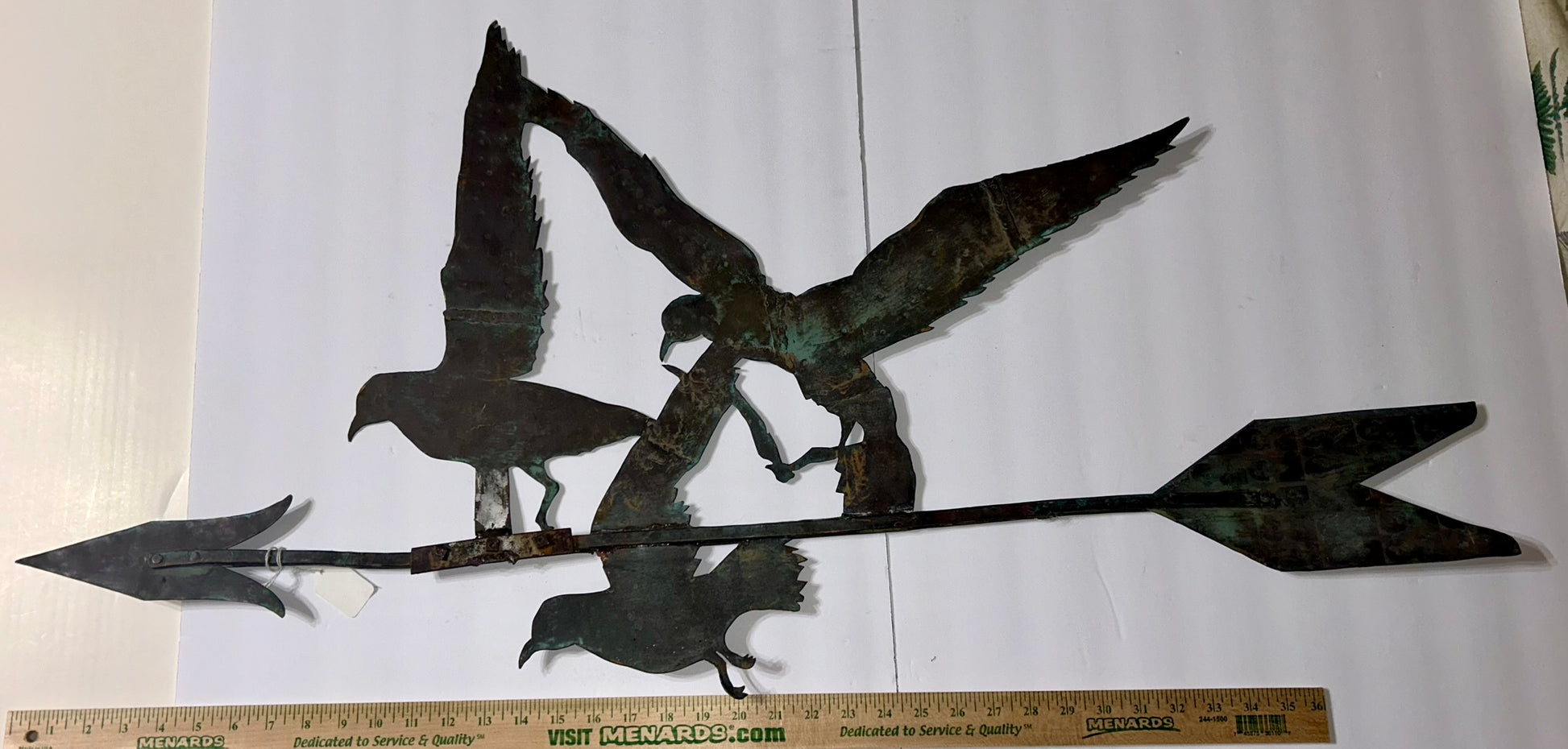 ANTIQUE BIRDS VANE HANDMADE OF OLD COPPER PRINTING SHEETS BY A CUSTODIAN AT A CONCORDIA KANSAS CATHOLIC SCHOOL, IT IS 41" LONG X 21" TALL. CALL OR TEXT FOR MORE INFORMATION AND MENTION VANE #17