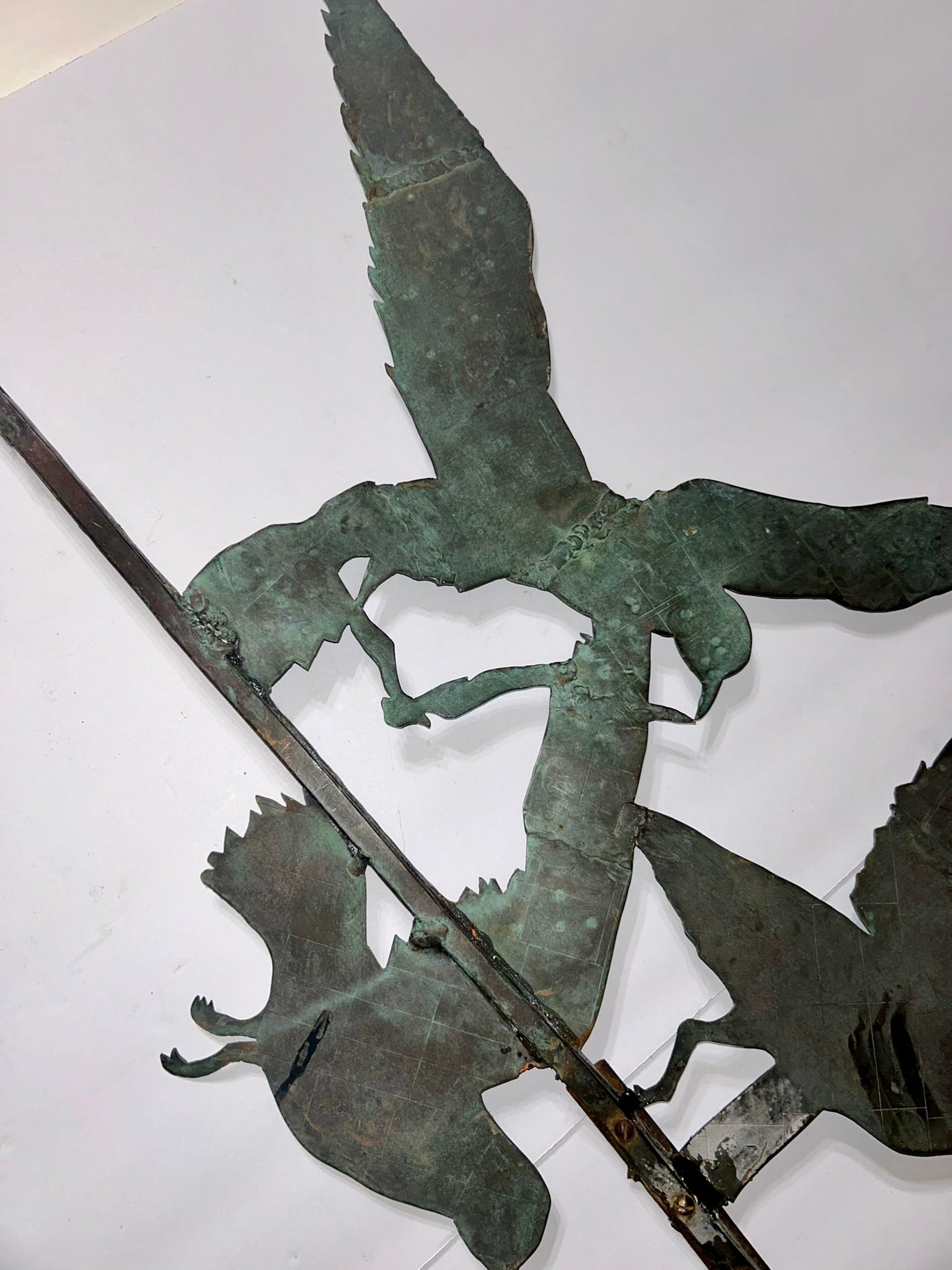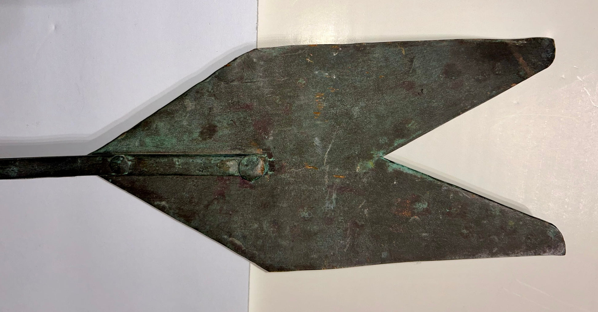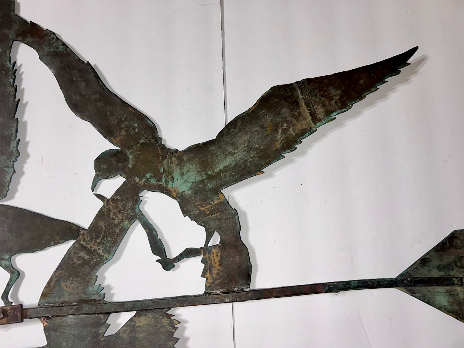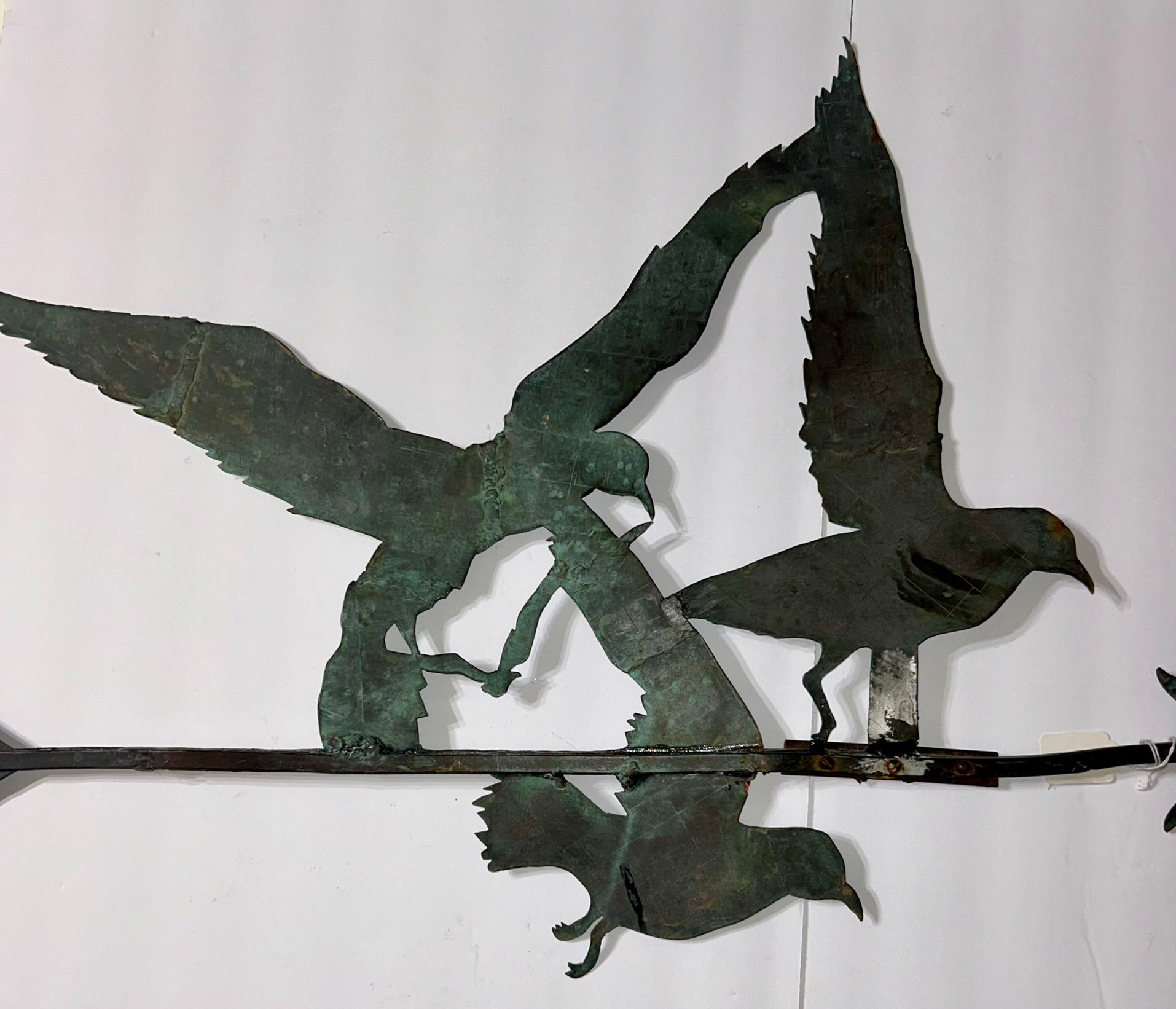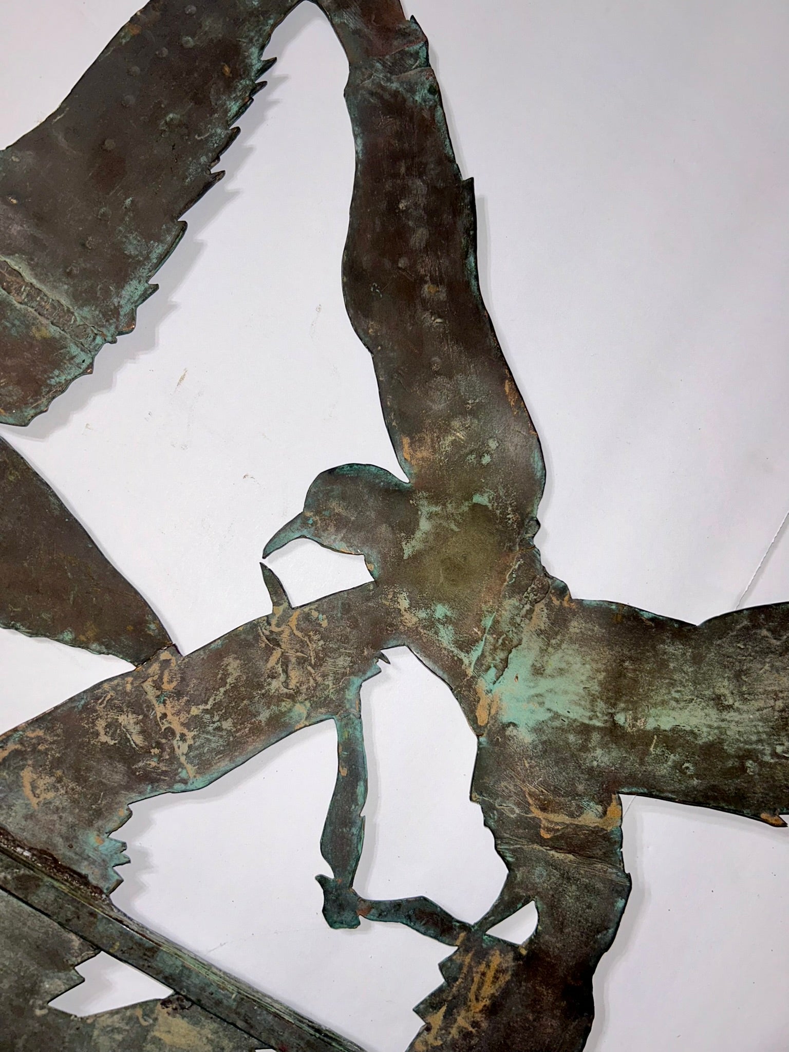 ANTIQUE BIRDS VANE HANDMADE OF OLD COPPER PRINTING SHEETS BY A CUSTODIAN AT A CONCORDIA KANSAS CATHOLIC SCHOOL, IT IS 41" LONG X 21" TALL. CALL OR TEXT FOR MORE INFORMATION AND MENTION VANE #17
