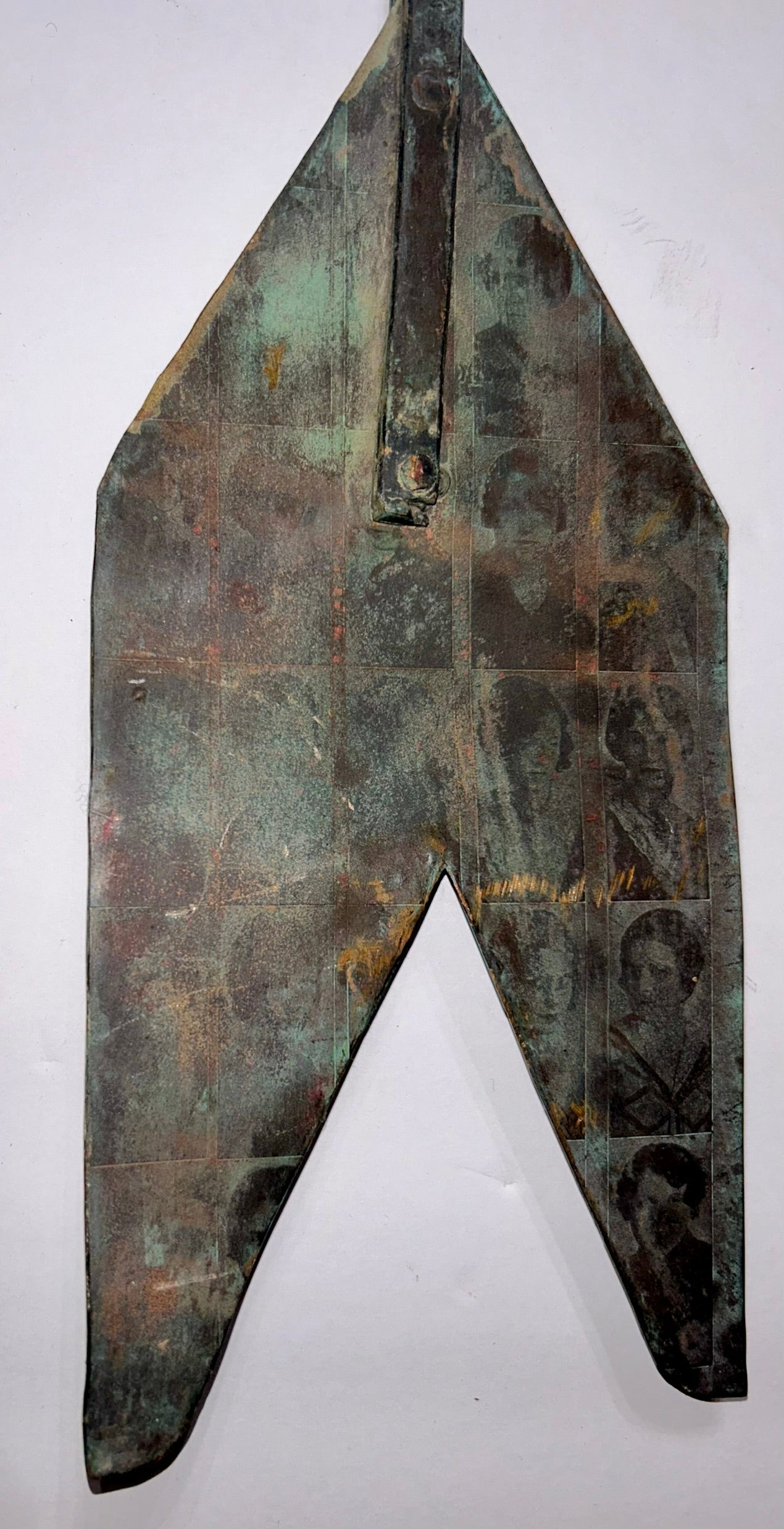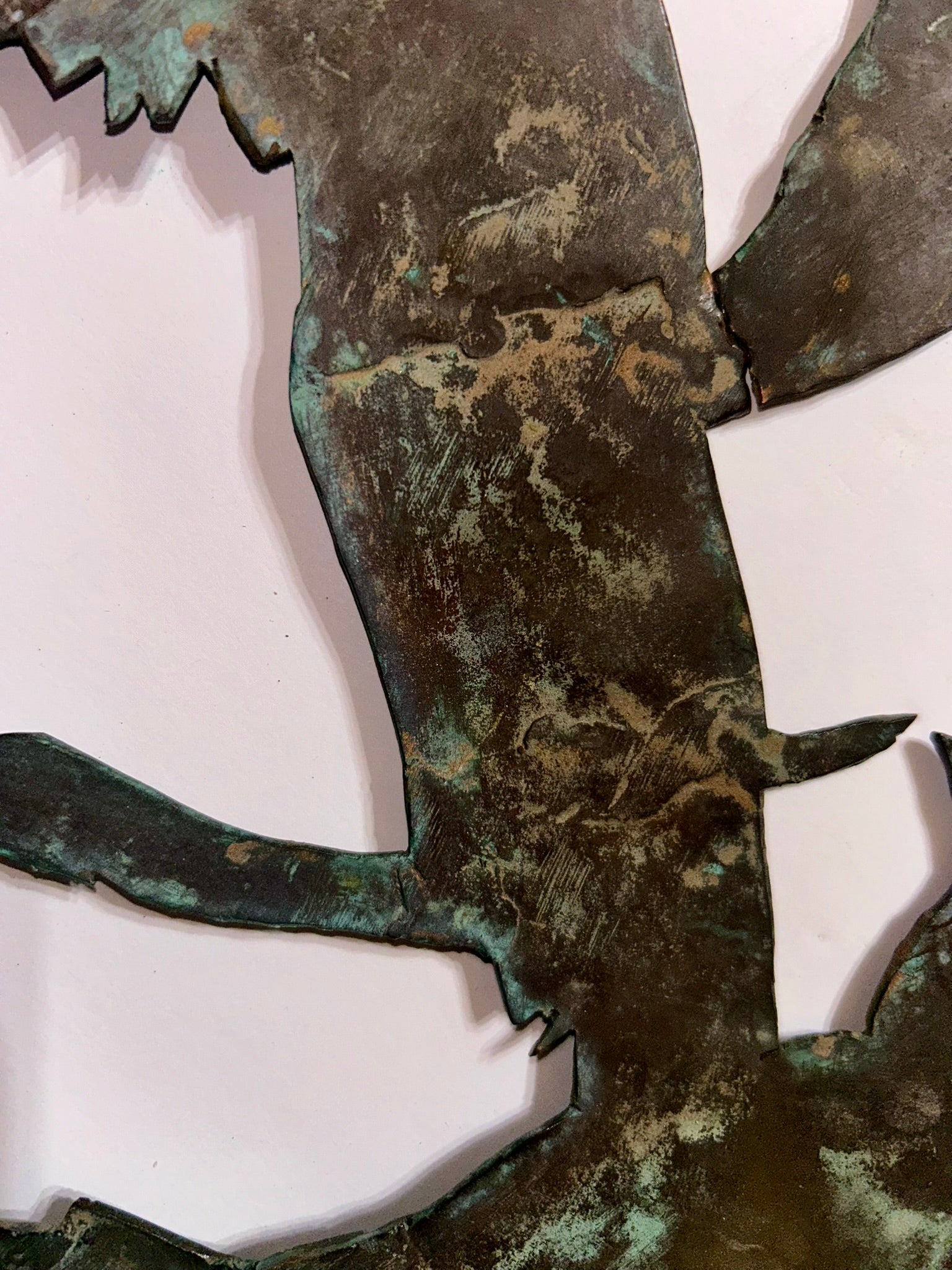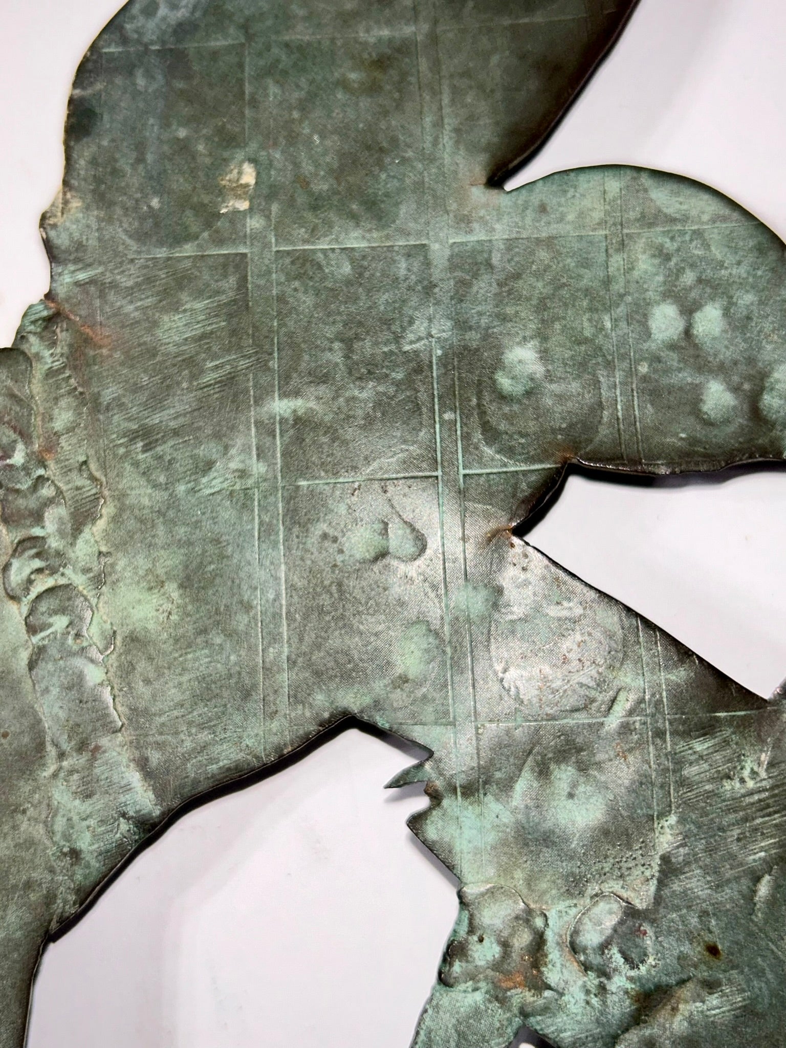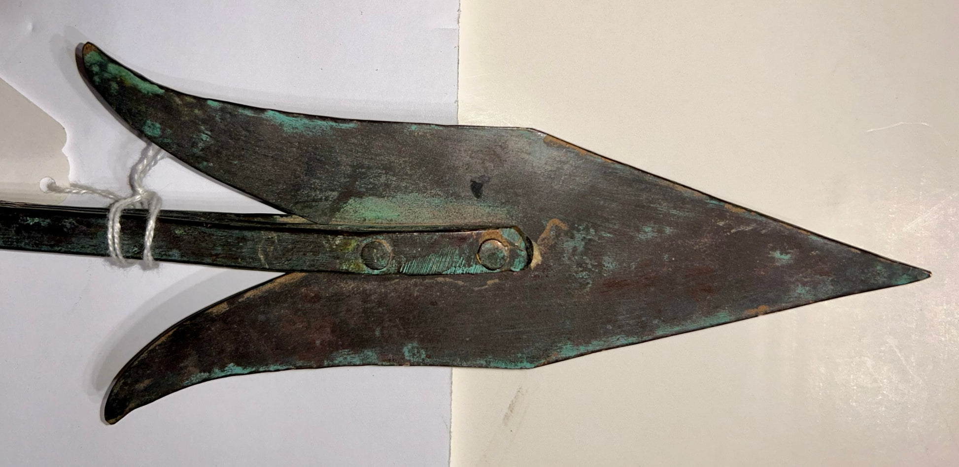 ANTIQUE BIRDS VANE HANDMADE OF OLD COPPER PRINTING SHEETS BY A CUSTODIAN AT A CONCORDIA KANSAS CATHOLIC SCHOOL, IT IS 41" LONG X 21" TALL. CALL OR TEXT FOR MORE INFORMATION AND MENTION VANE #17