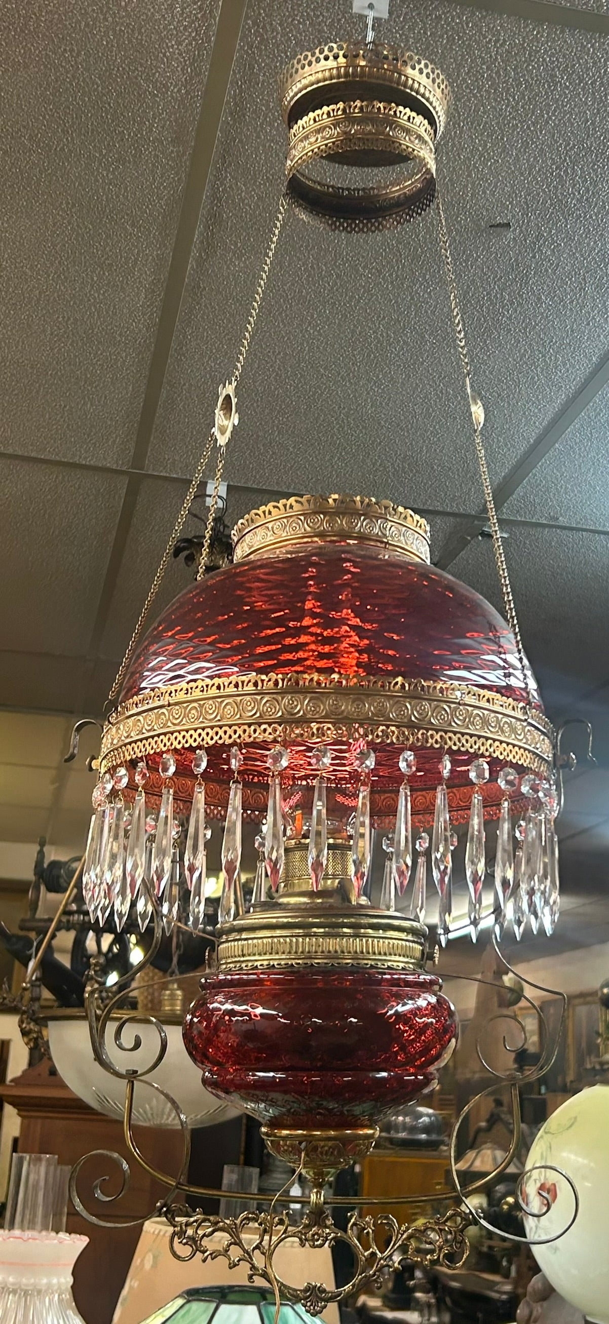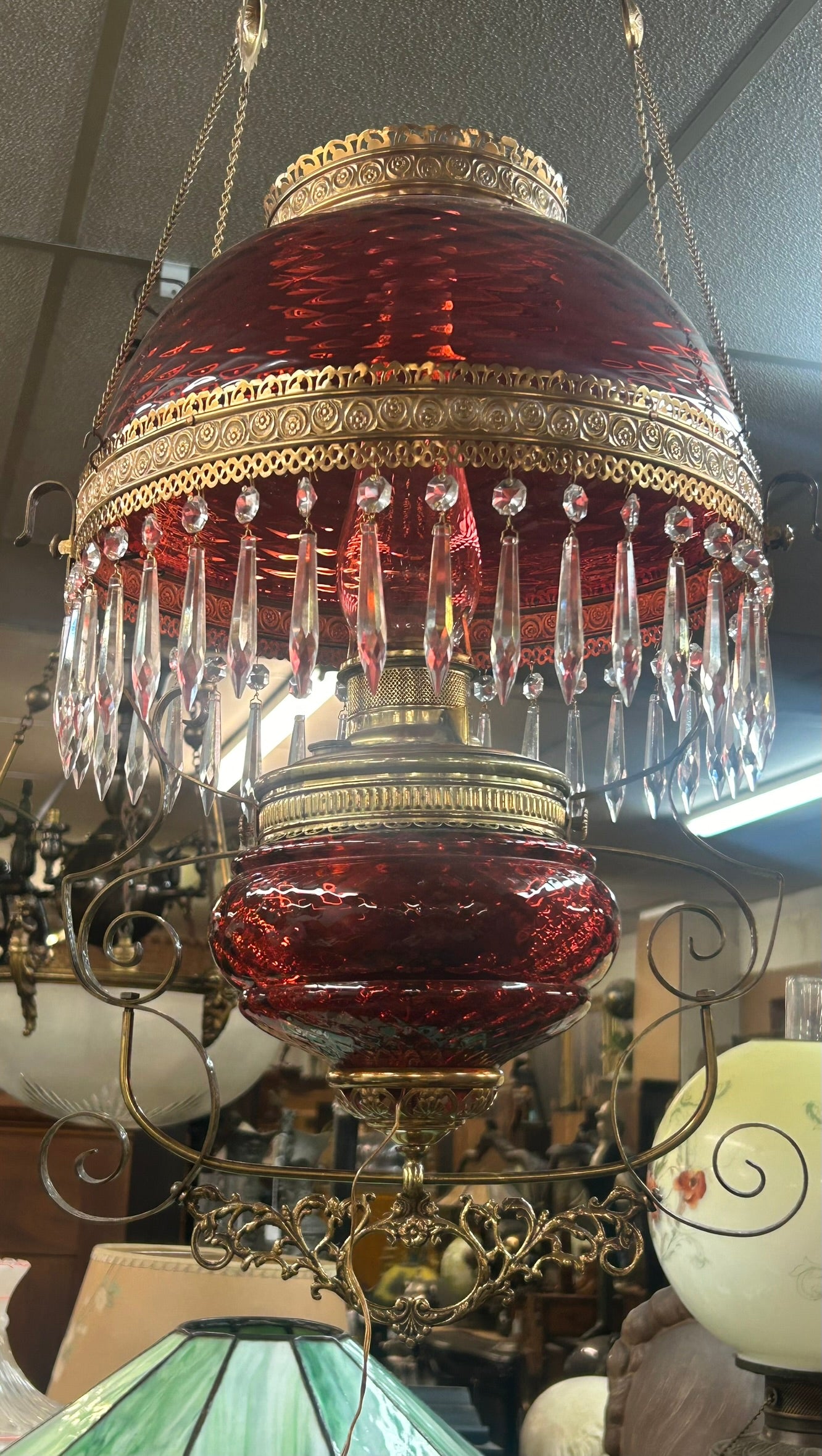 ANTIQUE CRANBERRY GLASS FOUNT AND SHADE HANGING LIBRARY LAMP WITH 17" DIA. SHADE, BEAUTIFUL PATTERN. CALL, TEXT, OR E-MAIL FOR MORE INFORMATION
