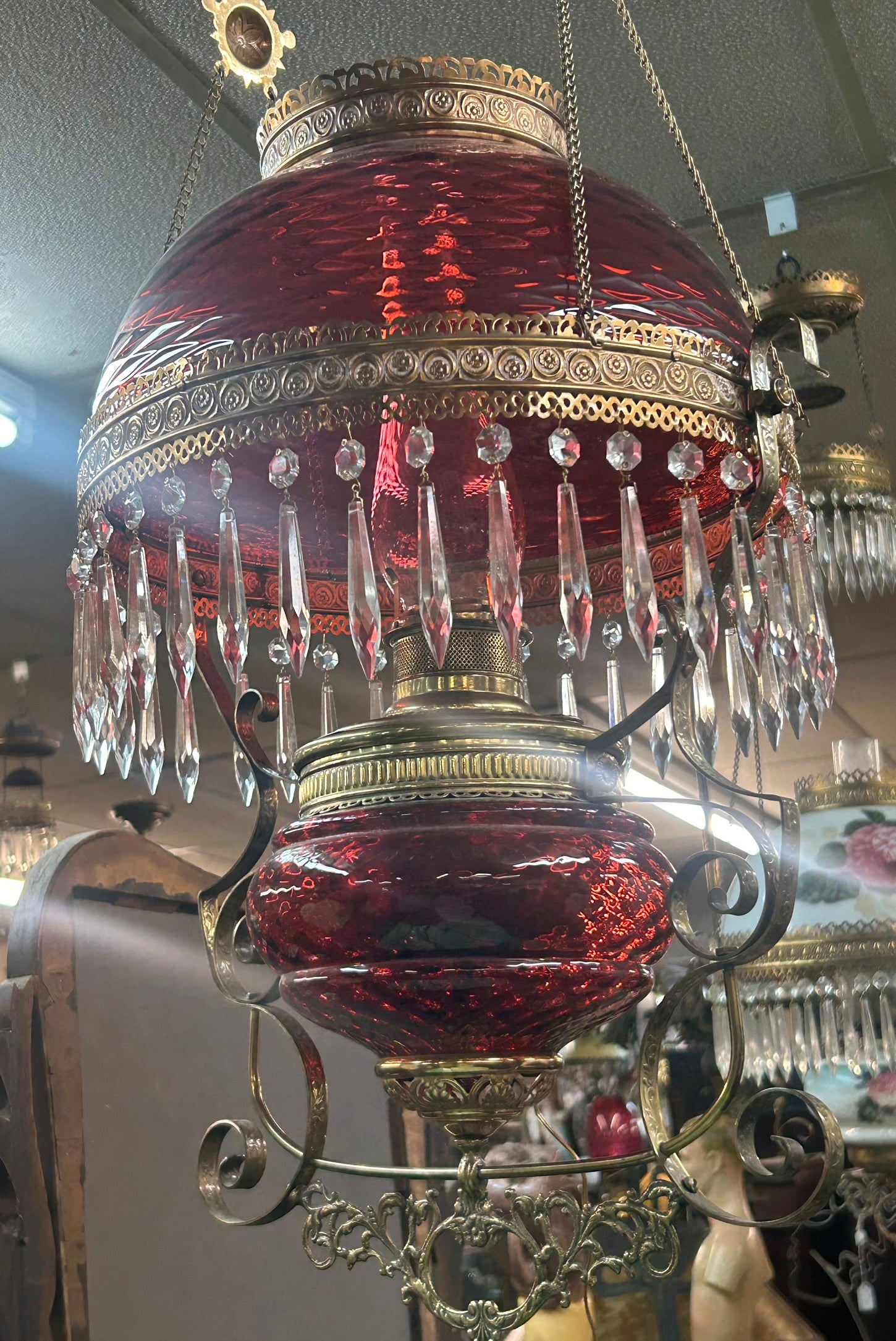 ANTIQUE CRANBERRY GLASS SHADE AND FOUNT HANGING LIBRARY LAMP